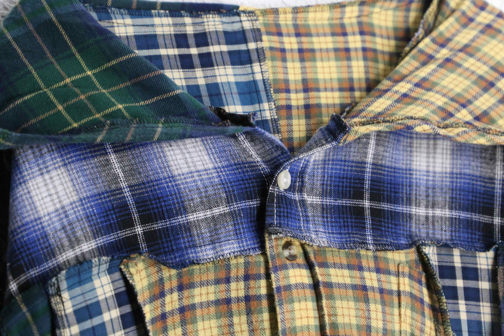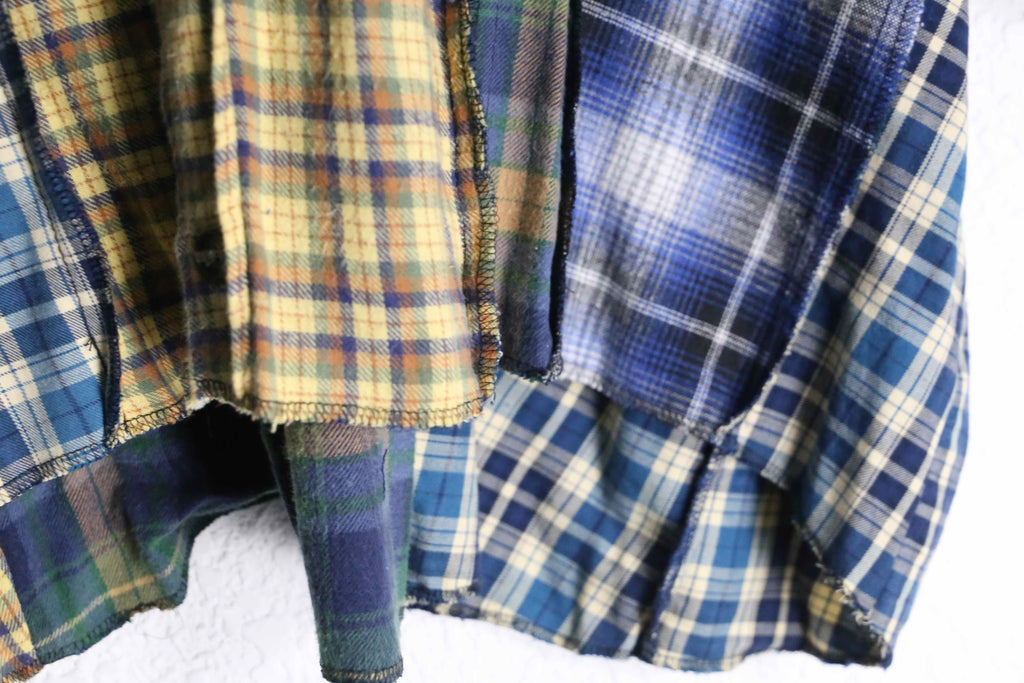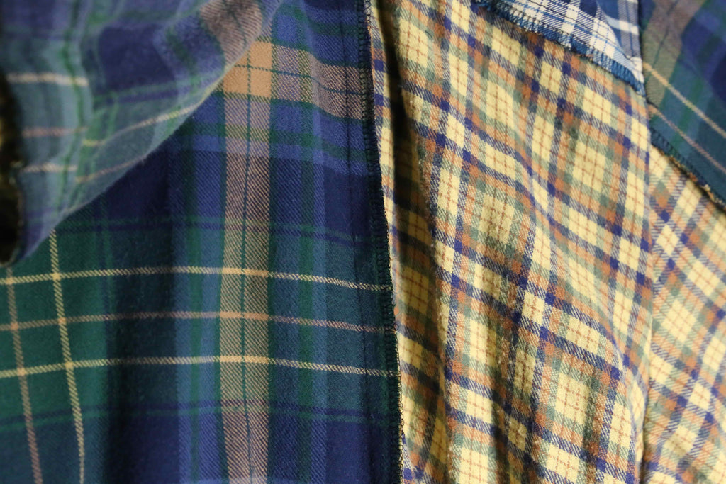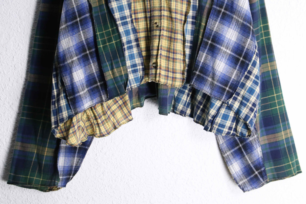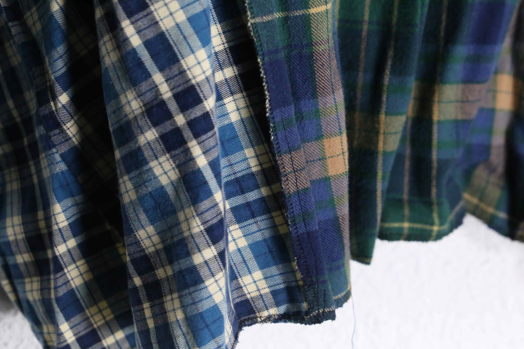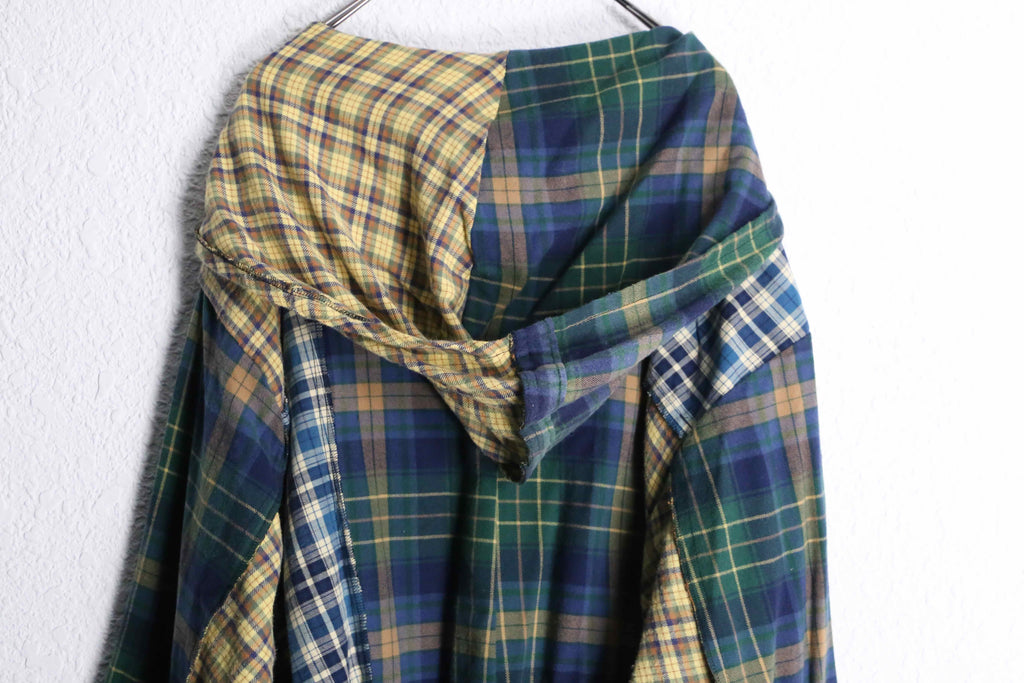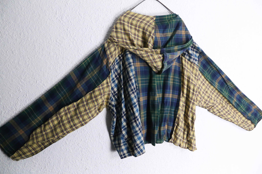 異なるチェック柄を組み合わせたデザインで、見る角度によって雰囲気が変わるのがポイント。ゆったりめのオーバーサイズシルエットで、羽織るだけで今っぽい着こなしになります。裾は少しラフなカットで、こなれた印象に。ボタンで開け閉めできるので羽織としても使えます。