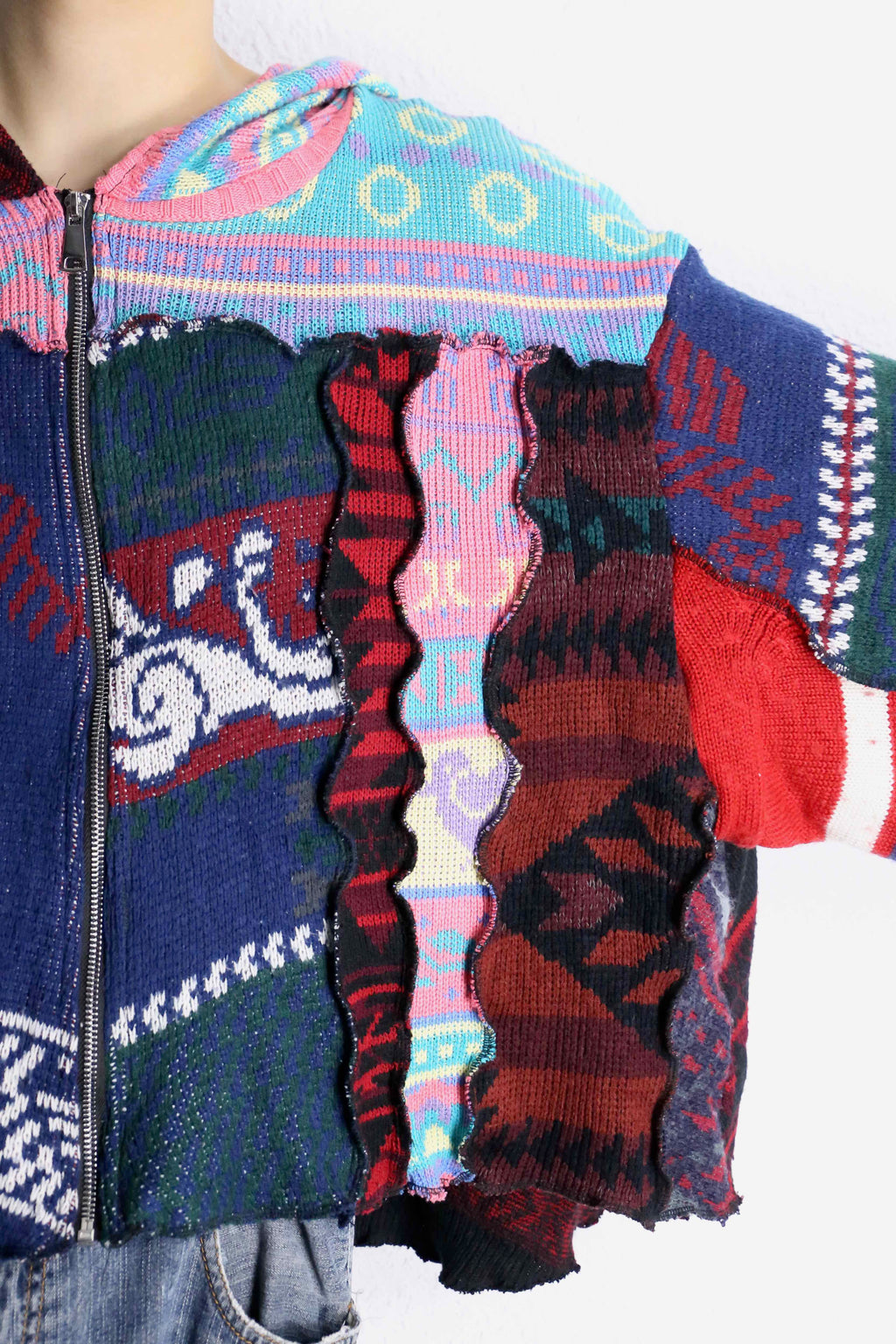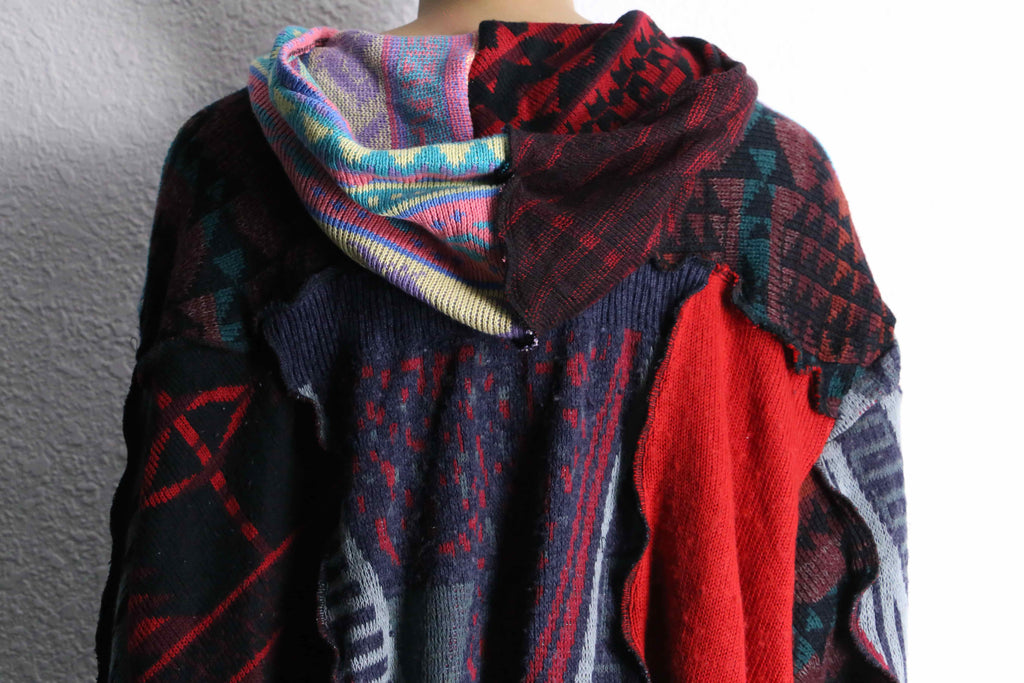 存在感たっぷりの総柄デザインが目を惹く、フード付きニットカーディガンがオンラインに入荷。