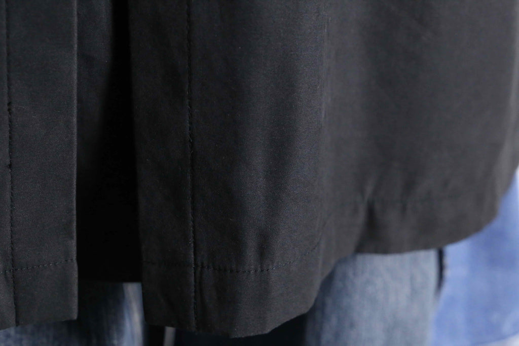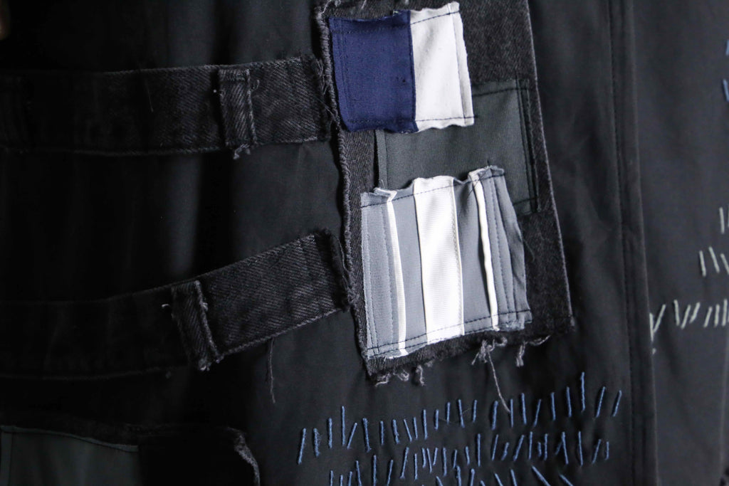 ブラックベースに異素材、異柄の生地を大胆に配置し、手書き風ステッチを散りばめることで、どこから見ても存在感のある仕上がり。ゆったりとしたシルエットで、インナーを選ばず季節の変わり目にも活躍。1枚でスタイリングが完成する主役級アイテム。