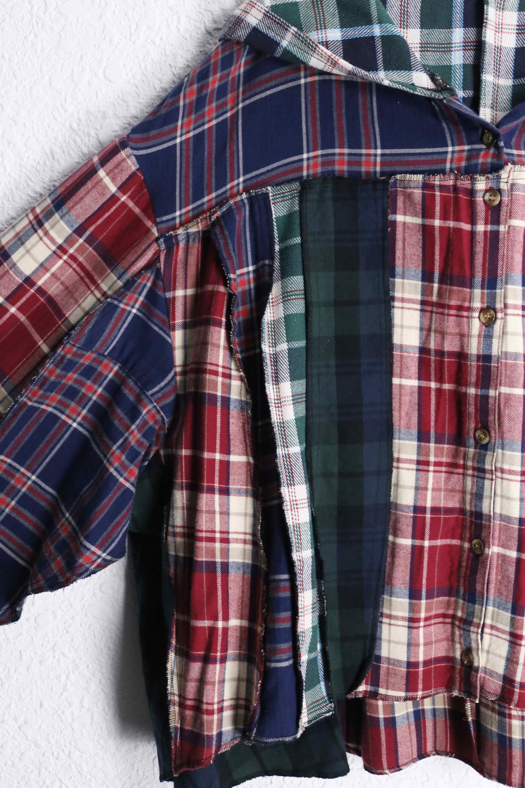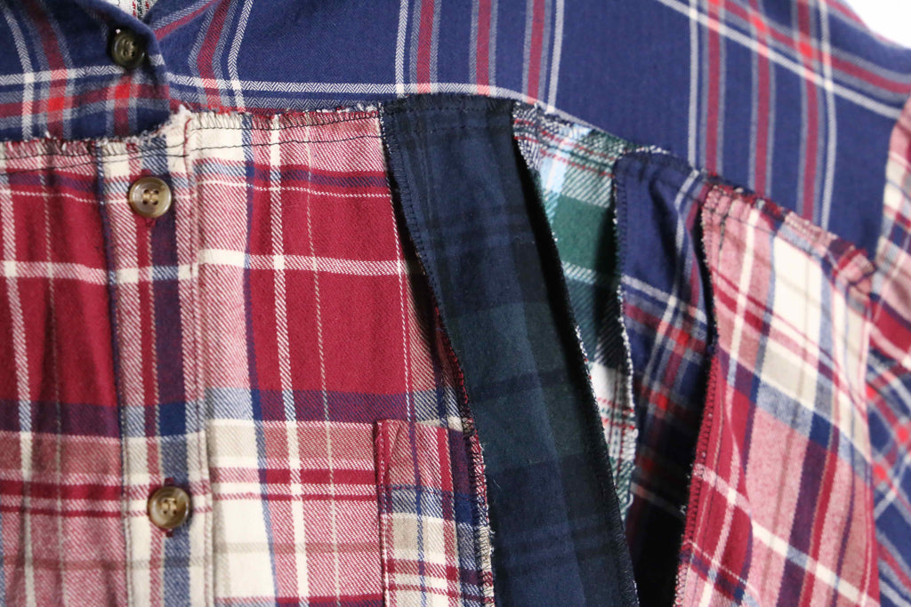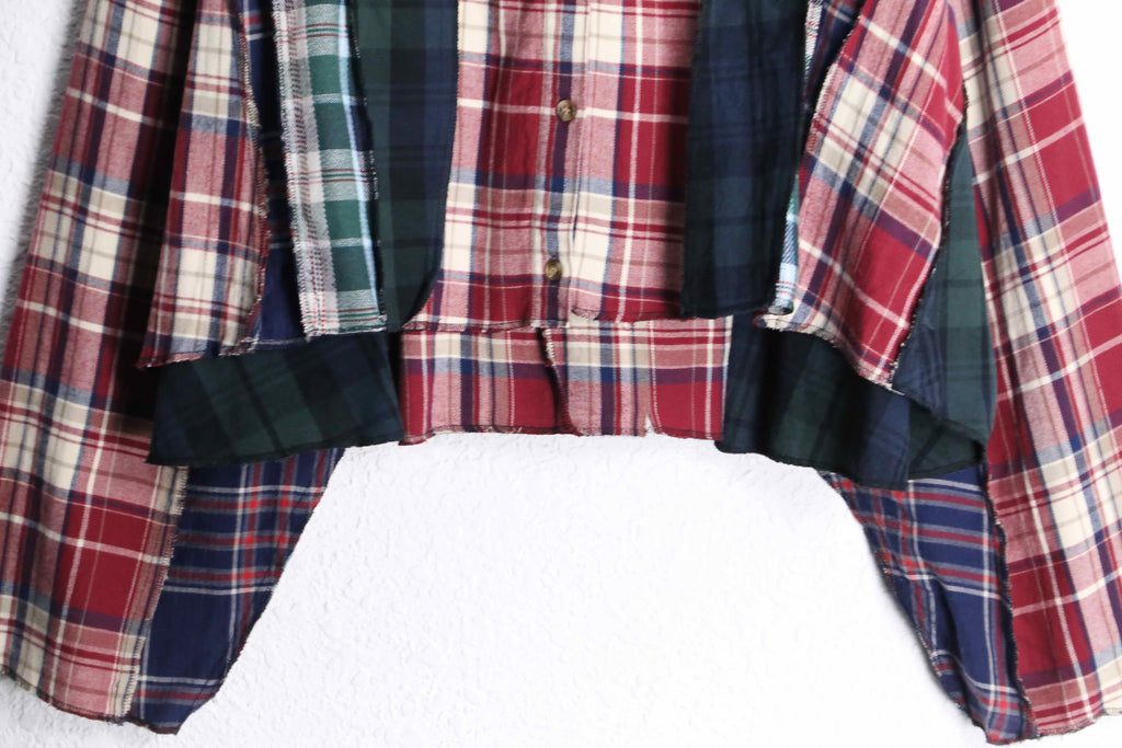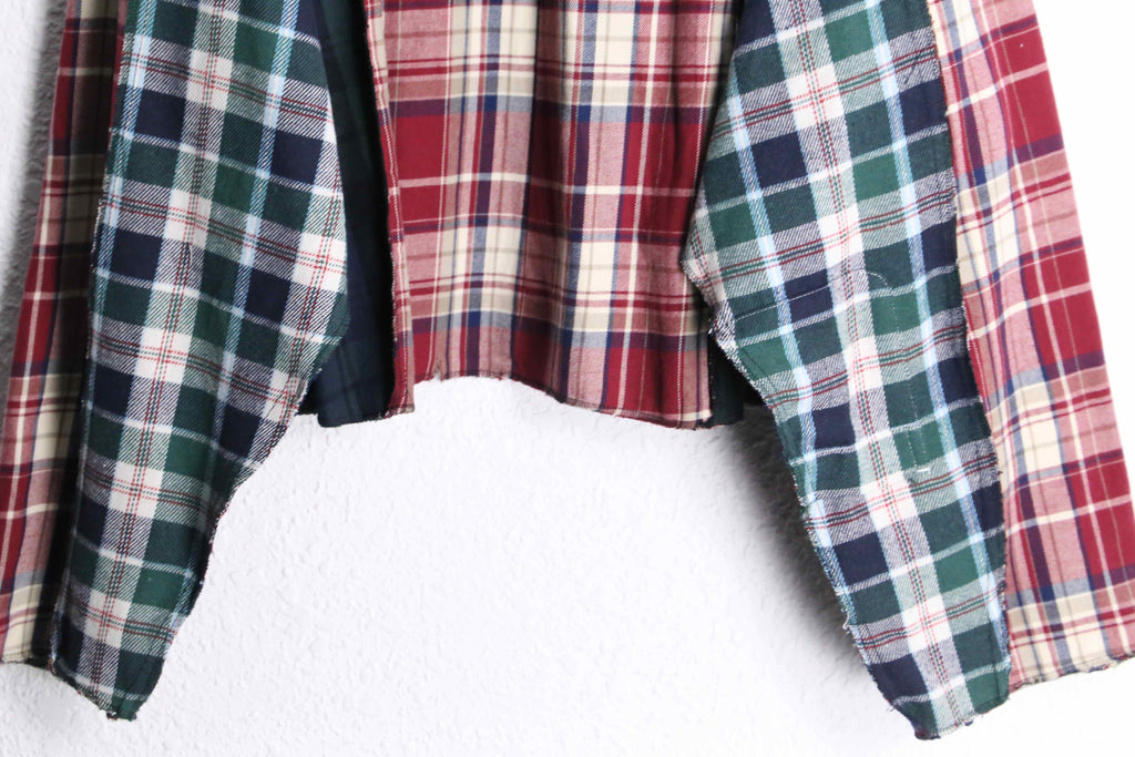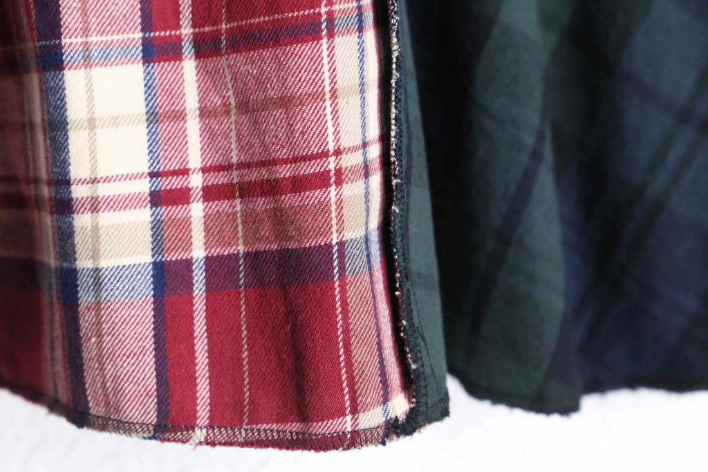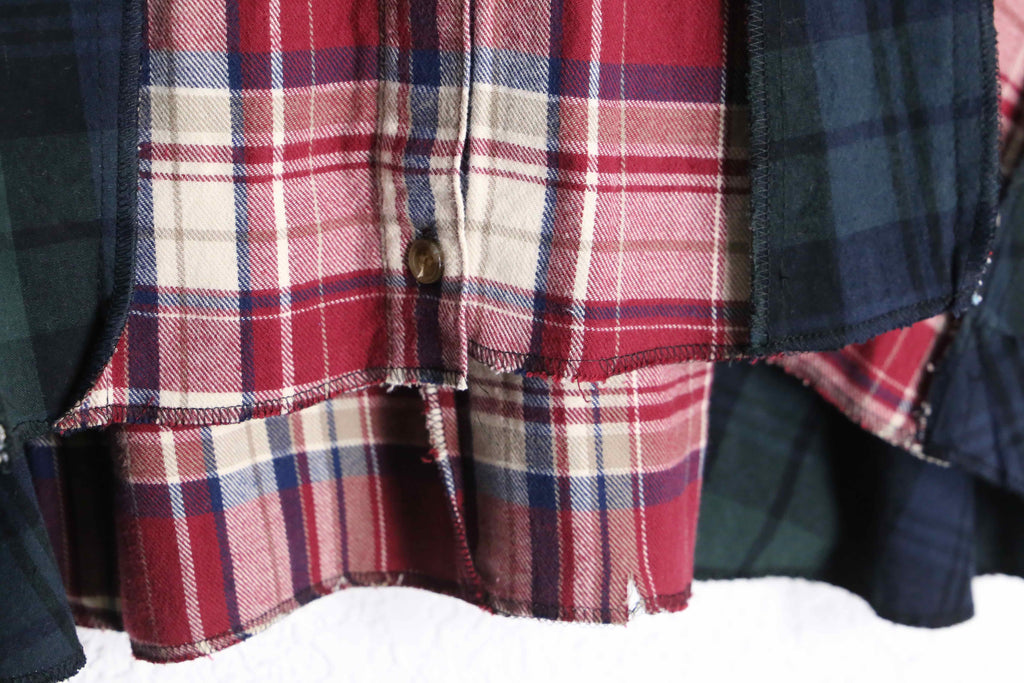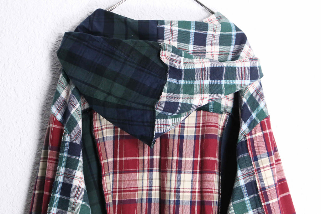 異なるチェック柄を組み合わせたデザインで、見る角度によって雰囲気が変わるのがポイント。ゆったりめのオーバーサイズシルエットで、羽織るだけで今っぽい着こなしになります。裾は少しラフなカットで、こなれた印象に。ボタンで開け閉めできるので羽織としても使えます。