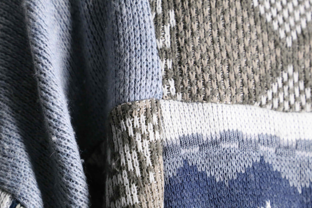 様々な柄のニットを組み合わせていますが、色合いなど統一しているため、まとまって落ち着いた印象の一着。シルエットはゆったりとしていて珍しいことにニットで なのに袖口が広がってる形。リメイクでしか出せない特殊なシルエットがより個性的で唯一無二を演出。