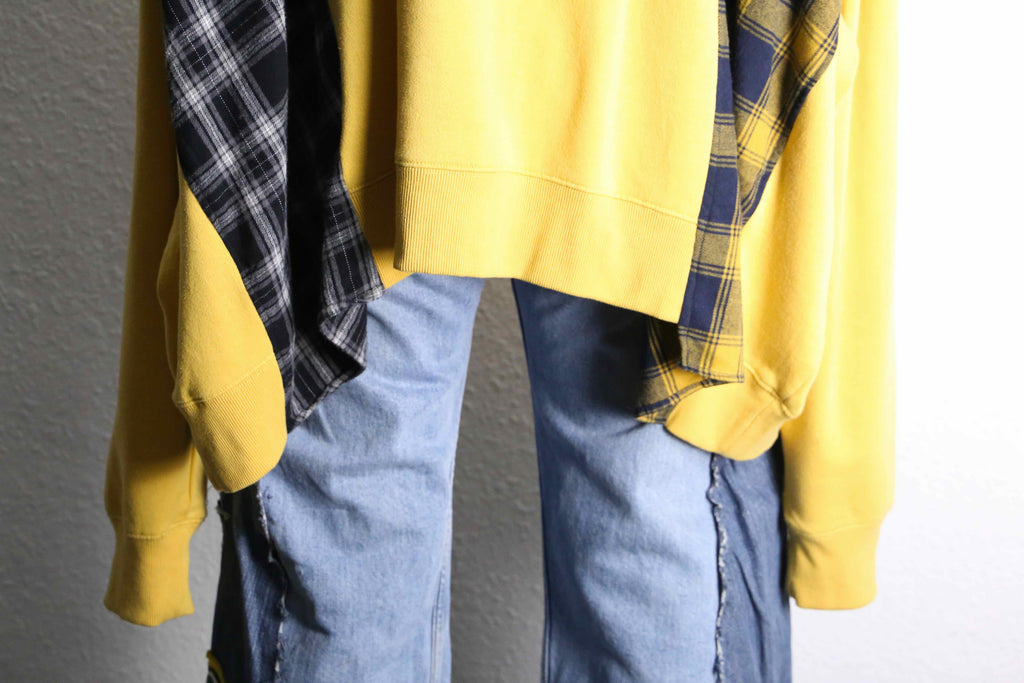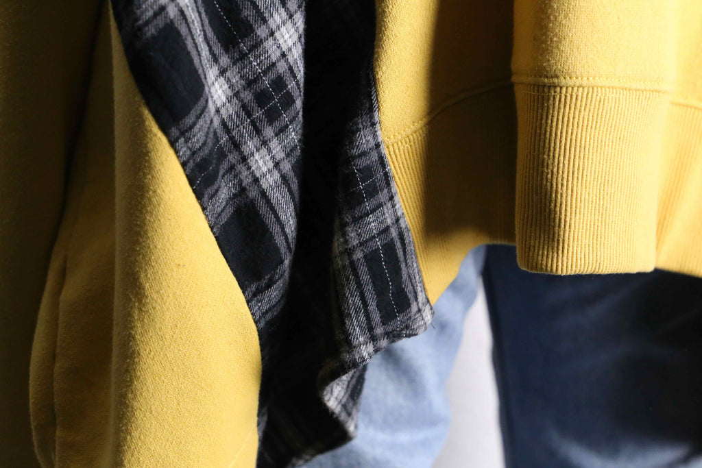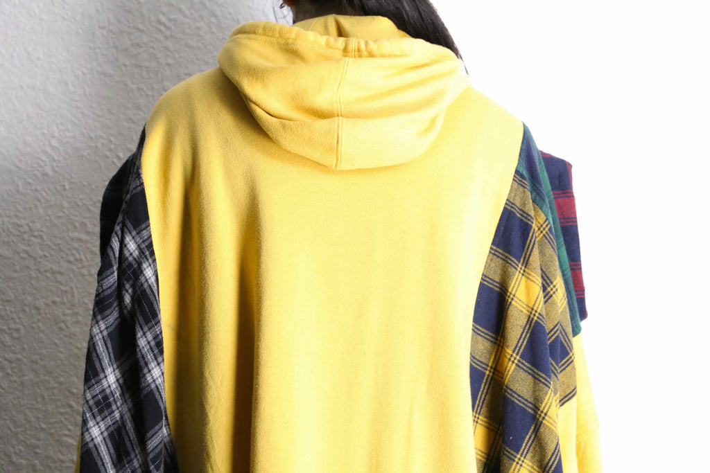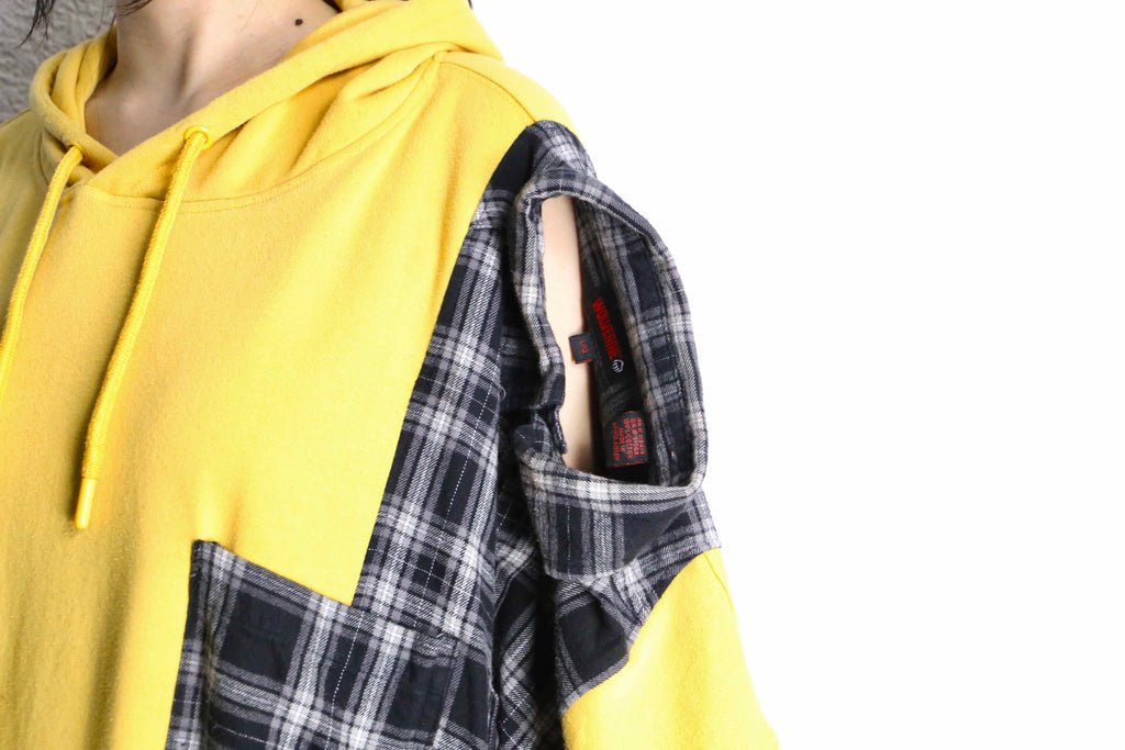 イエローボディにチェックのコントラストがポップさを引き立てるリメイクはフーディが入荷。