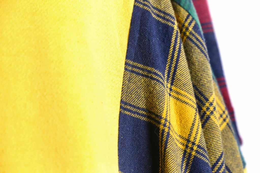 メインカラーにイエローを採用。サイドには、チェックのシャツをドッキングすることで、単色にならずにぱっと見でもインパクトのある仕上がりに。