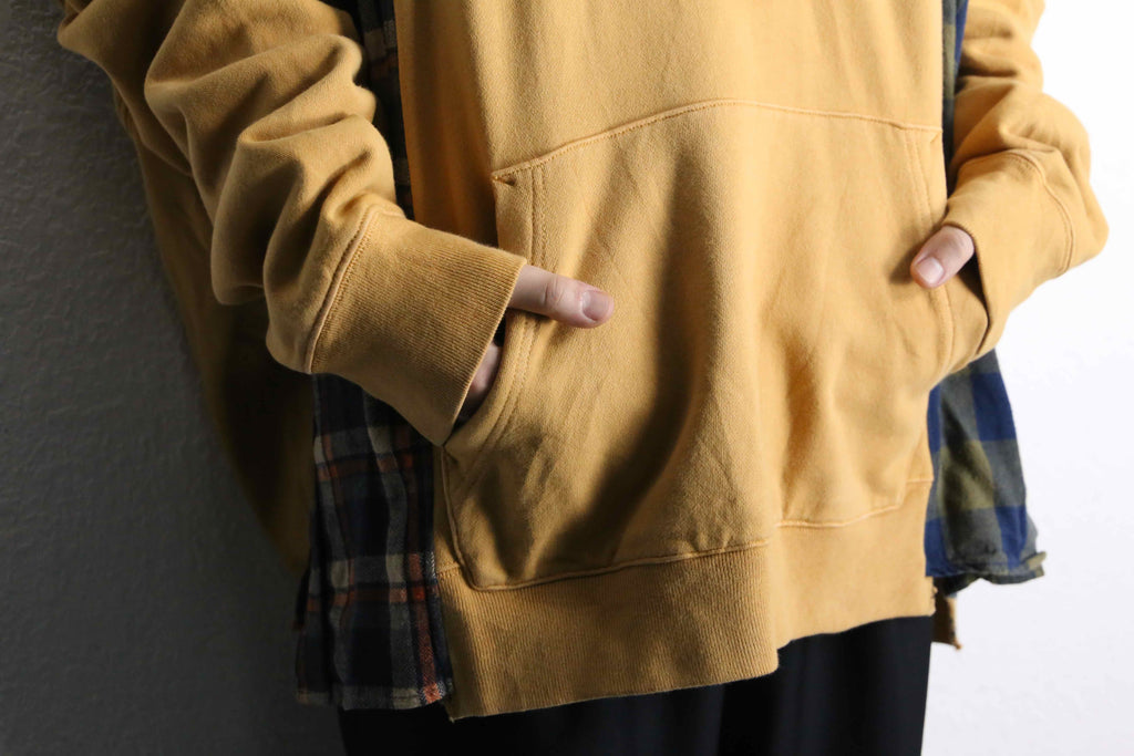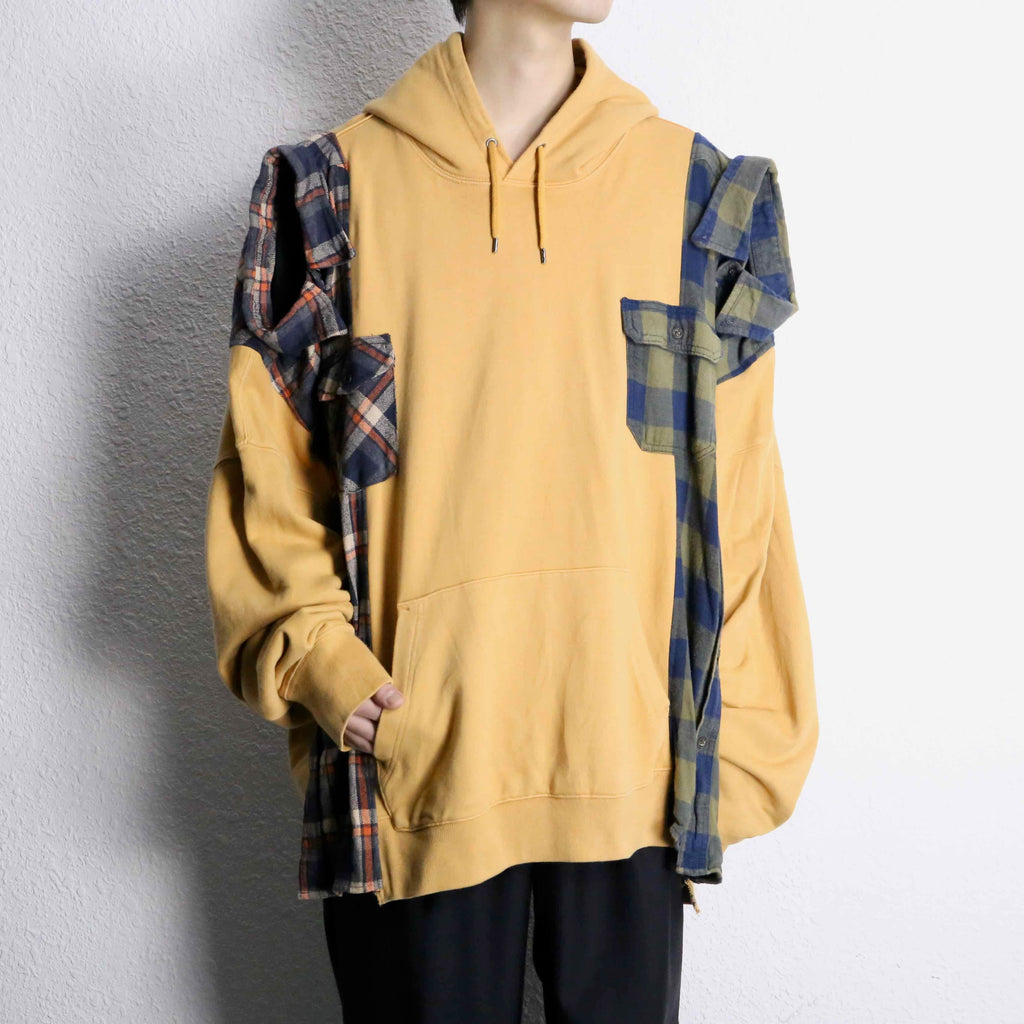 メインカラーにイエローを採用。サイドには、チェックのシャツをドッキングすることで、単色にならずにぱっと見でもインパクトのある仕上がりに。シルエット面では、サイドにドッキングしていることもあり当店が得意とするドルマン仕様に。