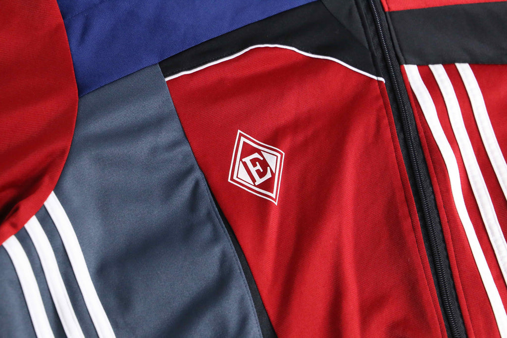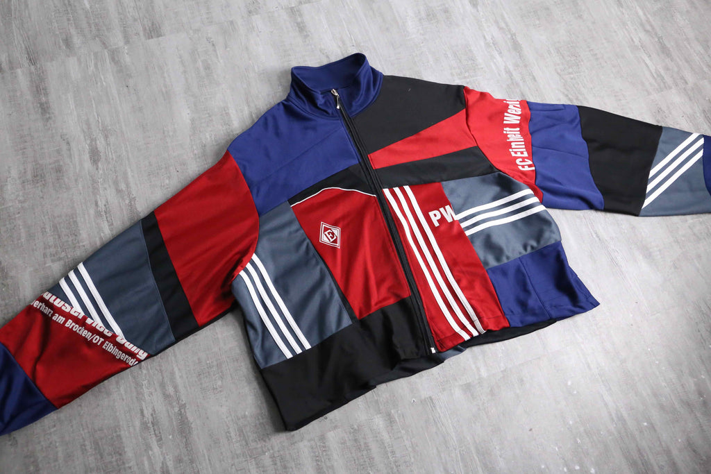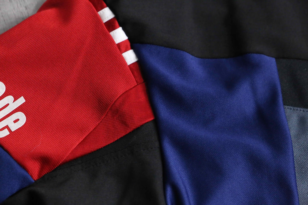 複数枚のトラックジャケットを一枚にまとめ上げ、リメイクの魅力溢れるデザインに。赤がベースで入ってる為派手名前ますが、ネイビーが入ることにより落ち着いたトラックジャケットと仕上がっています。