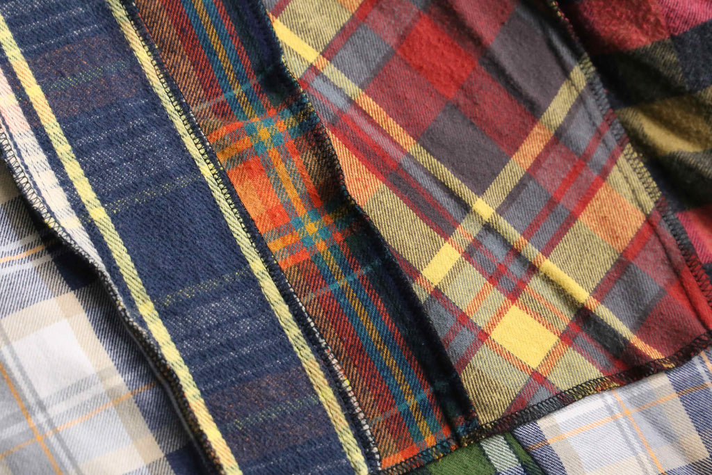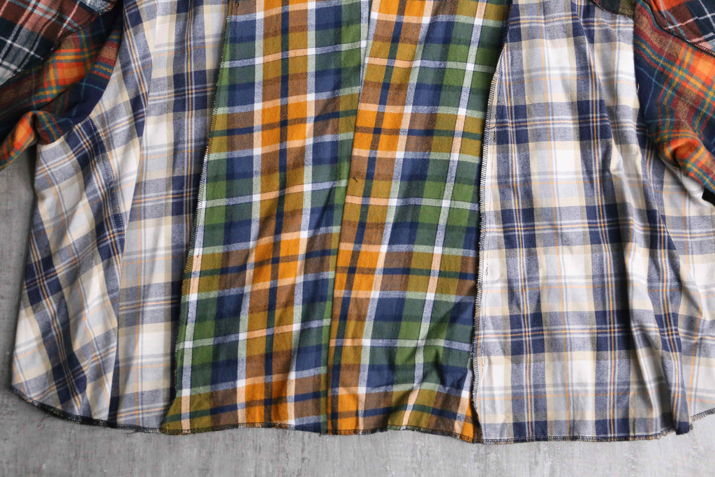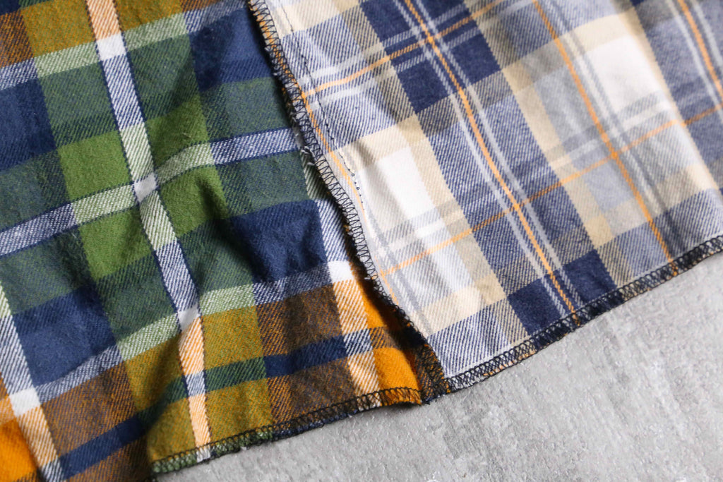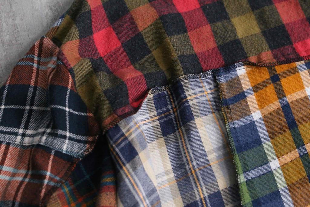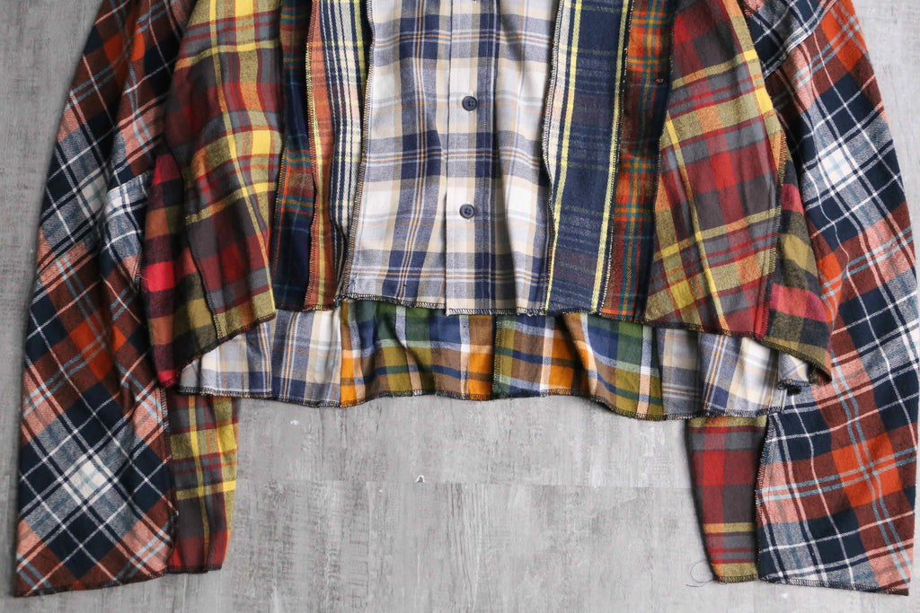 異なるチェック柄を組み合わせたデザインで、見る角度によって雰囲気が変わるのがポイント。ゆったりめのオーバーサイズシルエットで、羽織るだけで今っぽい着こなしになります。裾は少しラフなカットで、こなれた印象に。ボタンで開け閉めできるので羽織としても使えます。
