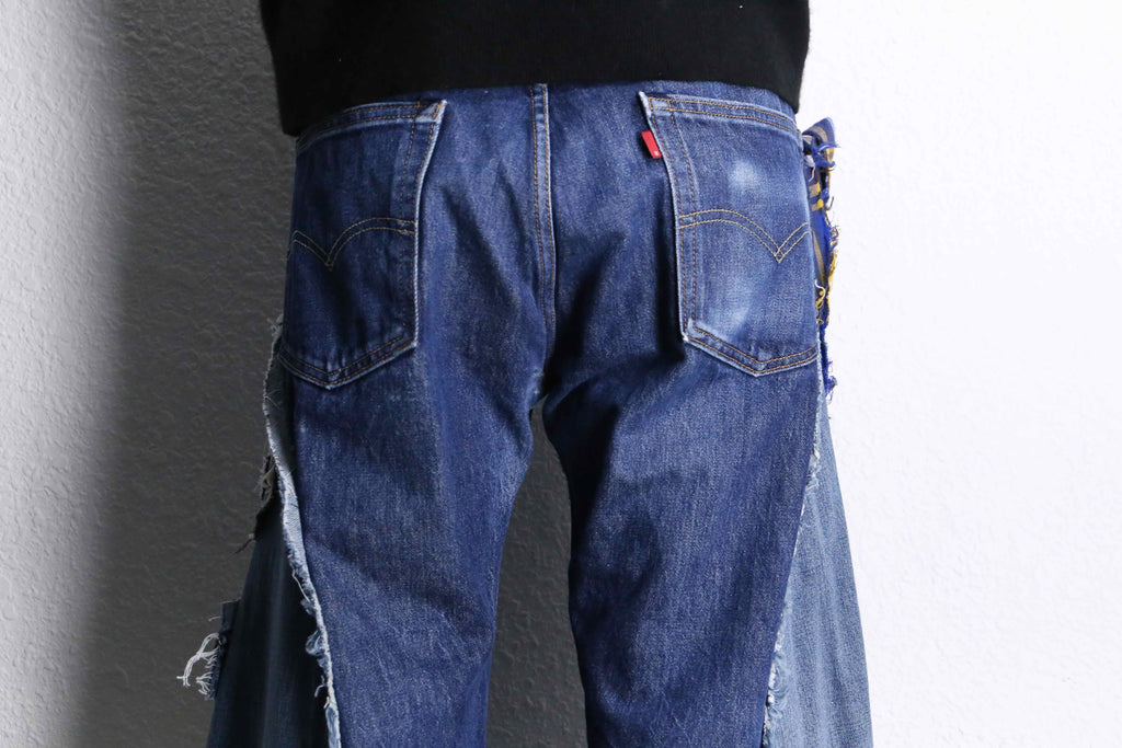 遊び心たっぷりの異素材パッチワークを大胆に組み合わせた、リメイクワイドデニムがオンラインに入荷。