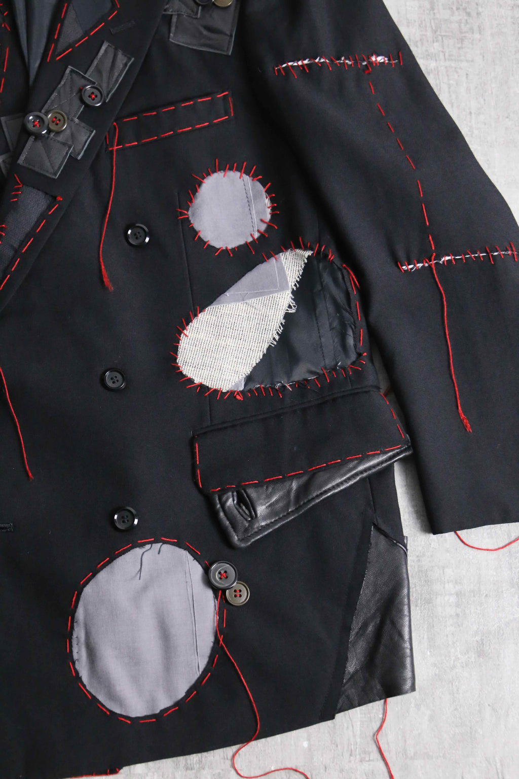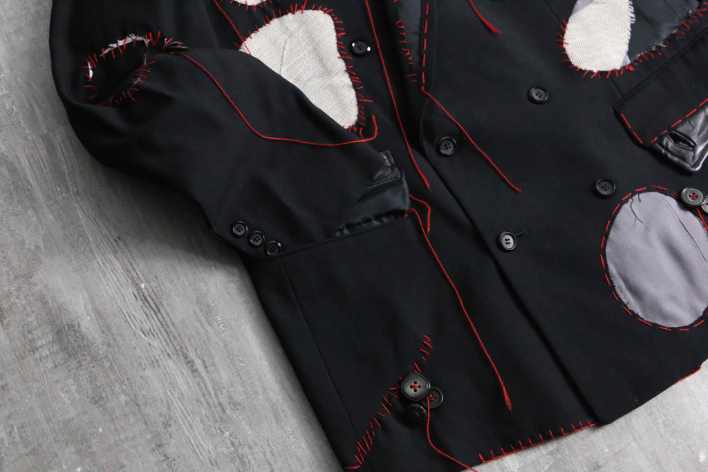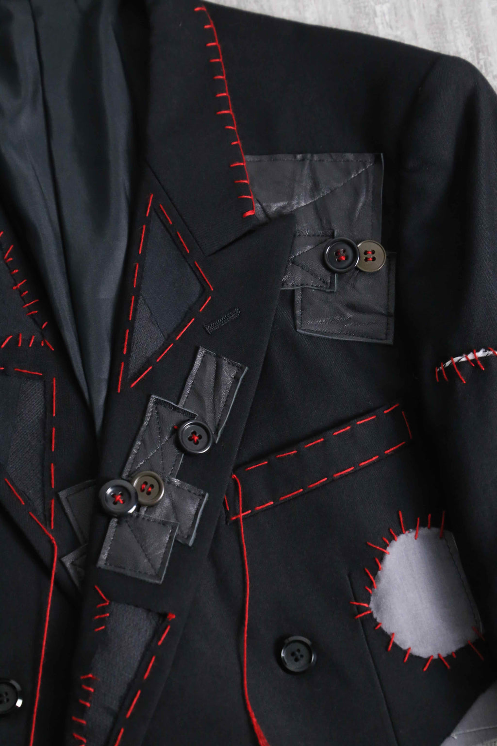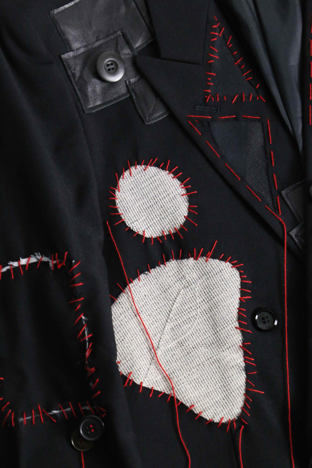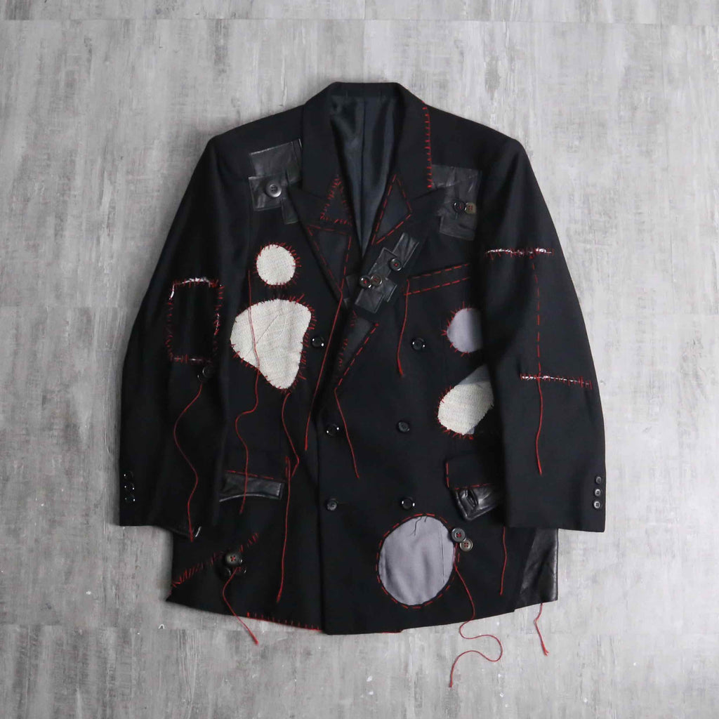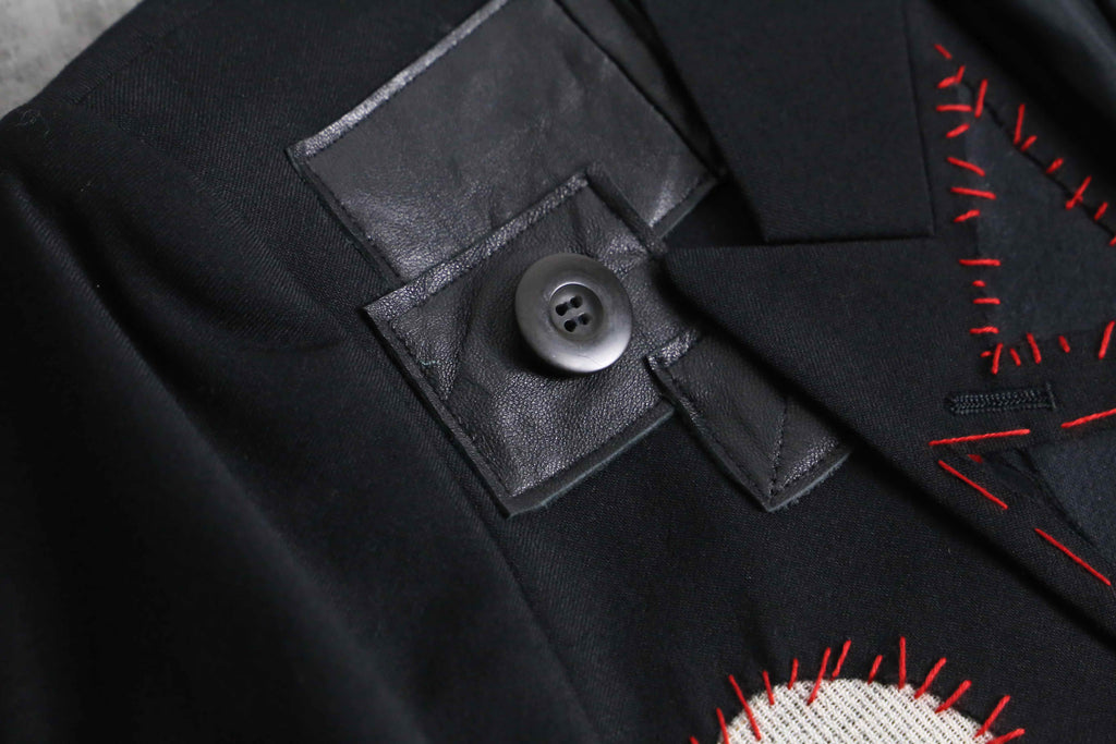 ベースにはシンプルなブラックジャケットを使用し、随所に異素材パッチやボタンを配置。