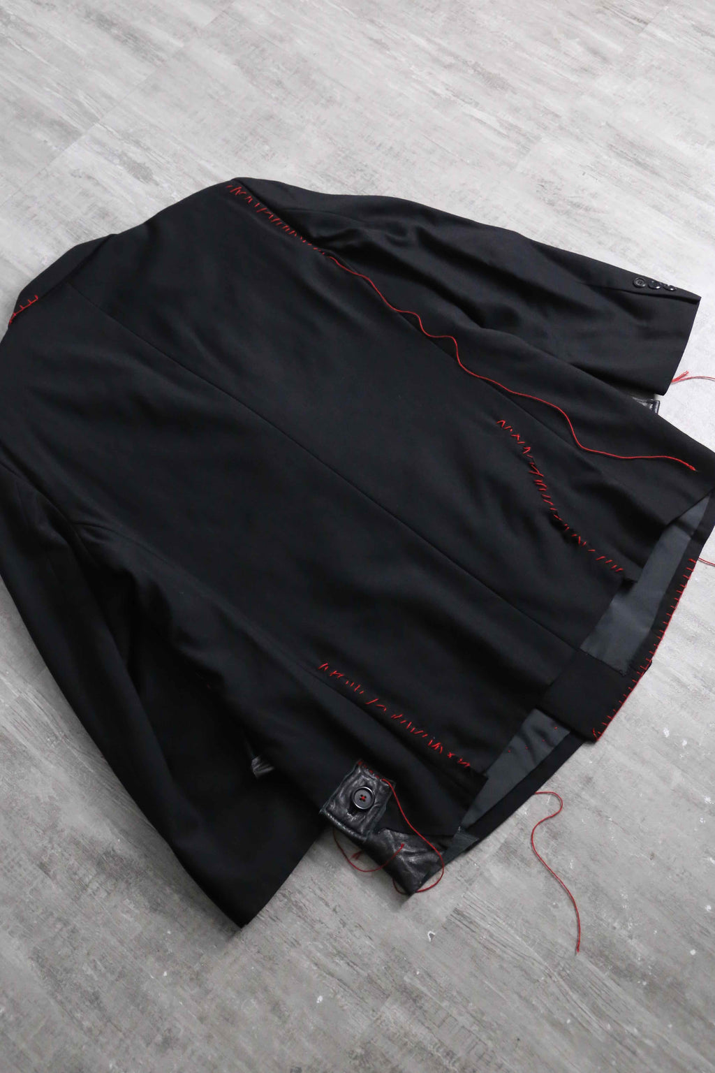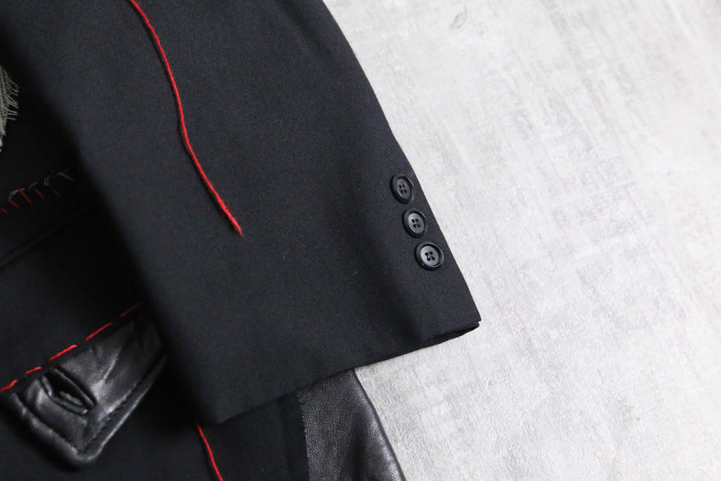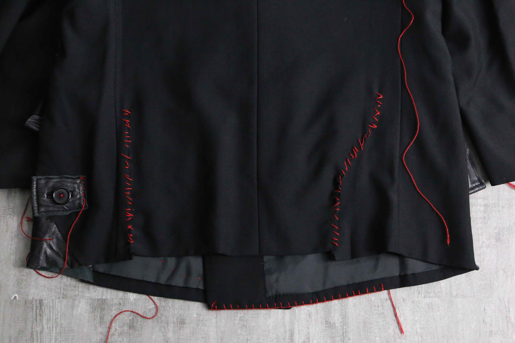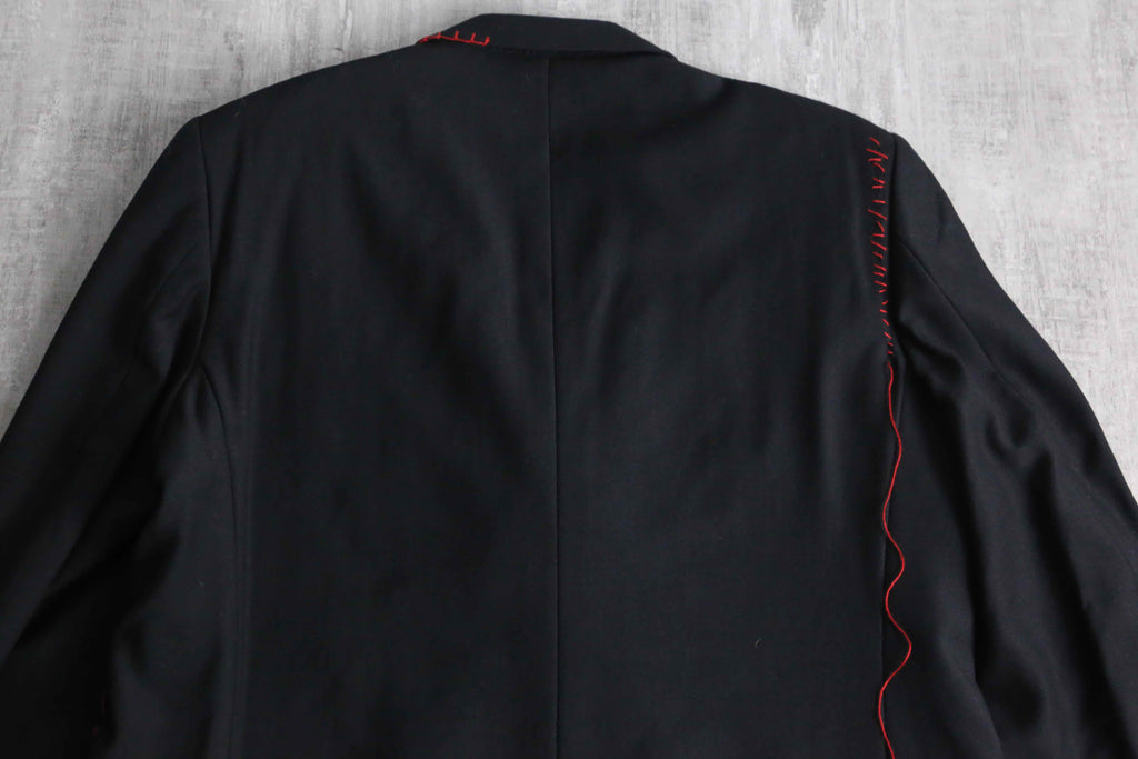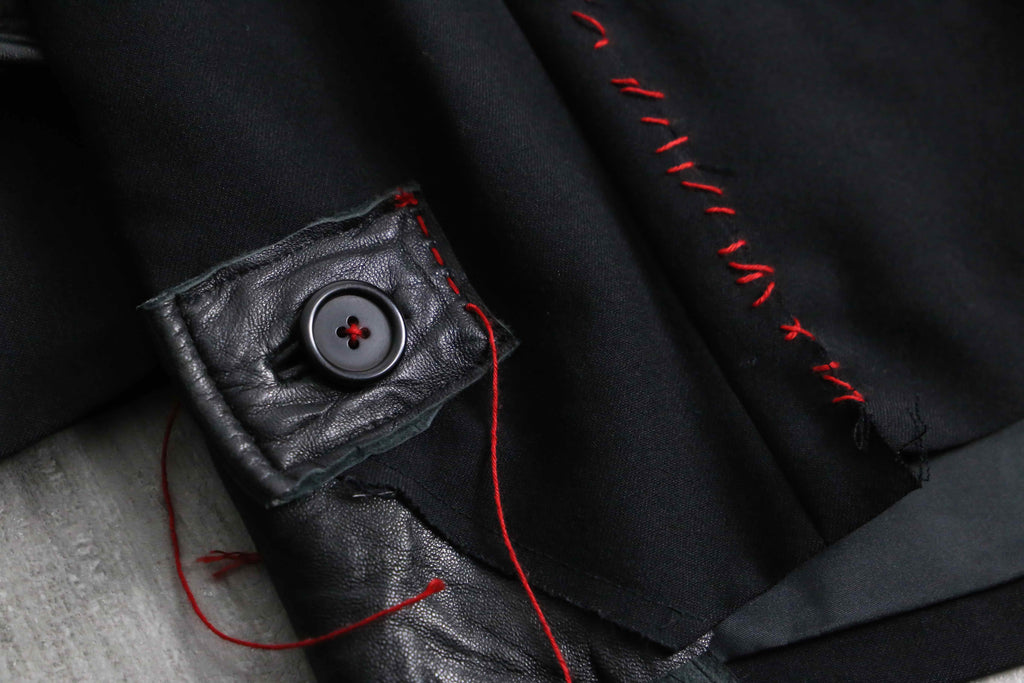 赤糸によるハンドステッチを加えることで、無機質になりがちなジャケットにリメイクならではの温度感を与えています。