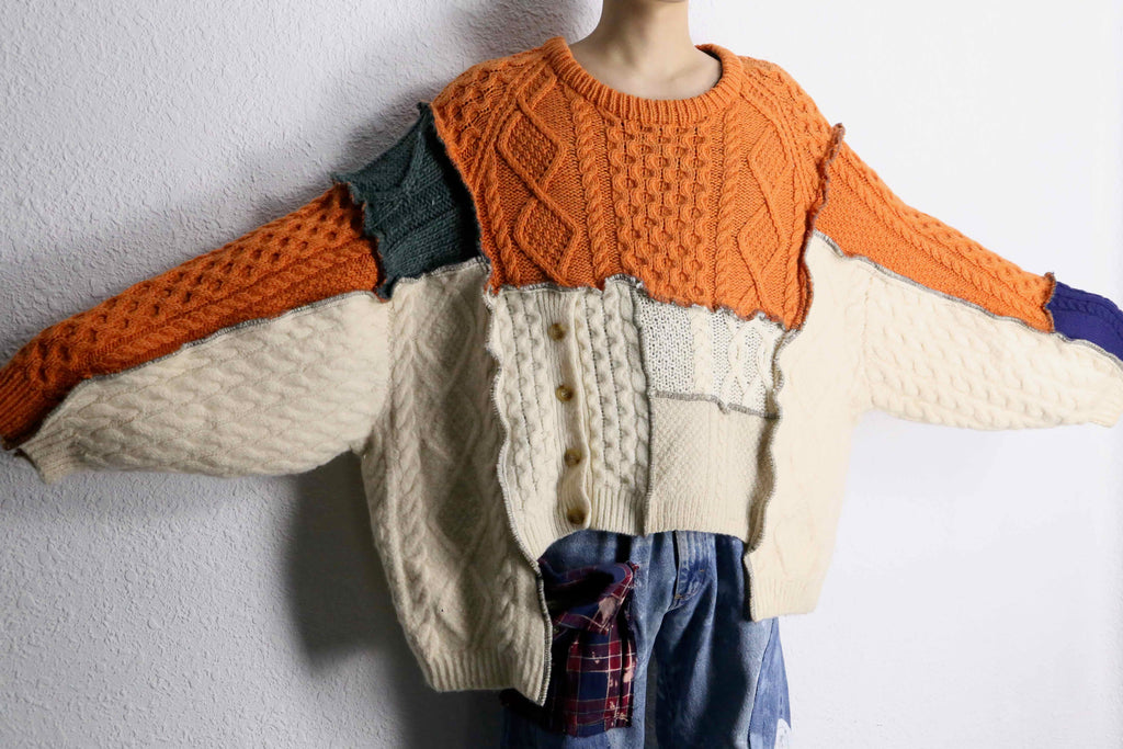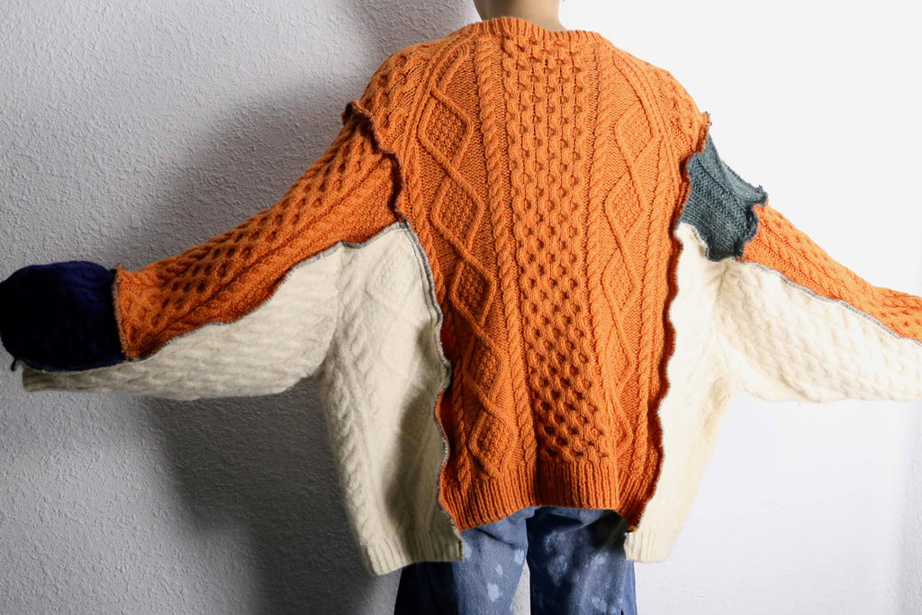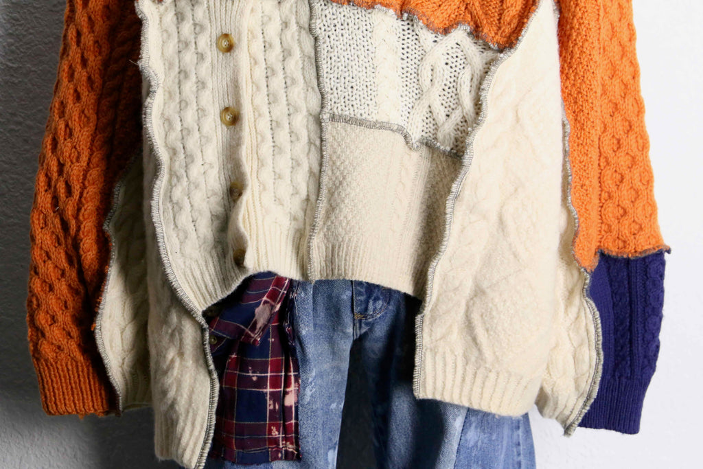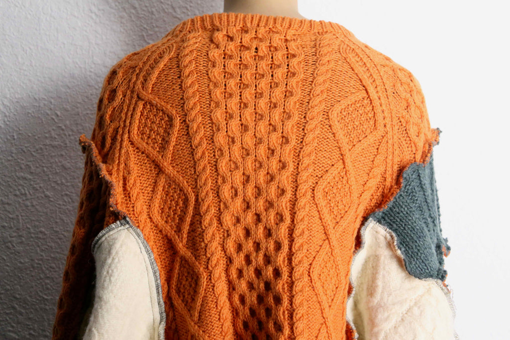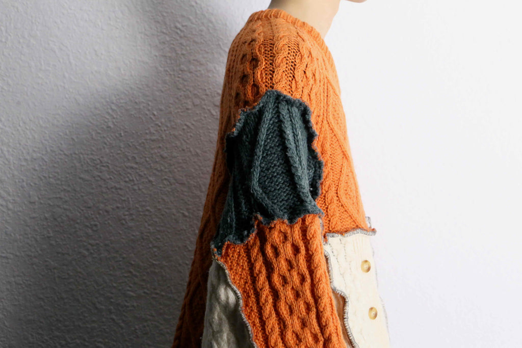 オレンジをベースに、ネイビー、グリーンなど異なるカラーと編み柄をパッチワークのようにつなぎ合わせ、表情のあるデザインに仕上げました。ケーブル編みやリブ、ボタン付きのニットパーツなど、もともとの素材感を活かしているため、見る角度によって印象が変わるのも魅力です。