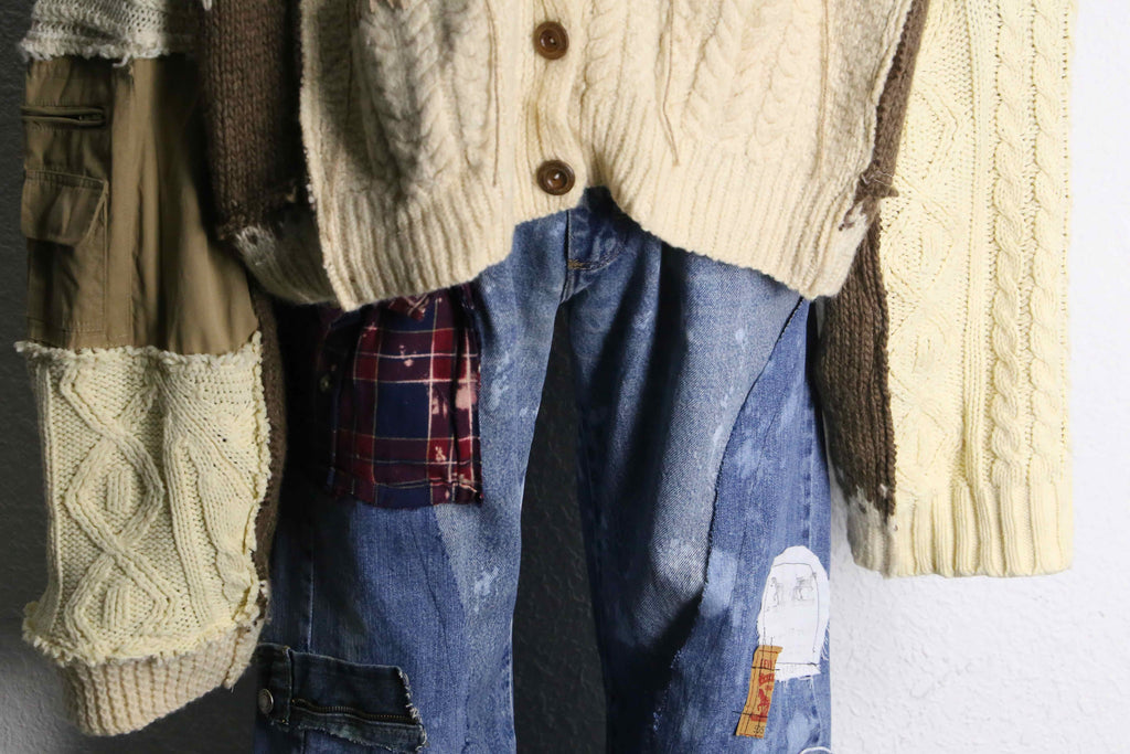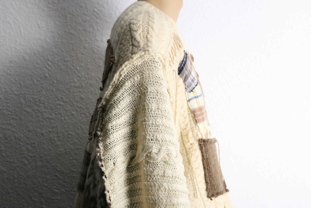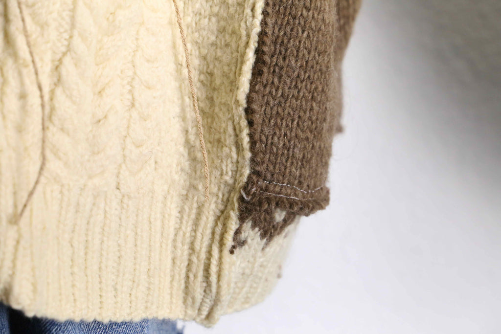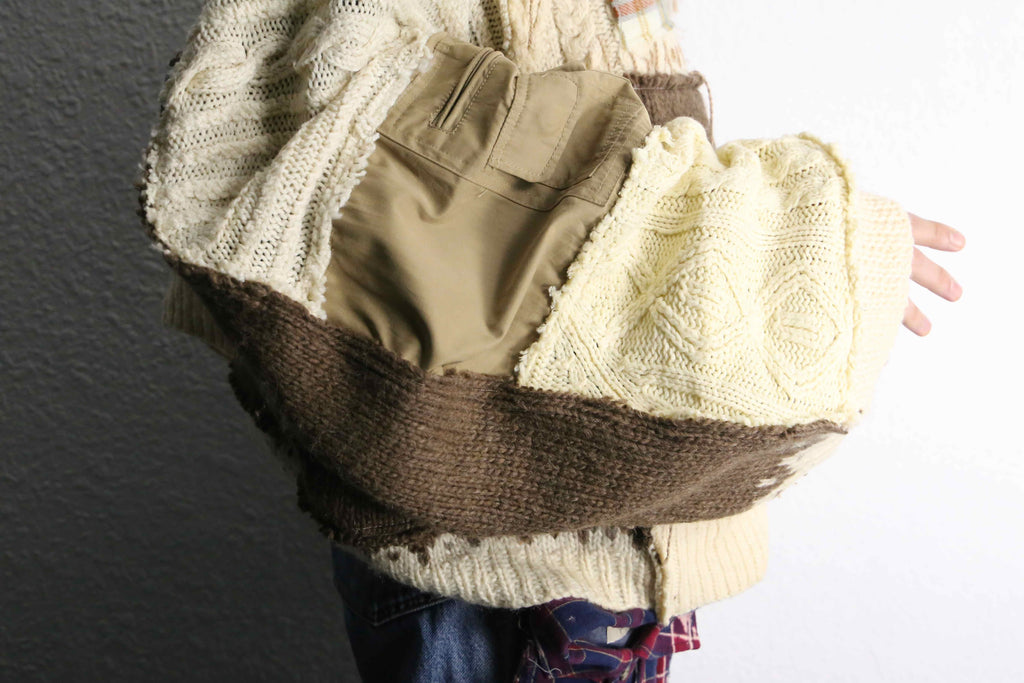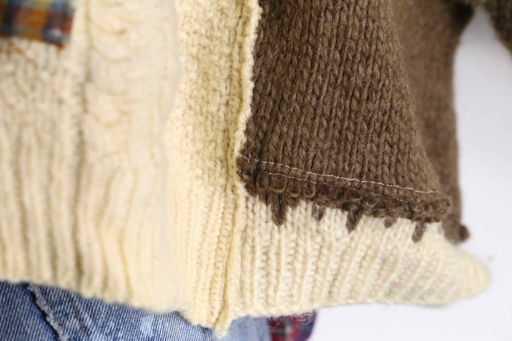 複数種のニットや異素材をミックスして使用することで可能となった超ドルマンシルエット。足が入ってしまうほどの極太アームと短丈シルエットの対比が可愛くてインパクト抜群です。チェック柄やステッチを織り込むことで飽きのこないデザインとしました。