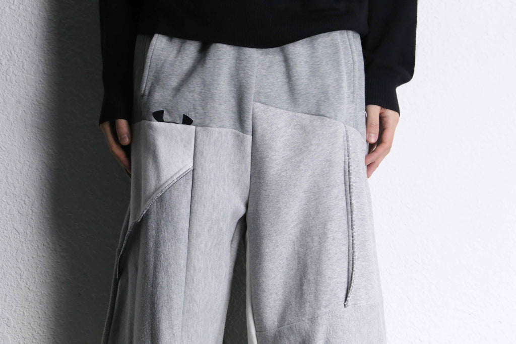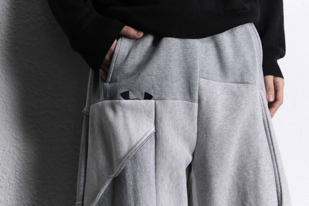スウェットを贅沢に4着程使用し、ウエストから裾に掛けてゆったりと広がるバギーシルエットへと昇華。スウェットパンツのラフなイメージもありますが、袴のようなシルエットは、ラフすぎずジャケットやシャツ等とモードなスタイリングにもスタイリングのしやすい1本です。