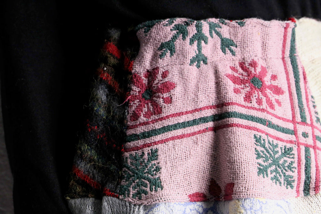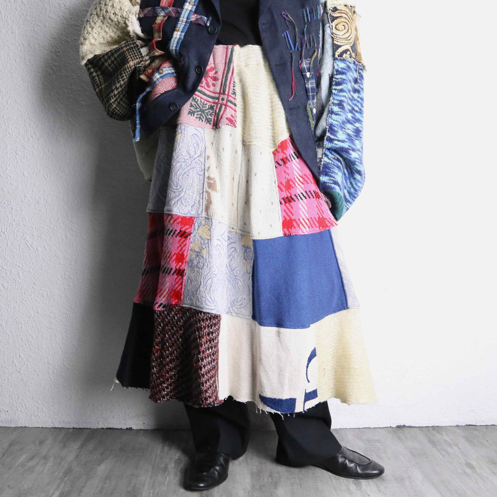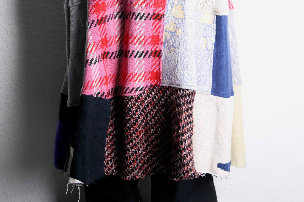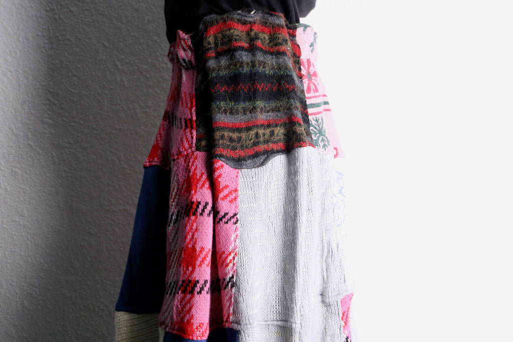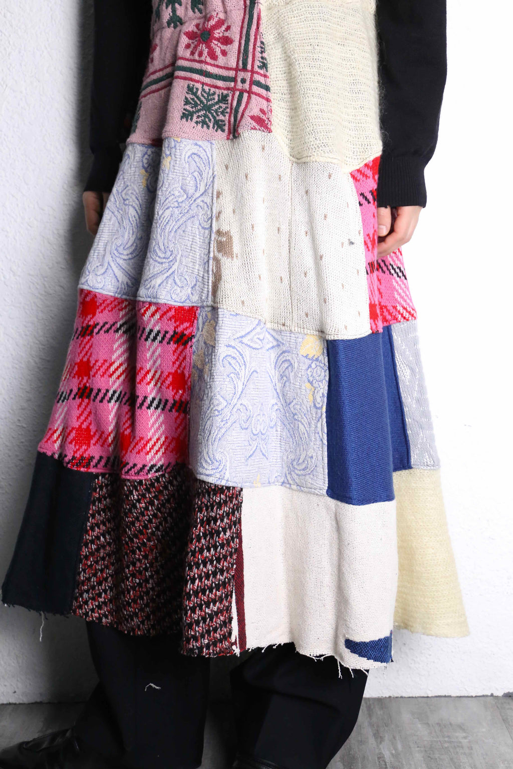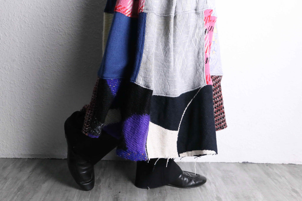 さまざまなニット素材や生地を組み合わせて仕立てた、リメイクのパッチワークスカートがオンラインに入荷。