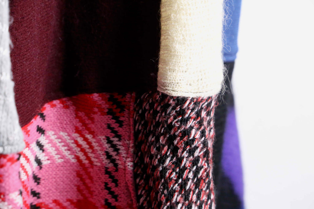 チェック柄や無地、編み地の異なるニットをミックスし、一枚の中で豊かな表情が出るようデザインされた一枚。