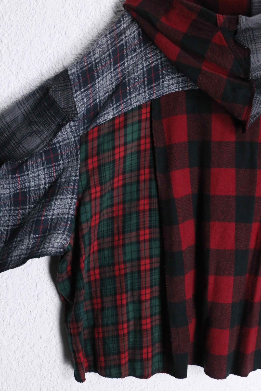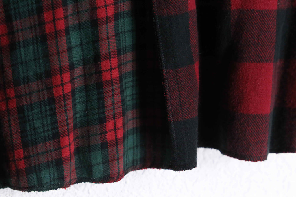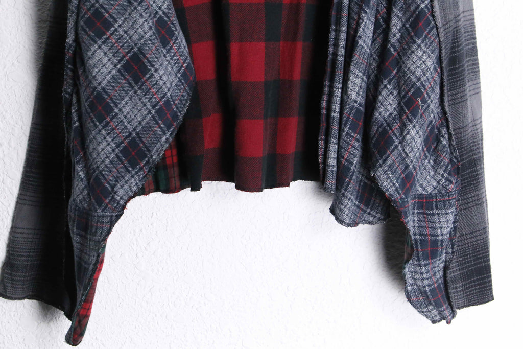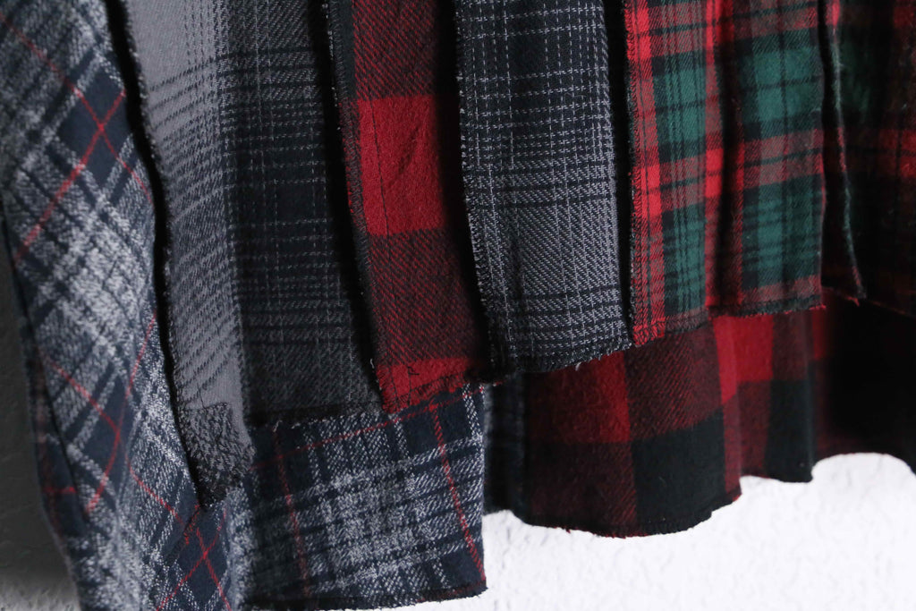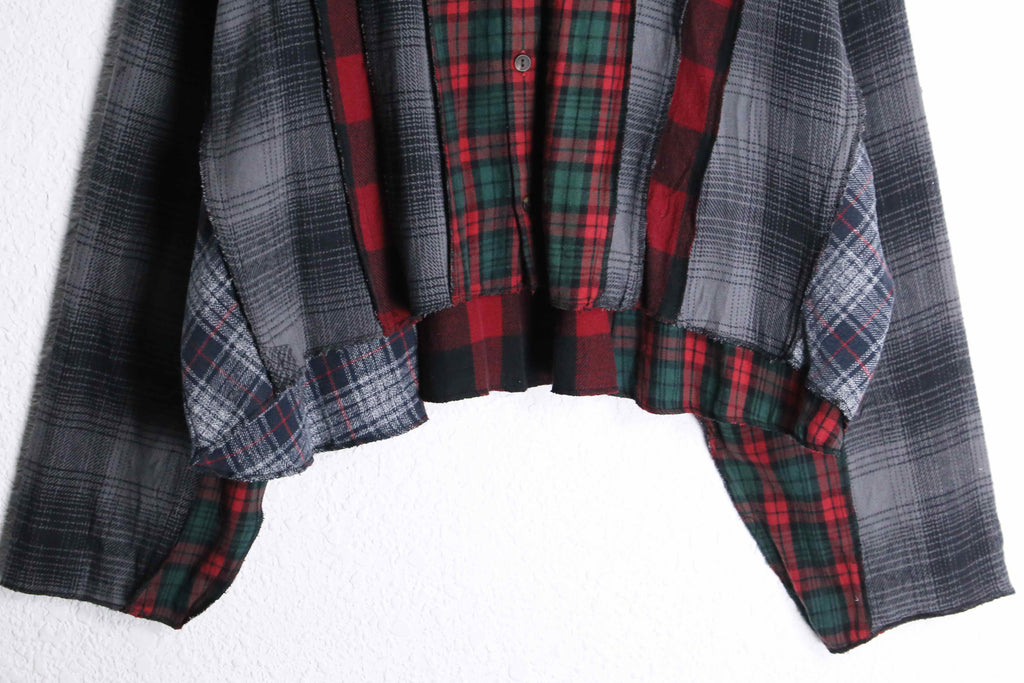 異なるチェック柄を組み合わせたデザインで、見る角度によって雰囲気が変わるのがポイント。ゆったりめのオーバーサイズシルエットで、羽織るだけで今っぽい着こなしになります。裾は少しラフなカットで、こなれた印象に。ボタンで開け閉めできるので羽織としても使えます。