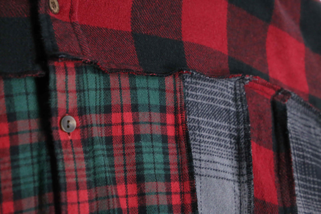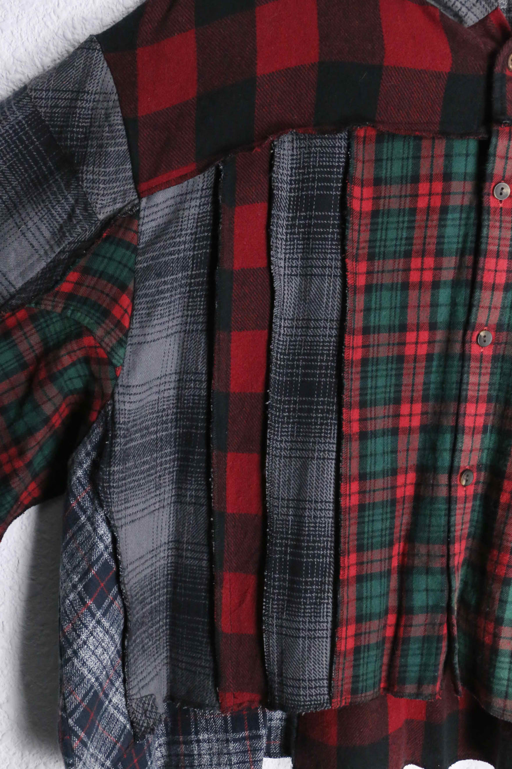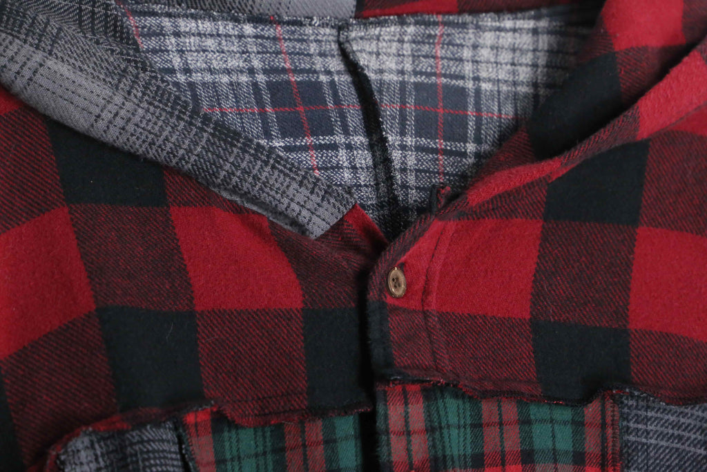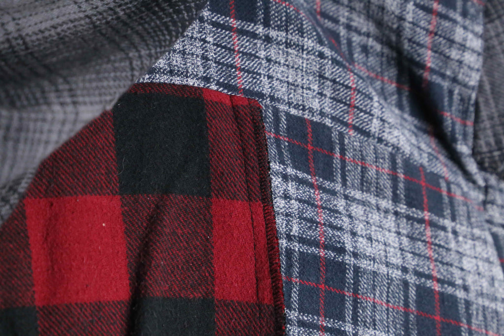 異なるチェック柄を組み合わせたデザインで、見る角度によって雰囲気が変わるのがポイント。ゆったりめのオーバーサイズシルエットで、羽織るだけで今っぽい着こなしになります。裾は少しラフなカットで、こなれた印象に。ボタンで開け閉めできるので羽織としても使えます。