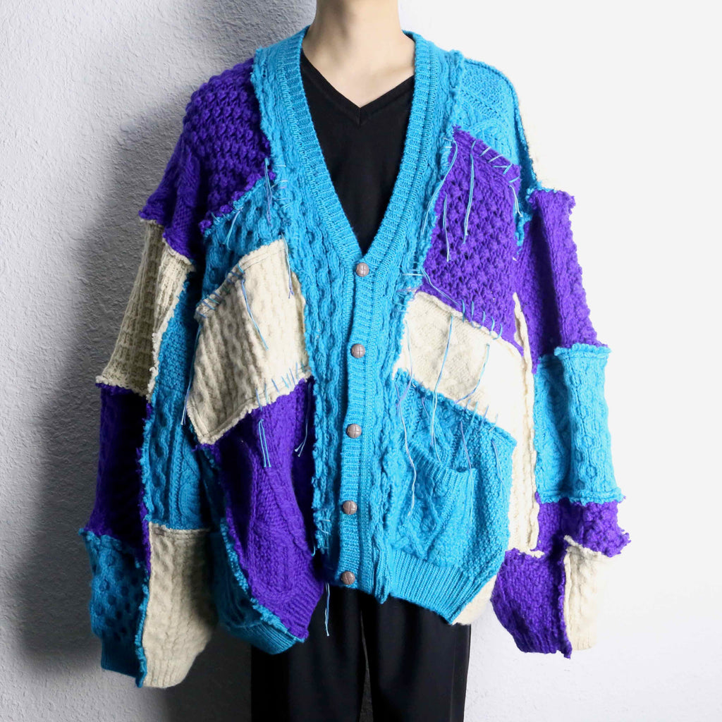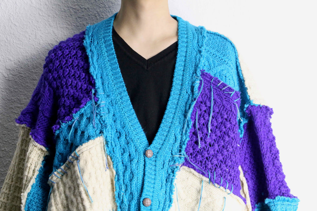 さまざまな表情のニット素材を組み合わせて再構築した、存在感のあるリメイクカーディガンがオンラインに入荷。