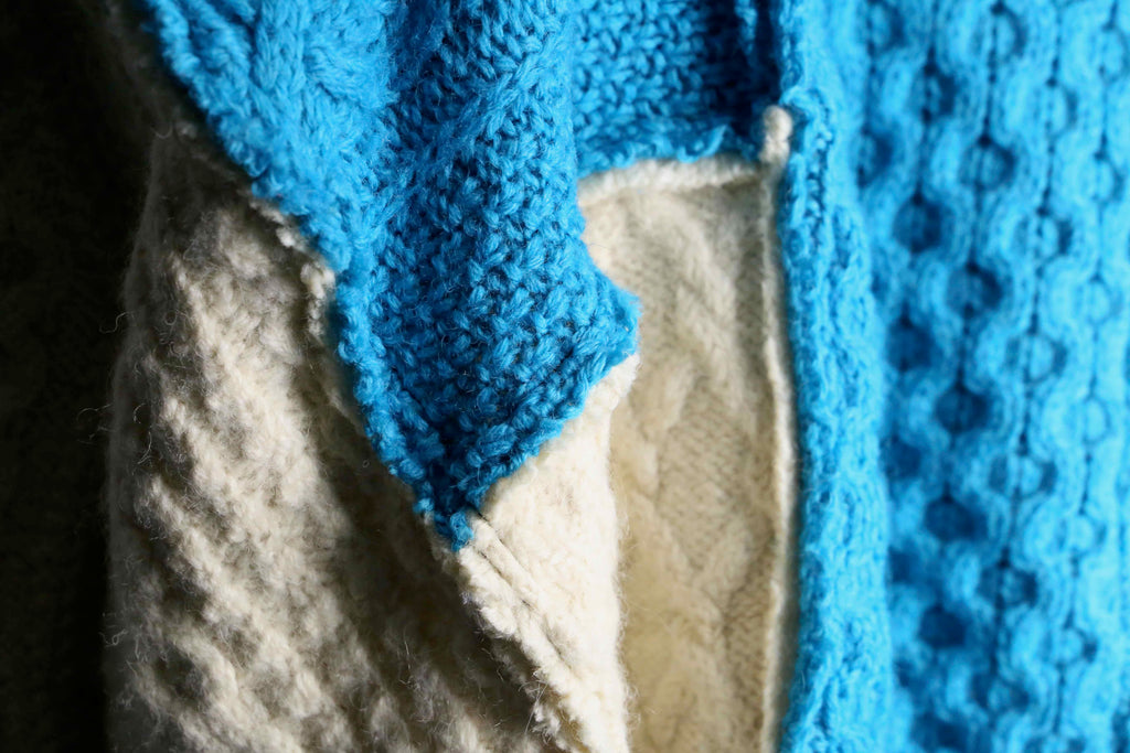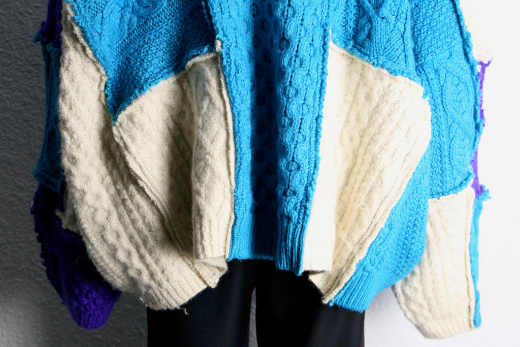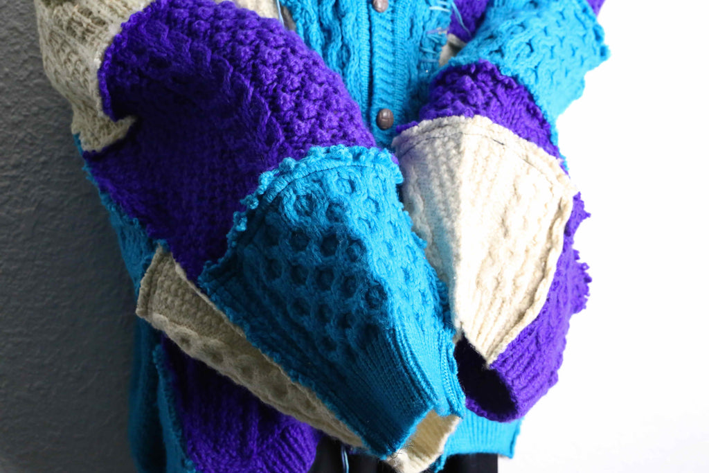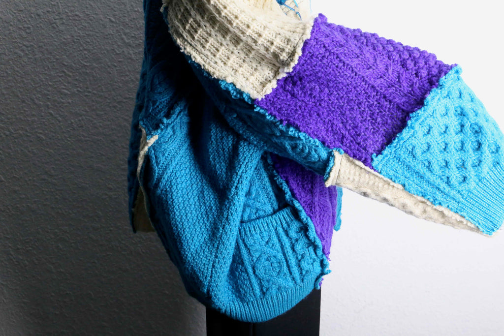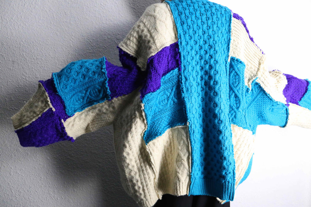 ブルーとパープルを基調に、生成りカラーのニットをアクセントとして配置し、パッチワークならではの奥行きと立体感のあるデザインに仕上げました。それぞれ異なる編み地や厚みのニットを使用しているため、1着の中でさまざまな質感を楽しめるのが魅力です。切り替え部分にはあえてステッチや糸を残し、ハンドメイドらしいラフさと温かみを演出しています。