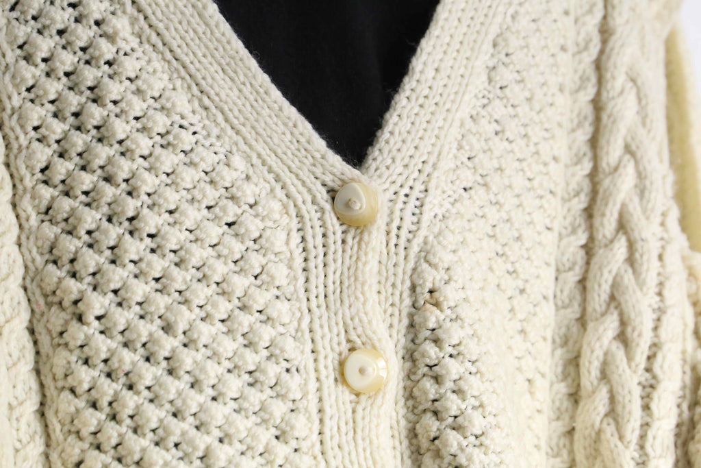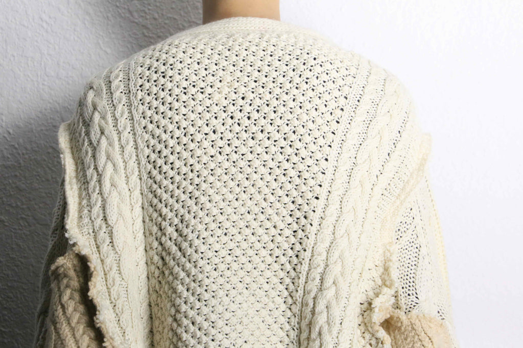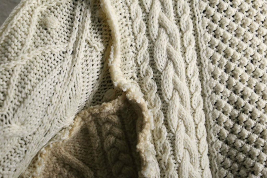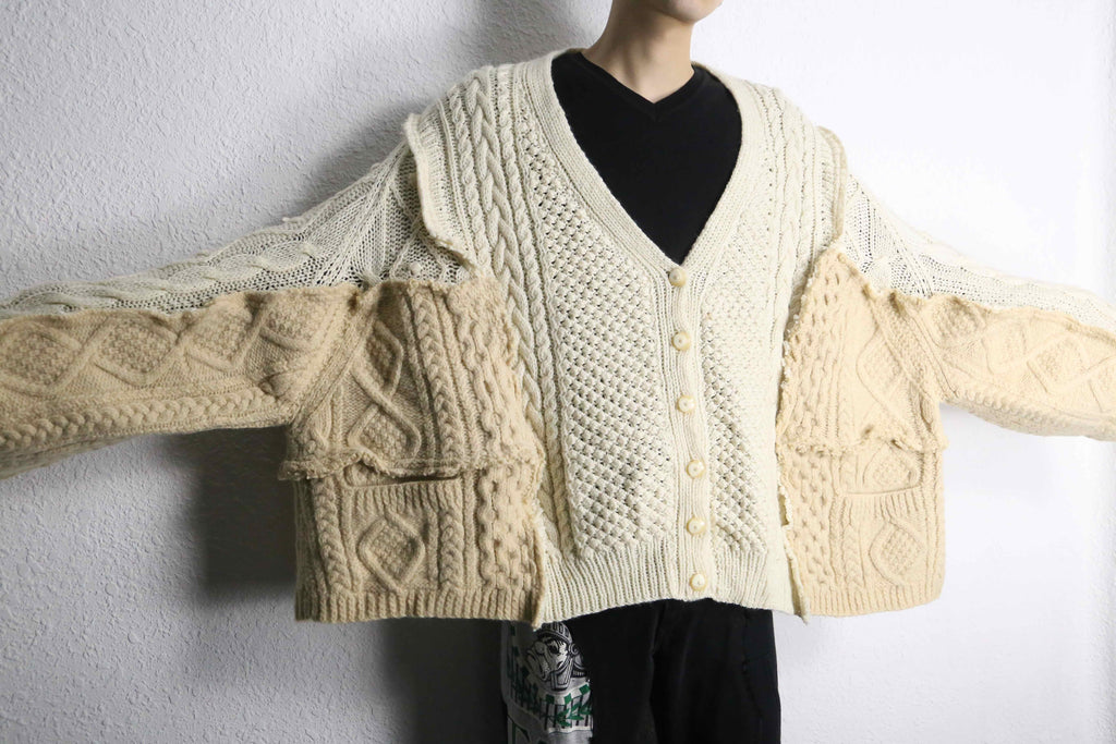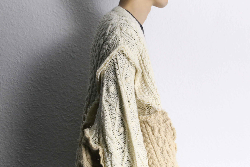 ケーブル編みや凹凸のある編地をパッチワーク状に組み合わせ、同系色でまとめることで奥行きのある一着に仕上げました。