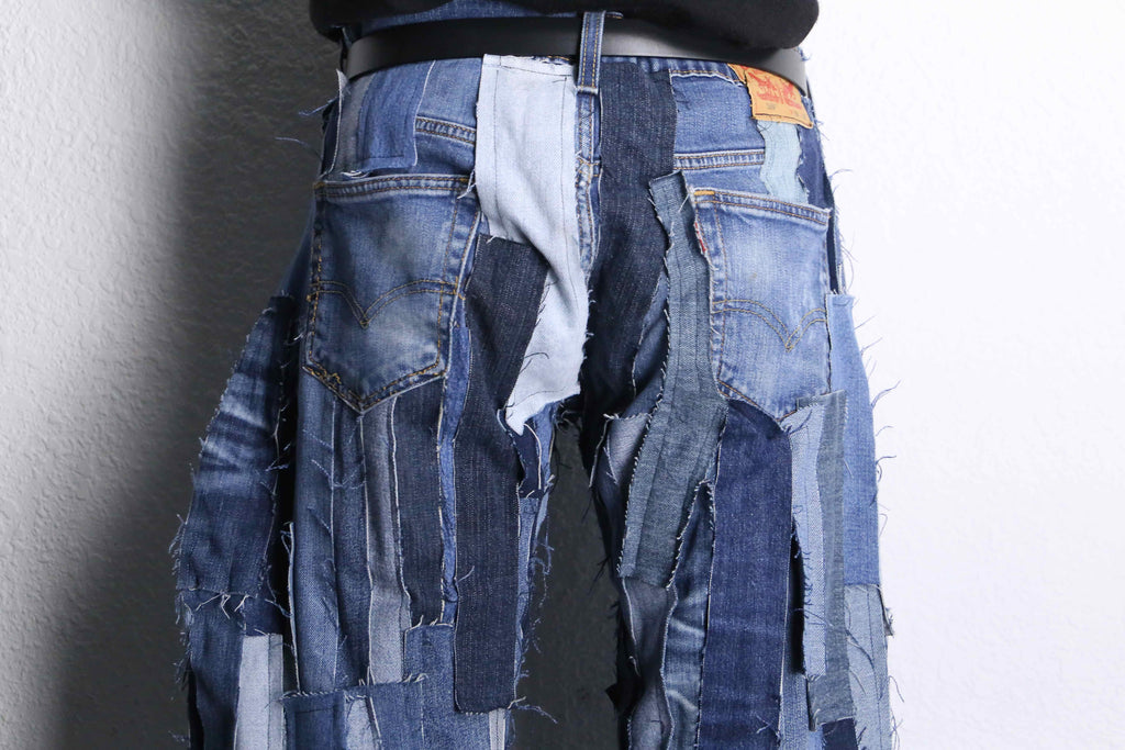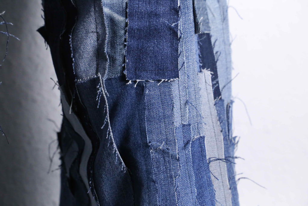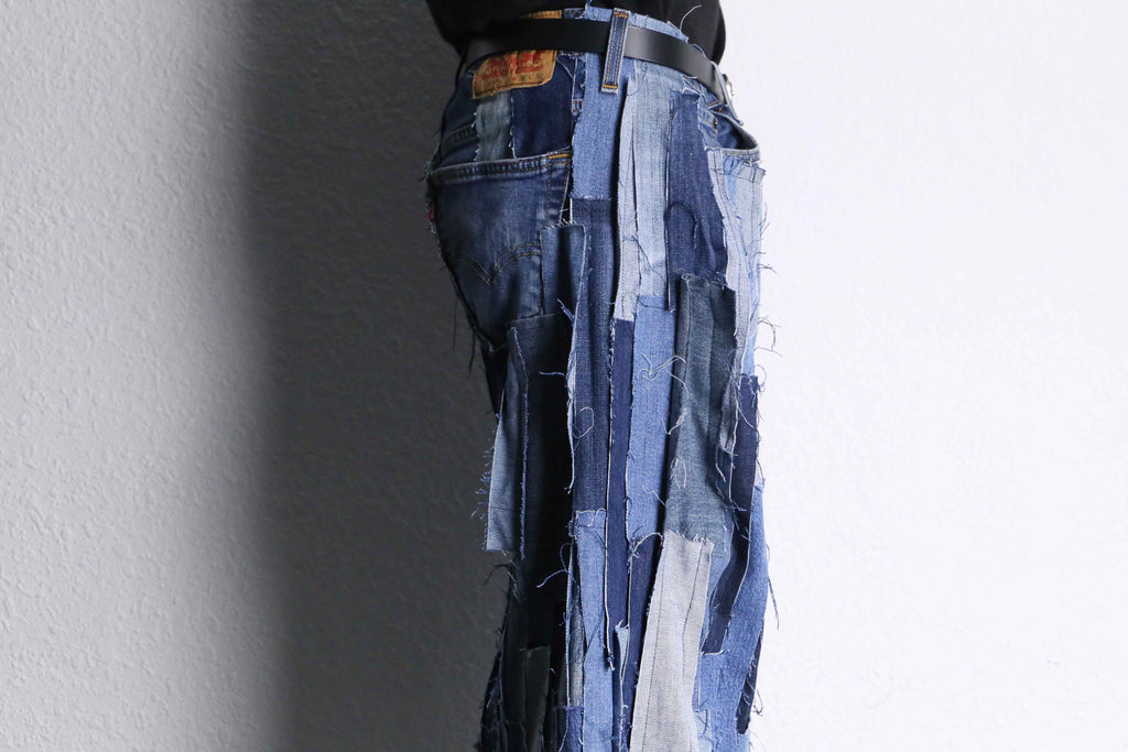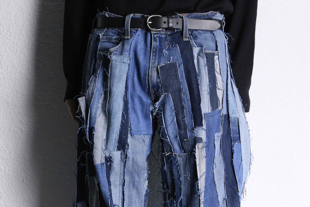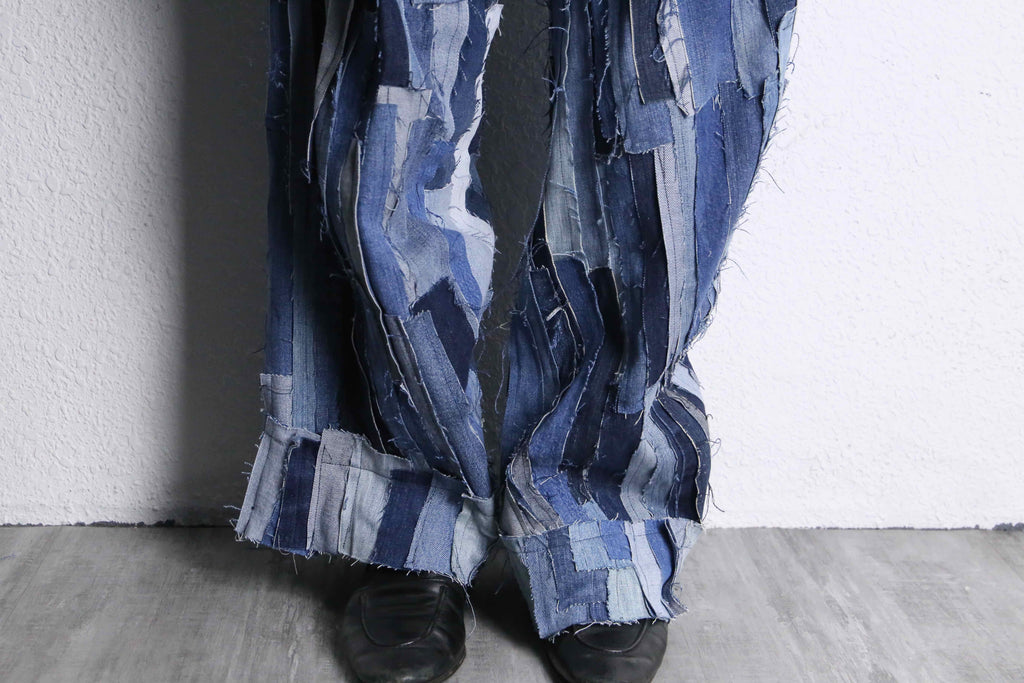 異なるトーンや表情のデニム生地を分解し再構築。存在感抜群のリメイクワイドパンツです。