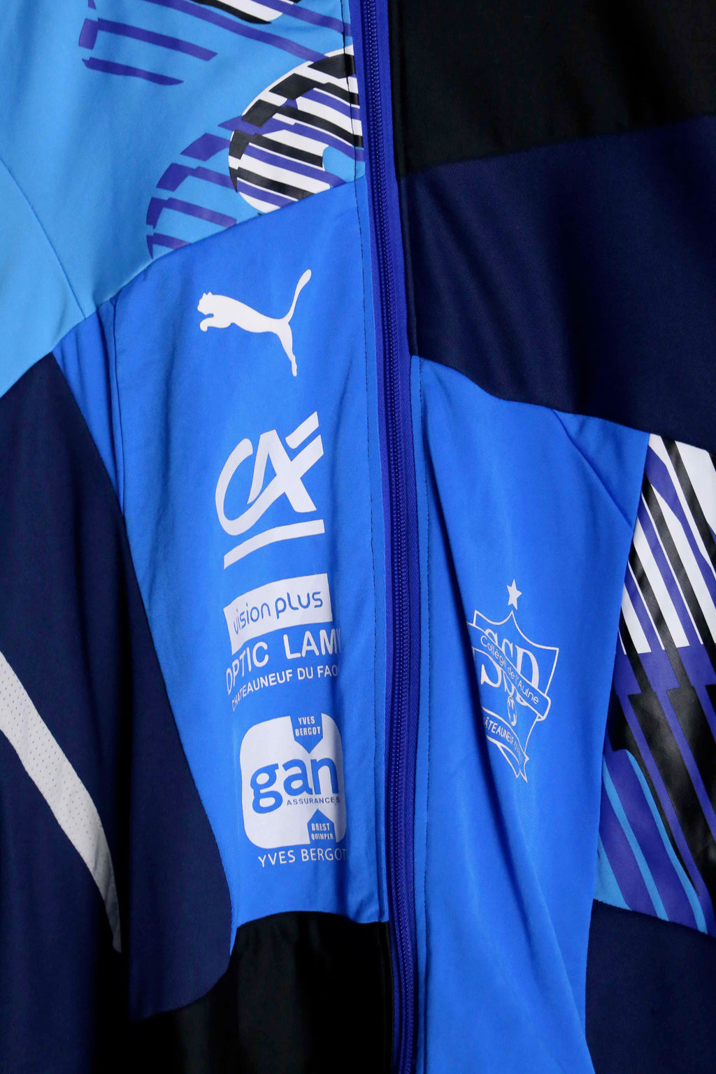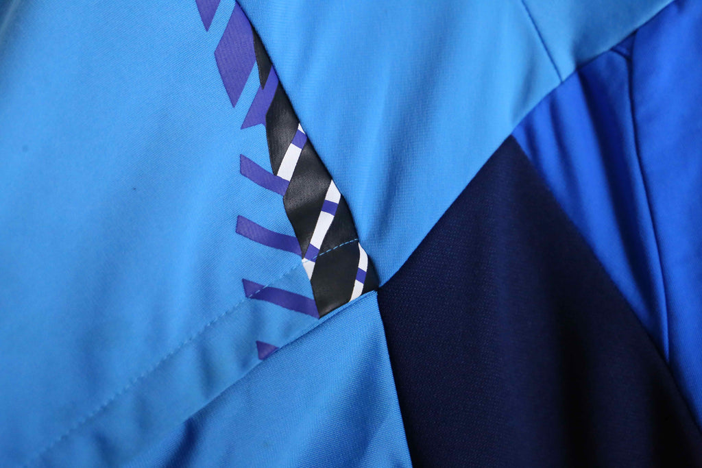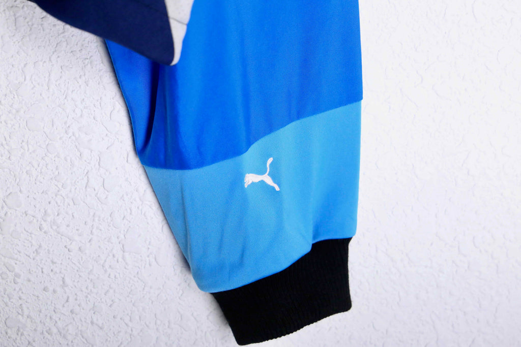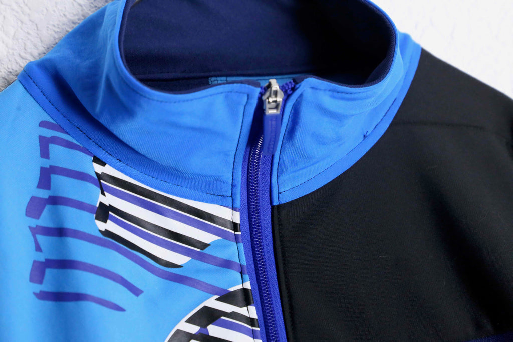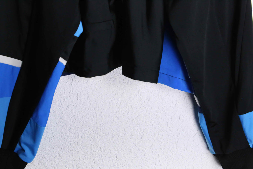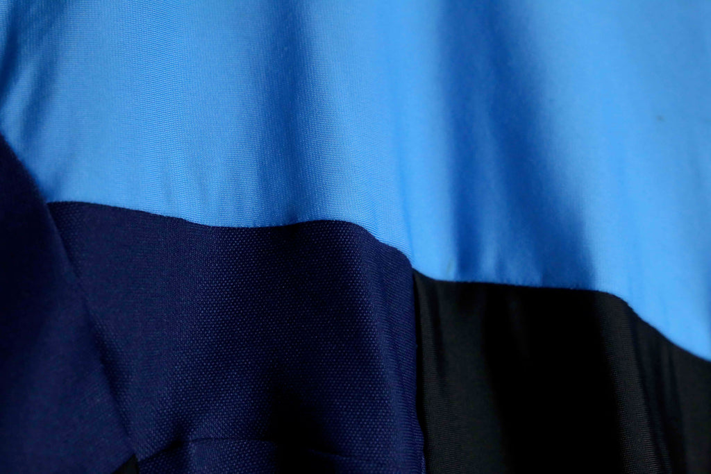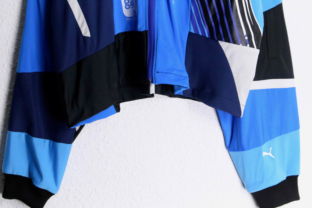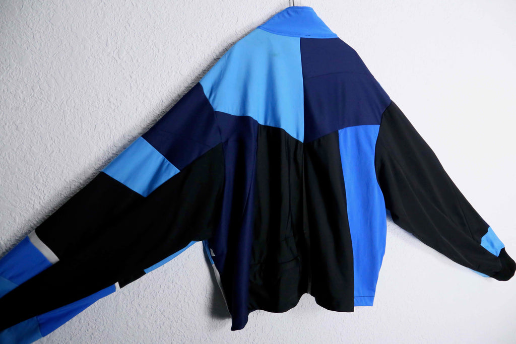 複数枚のトラックジャケットを一枚にまとめ上げ、リメイクの魅力溢れるデザインに。ブルーがベースで入ってる為派手に見えますが、ネイビーが入ることにより落ち着いたトラックジャケットと仕上がっています。