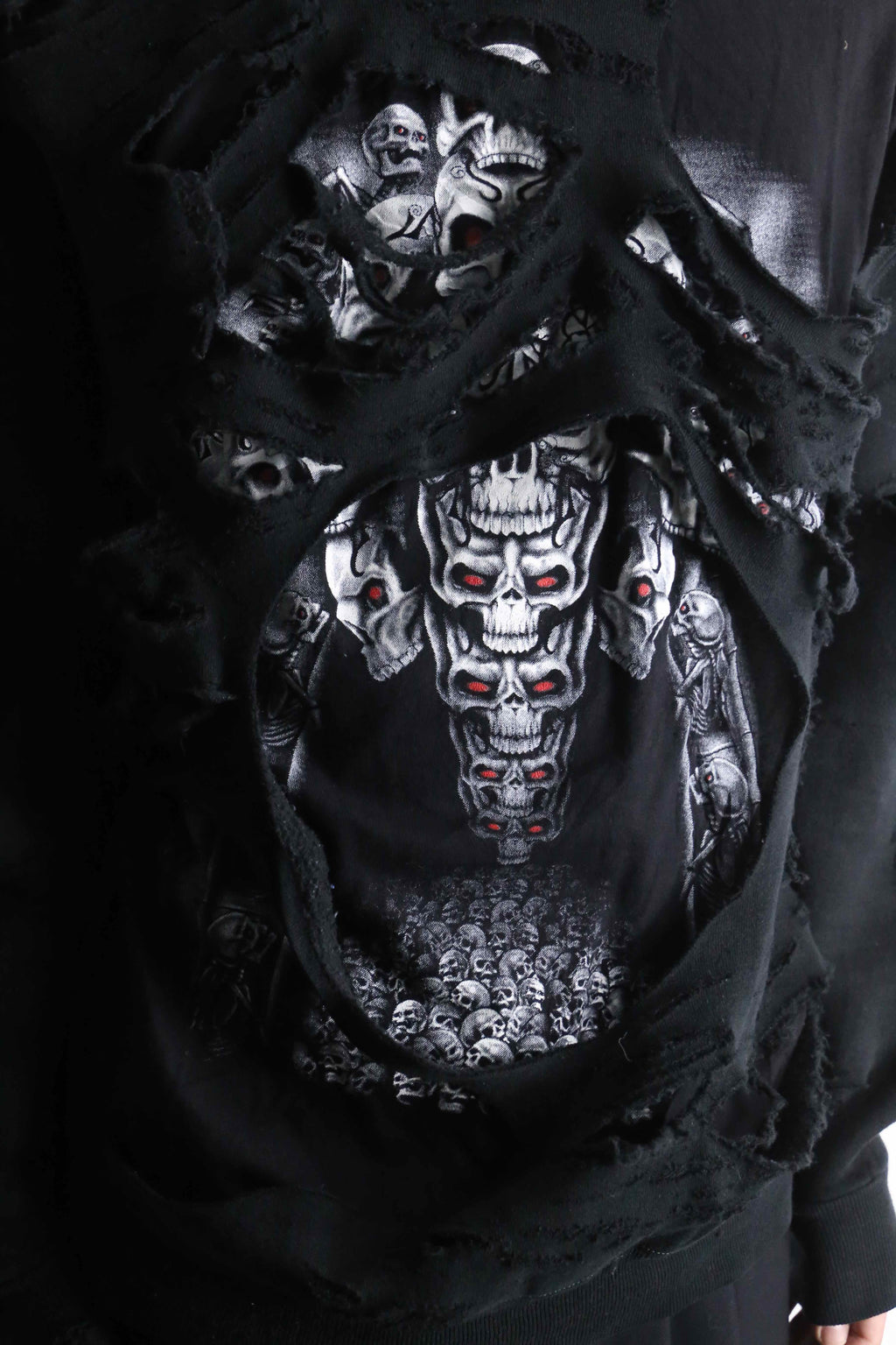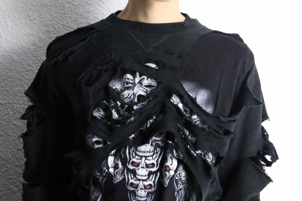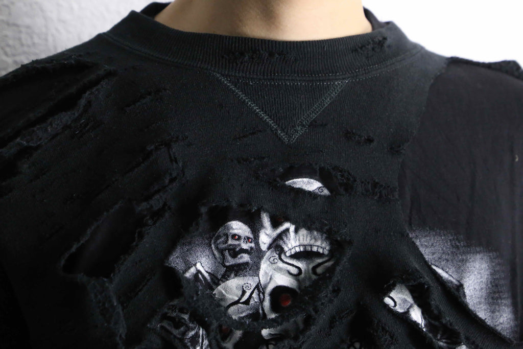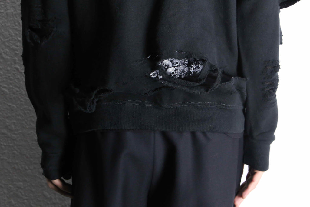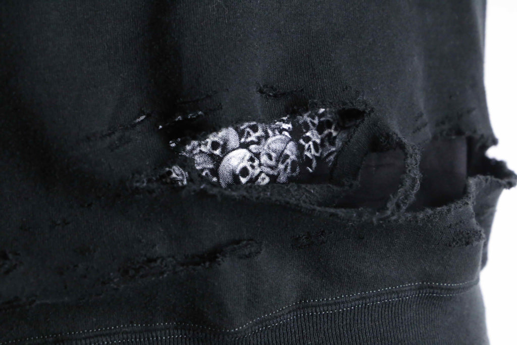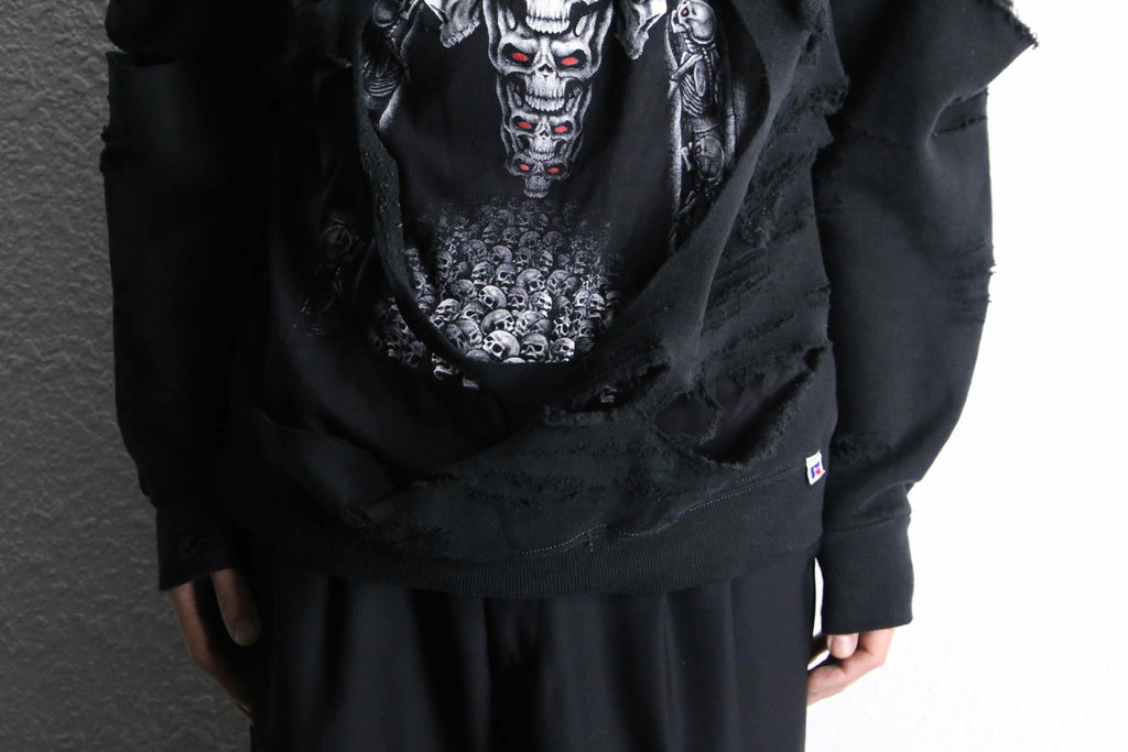 ブラックのフーディーの上から、スカルTeeを大胆にもドッキング。リメイクならではの一枚でレイヤードをしているかのような仕上がりに。