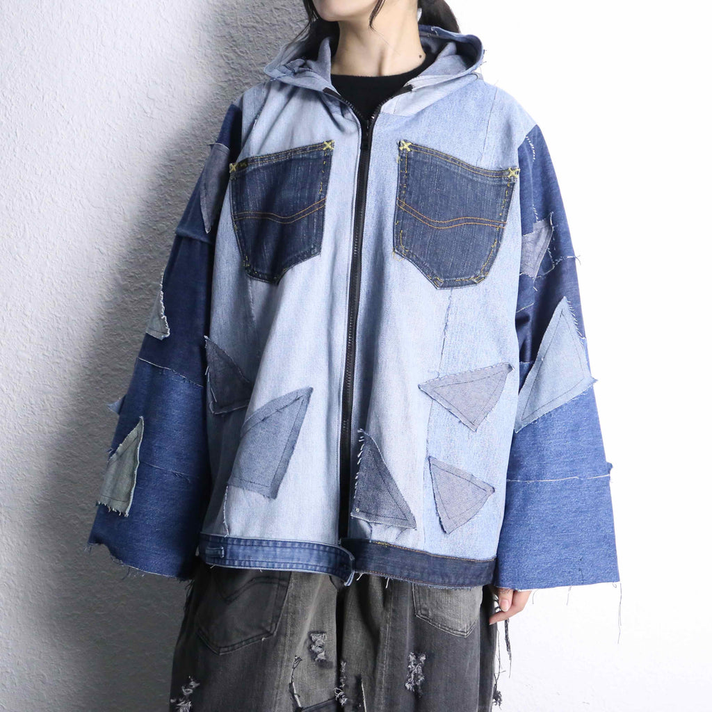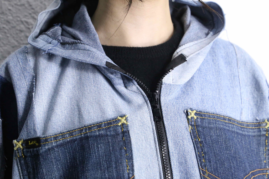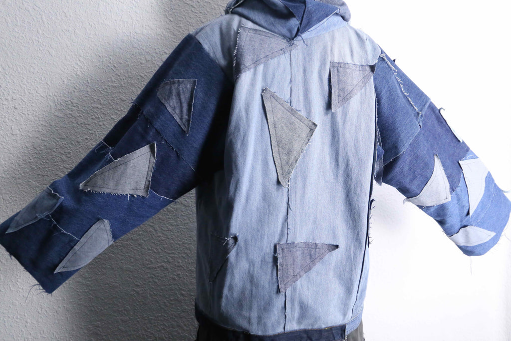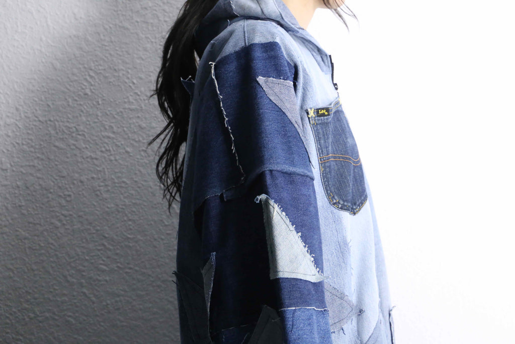 遊び心たっぷりのパッチワークを施したリメイクデニムフーディがオンラインに入荷します。