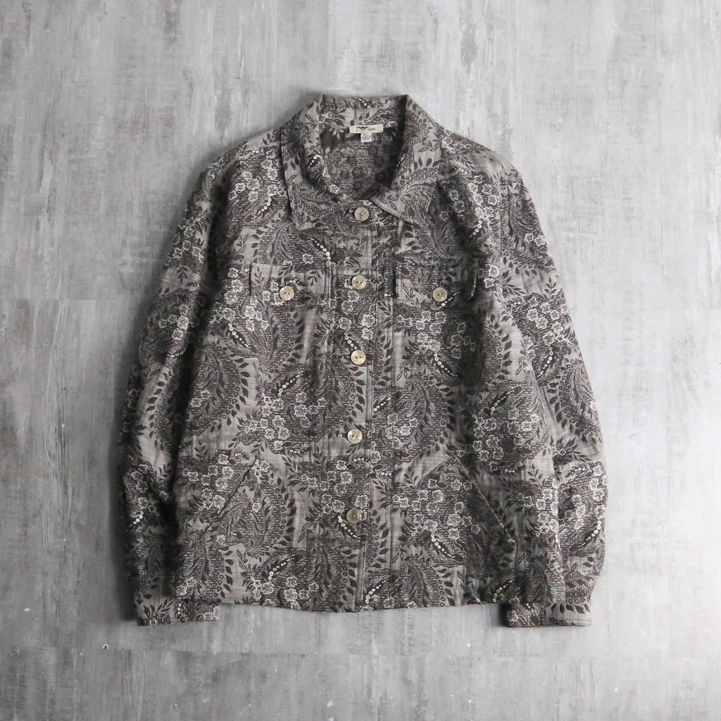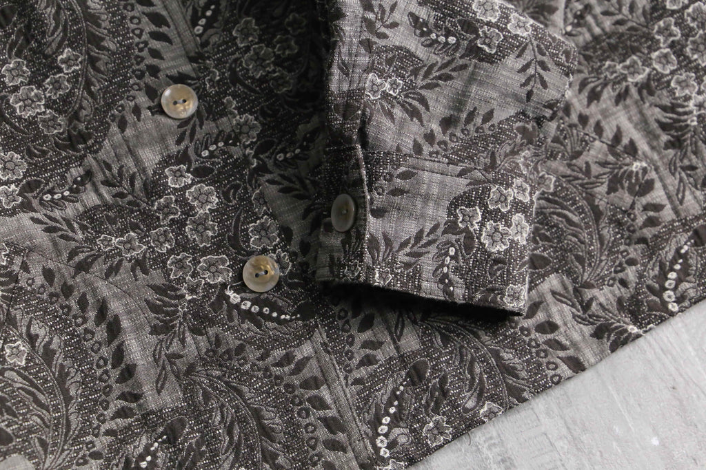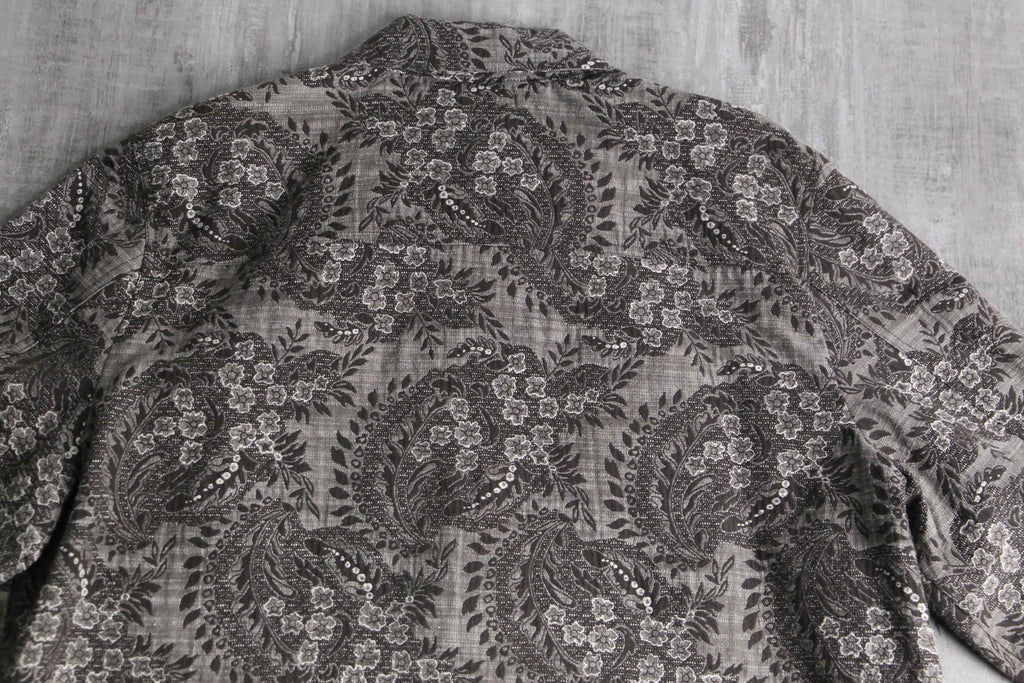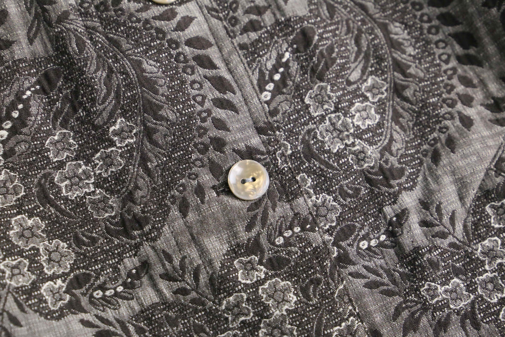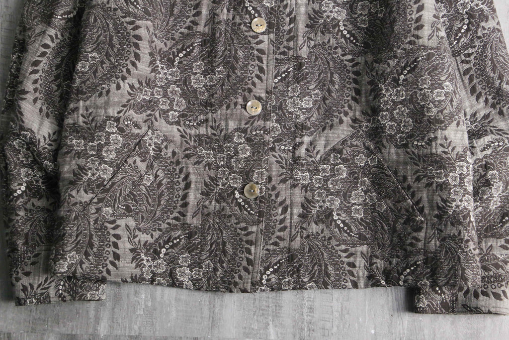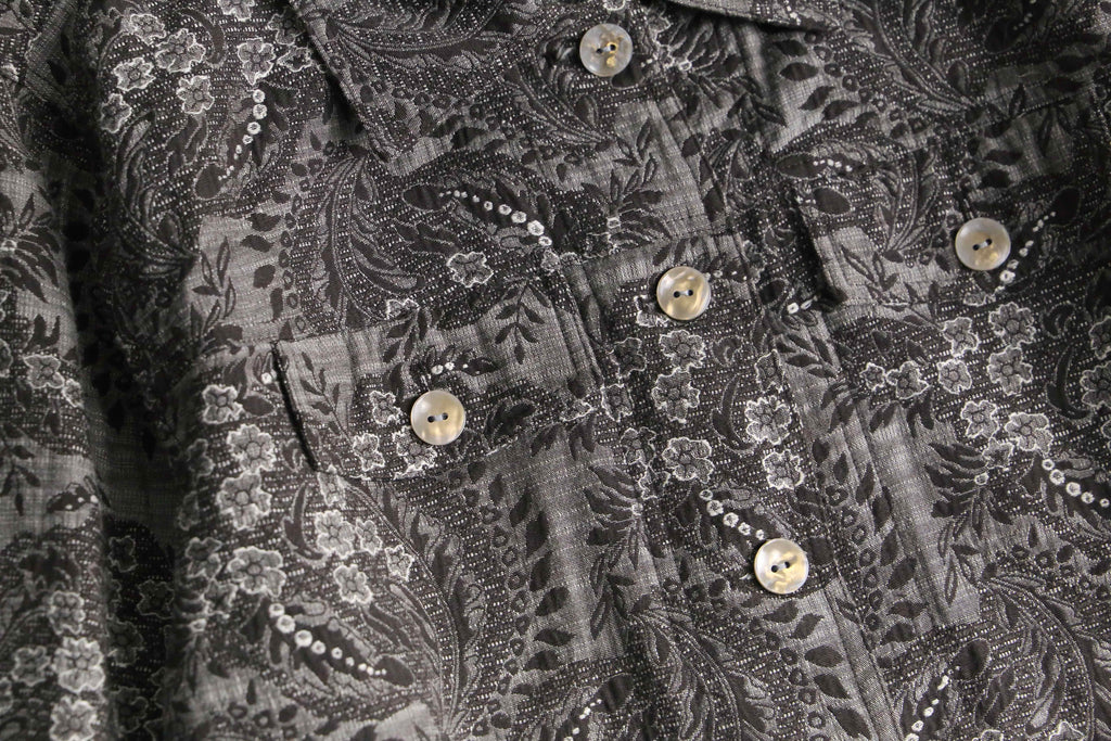 ジャガード織特有のグラデーションでペイズリーと花柄を描いたトラッカータイプとなります。サイドスリットが小さく入ったボックスシルエットで、ざっくりと羽織りやすい1着。艶のあるラグジュアリーなボタンもポイントです。
