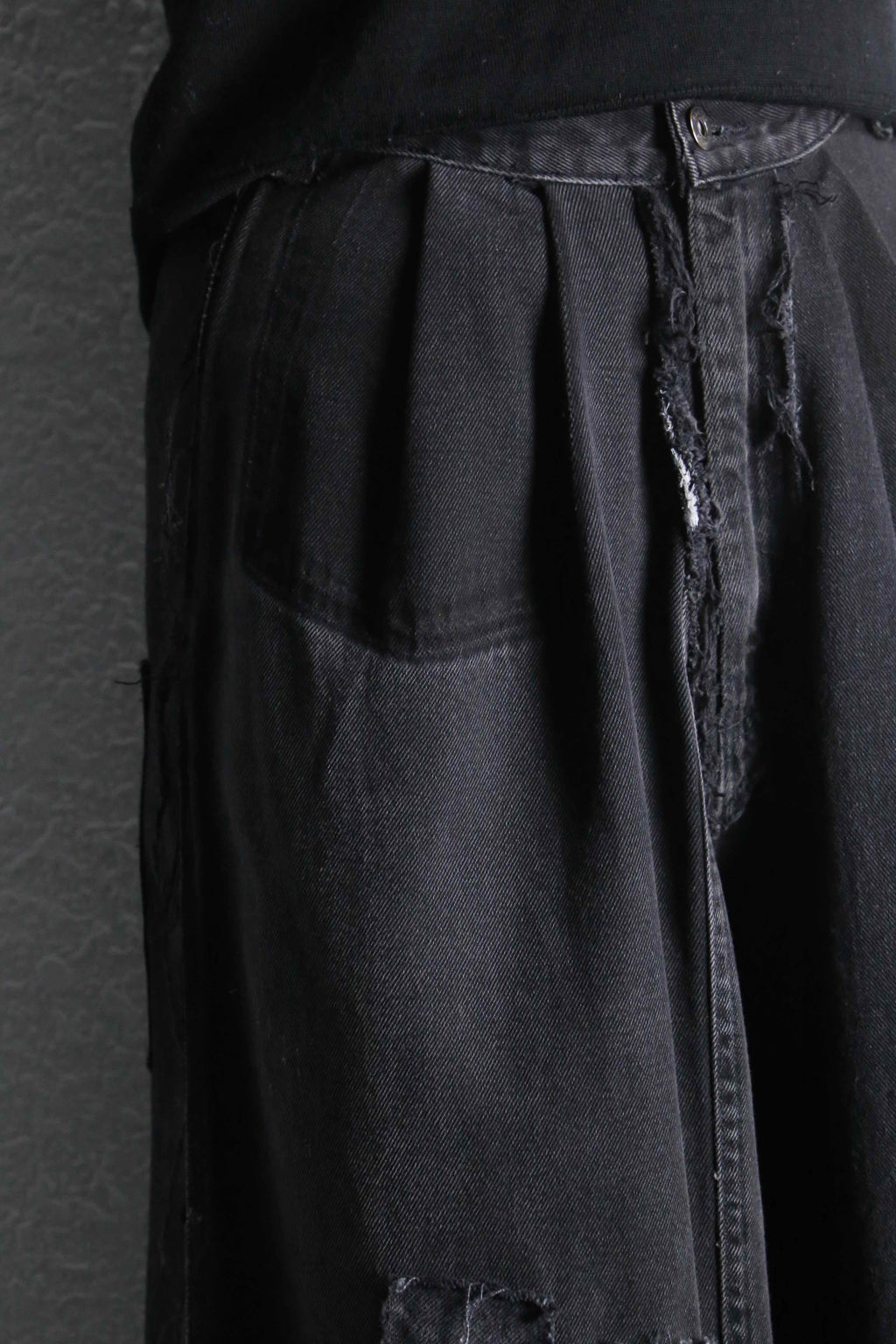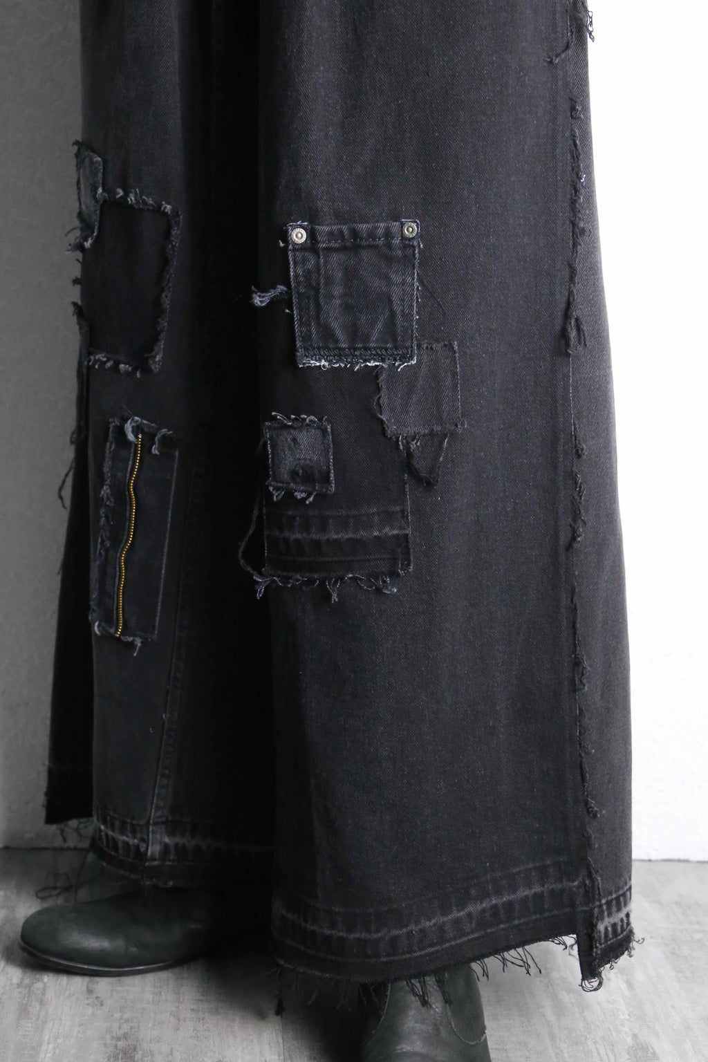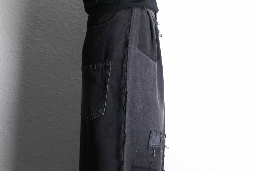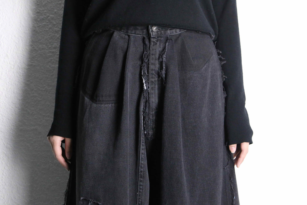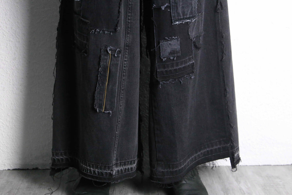 ブラックデニムをベースに再構築した、存在感のあるリメイクワイドパンツがオンラインに入荷。