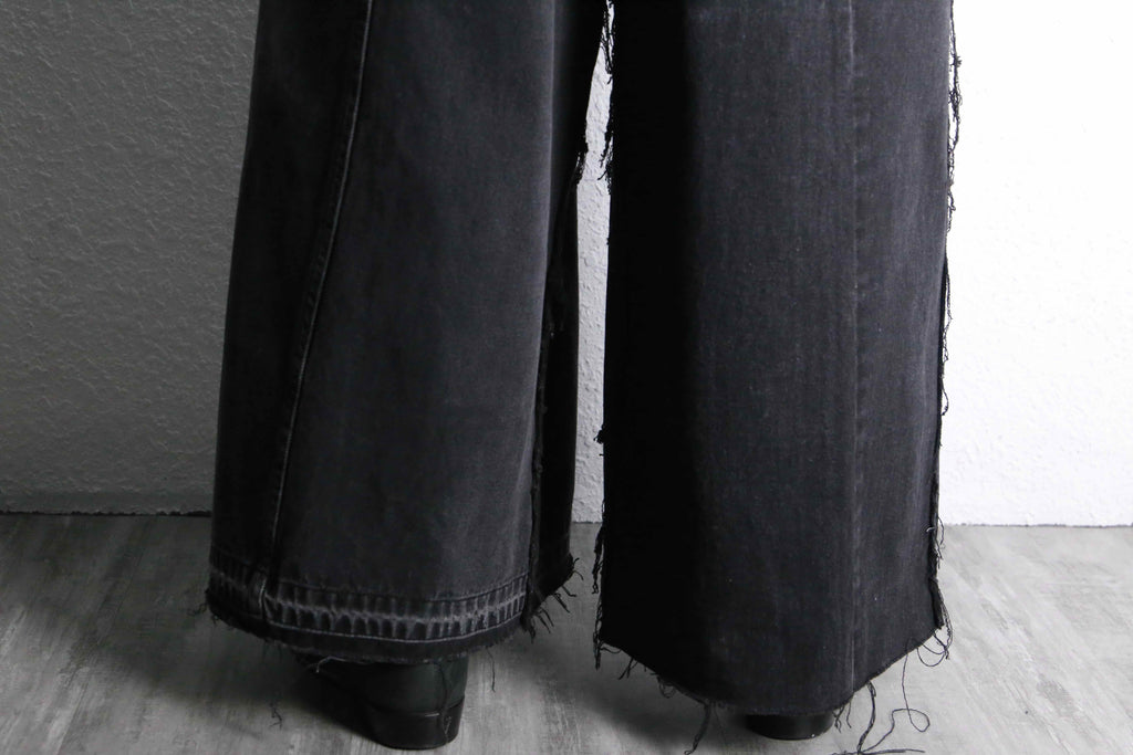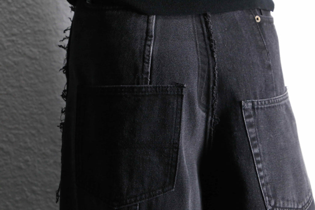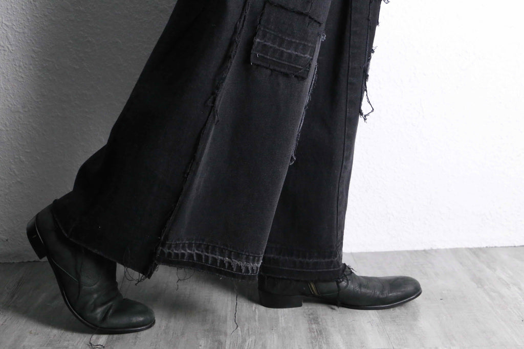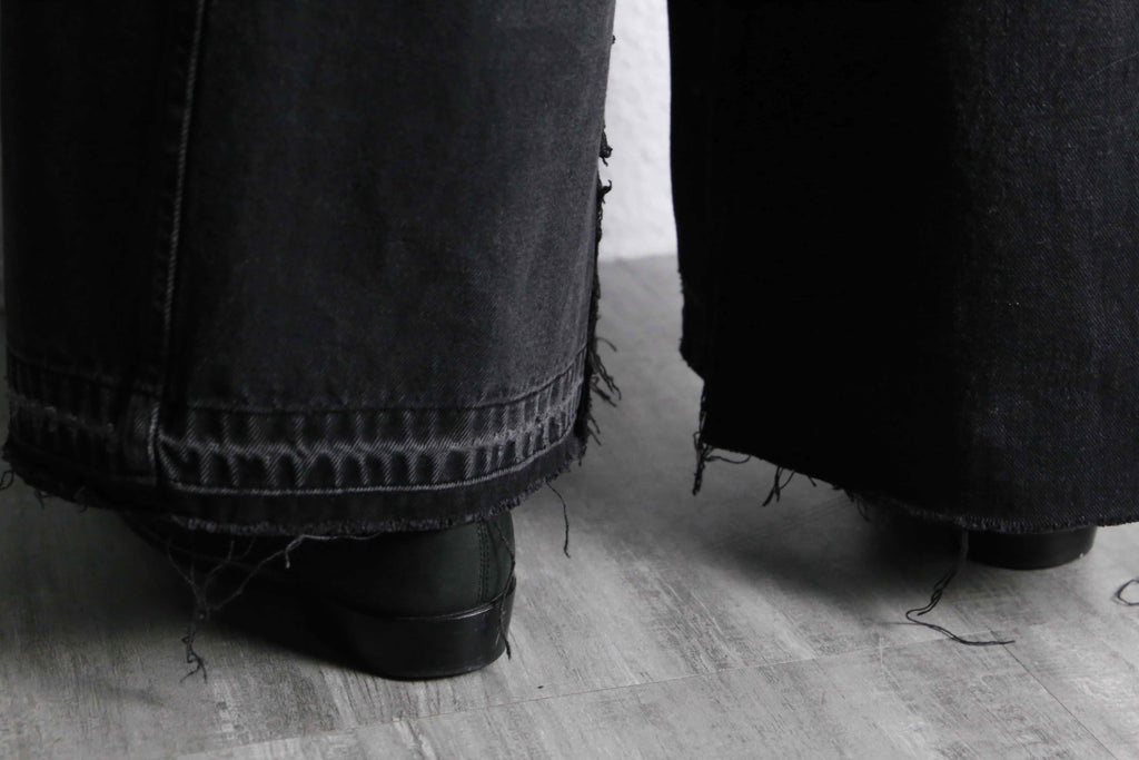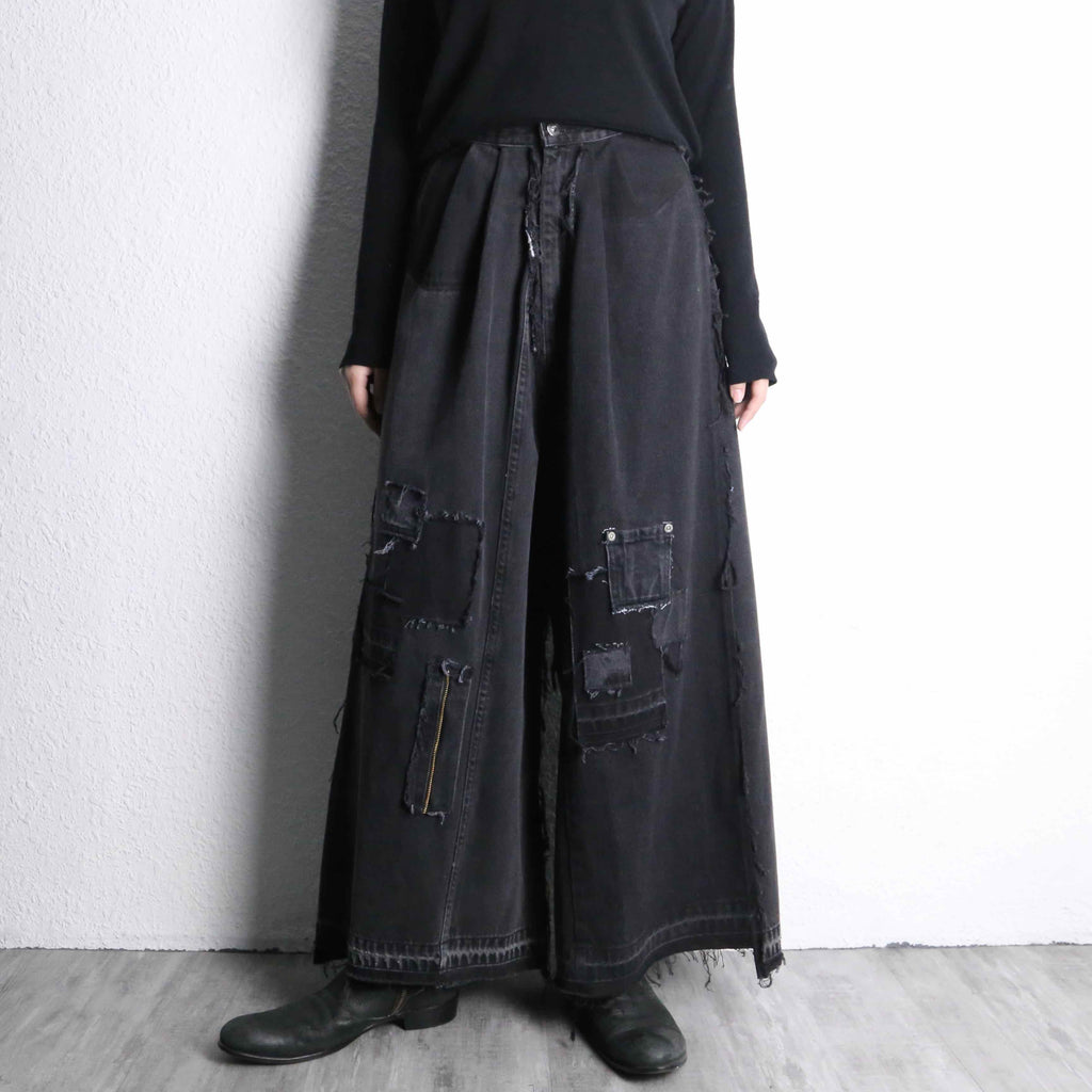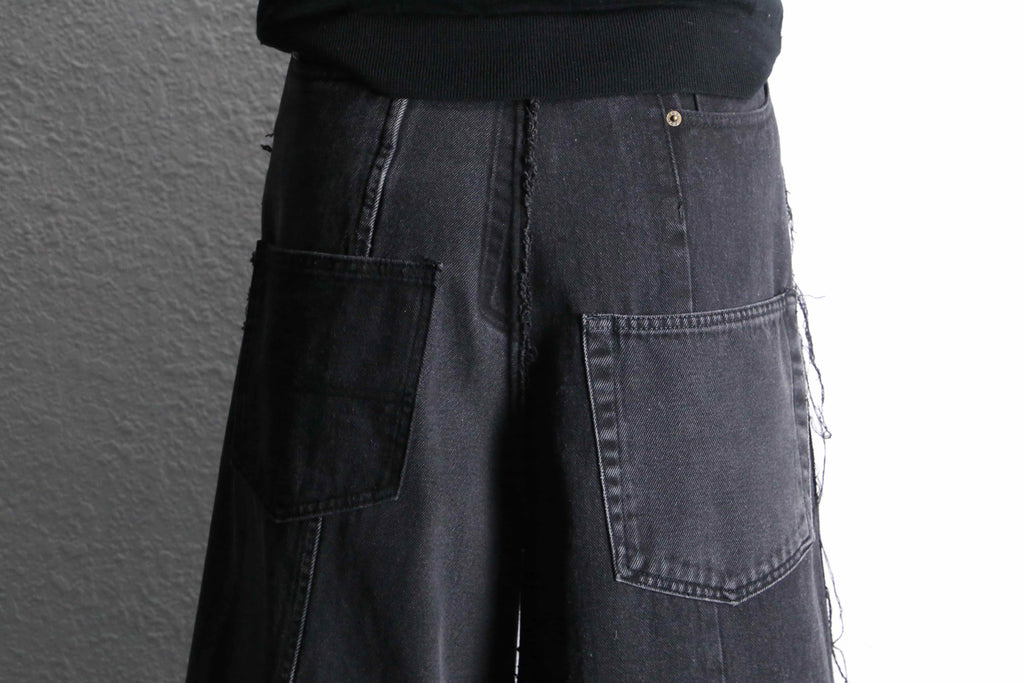ブラックデニムをベースに再構築した、存在感のあるリメイクワイドパンツがオンラインに入荷。