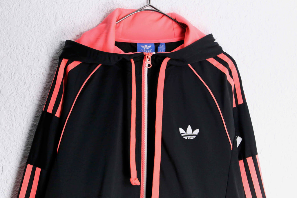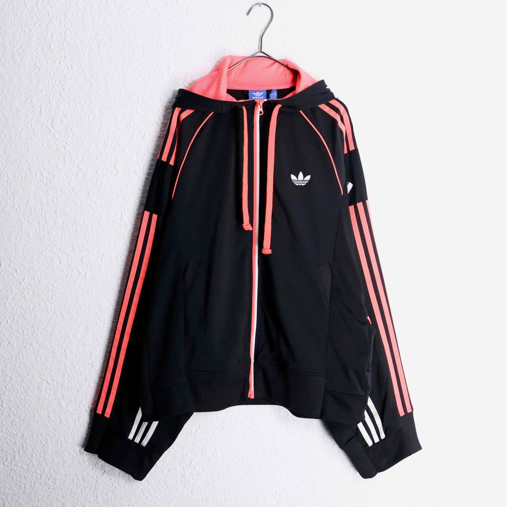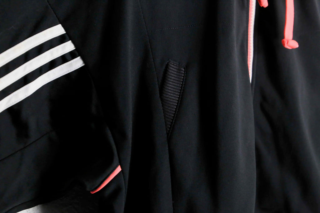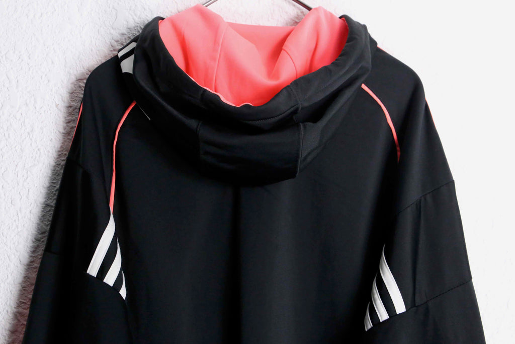 ブラックを基調に、ピンクのラインやジップがアクセントになっており、シンプルながらも目を引くデザインに仕上がっています。フードや袖のラインが全体のバランスを取り、ラフになりすぎず、ほどよくシャープな印象。軽めの素材感で、季節の変わり目には羽織として、寒い時期にはインナーとしても使いやすい一着です。