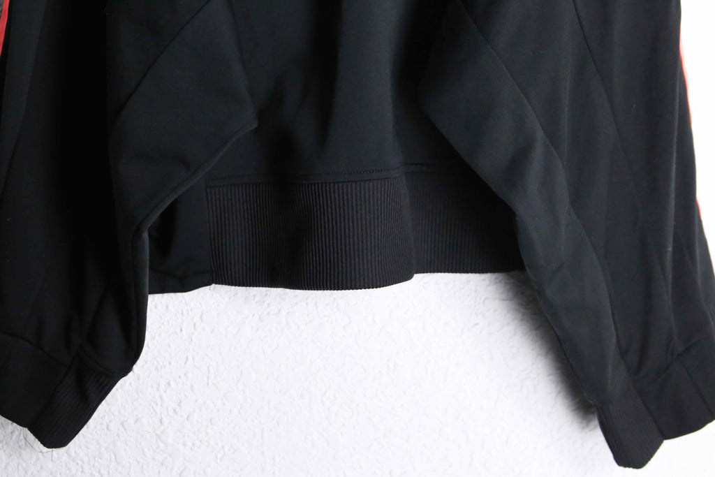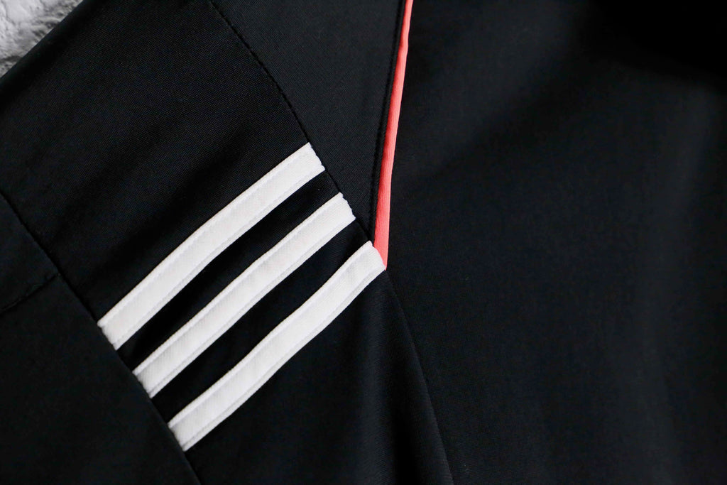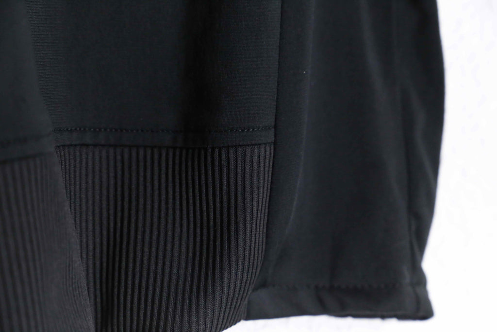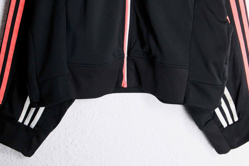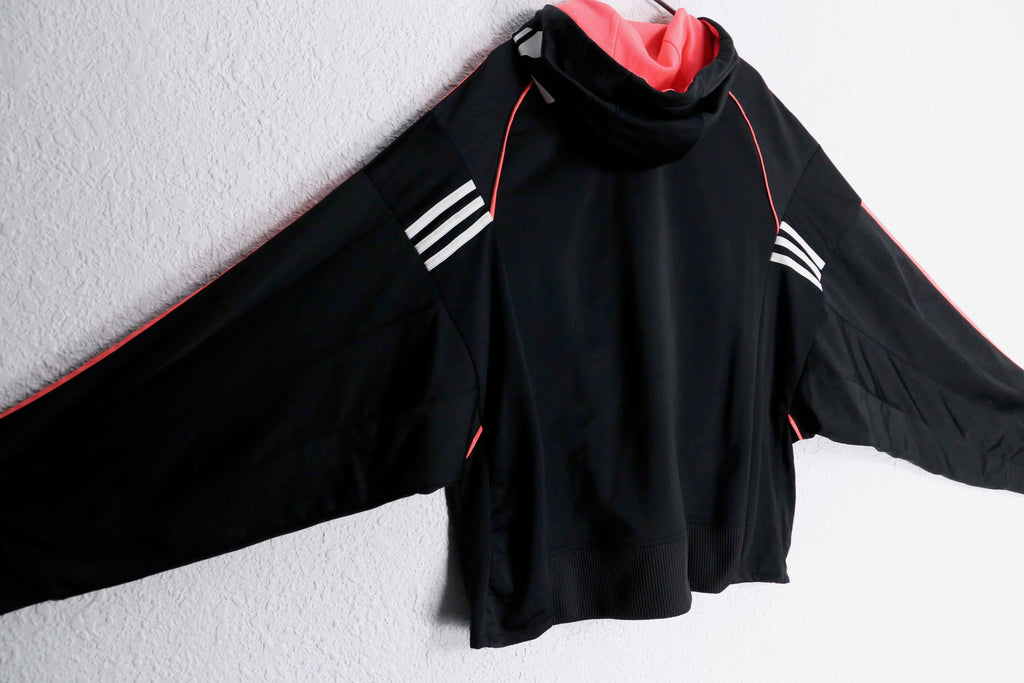 ブラックを基調に、ピンクのラインやジップがアクセントになっており、シンプルながらも目を引くデザインに仕上がっています。フードや袖のラインが全体のバランスを取り、ラフになりすぎず、ほどよくシャープな印象。軽めの素材感で、季節の変わり目には羽織として、寒い時期にはインナーとしても使いやすい一着です。