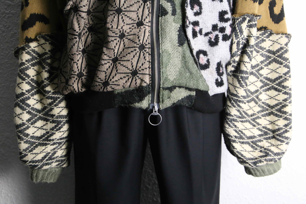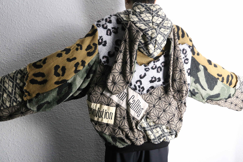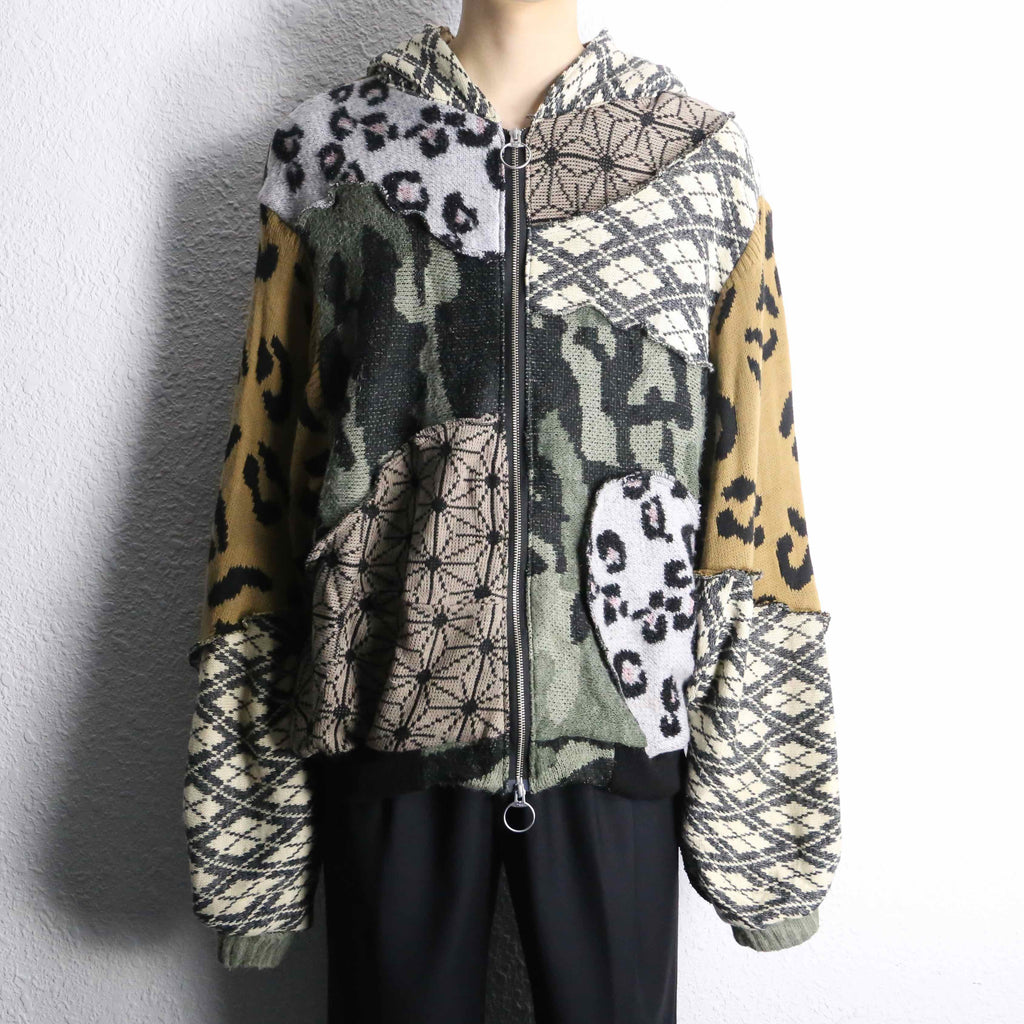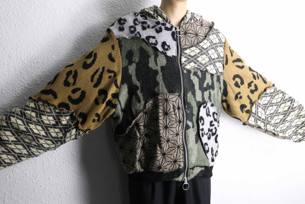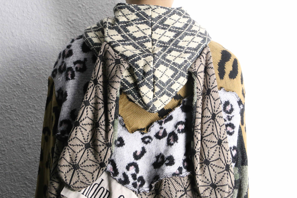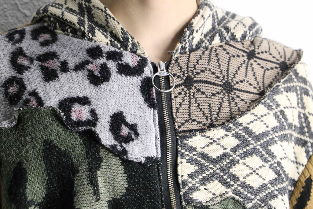 色柄をたっぷり組み合わせた、存在感のあるうさ耳リメイクニットジップフーディーが入荷。