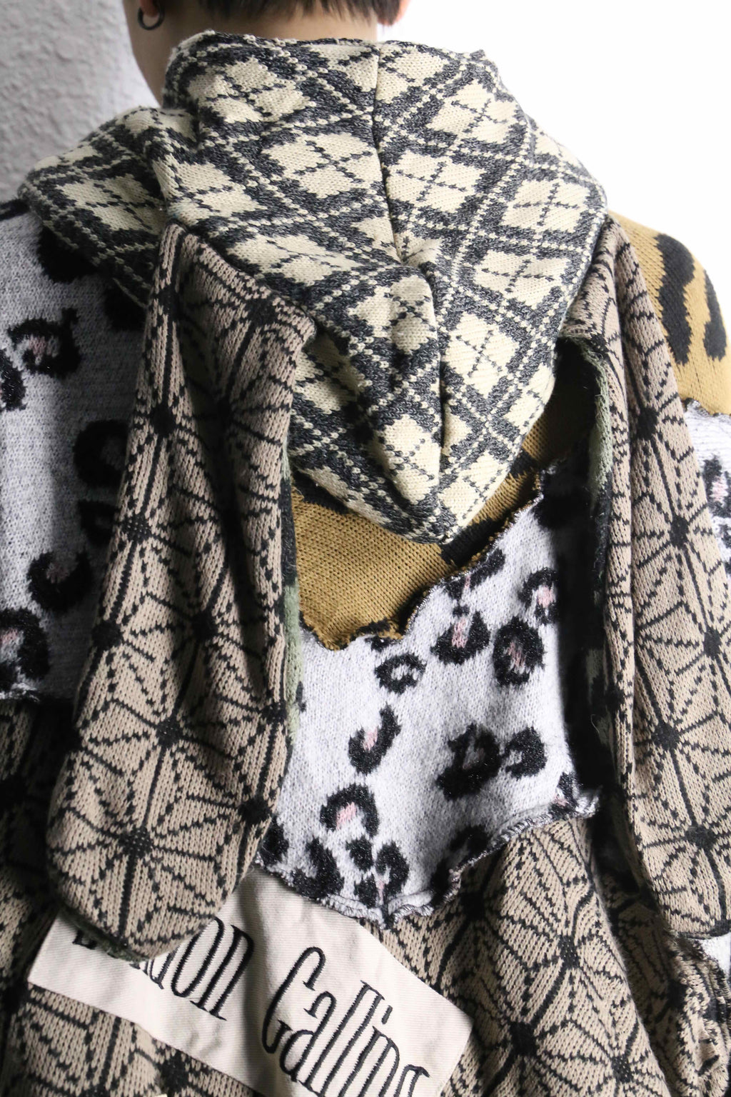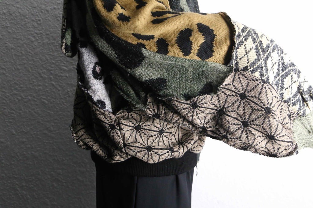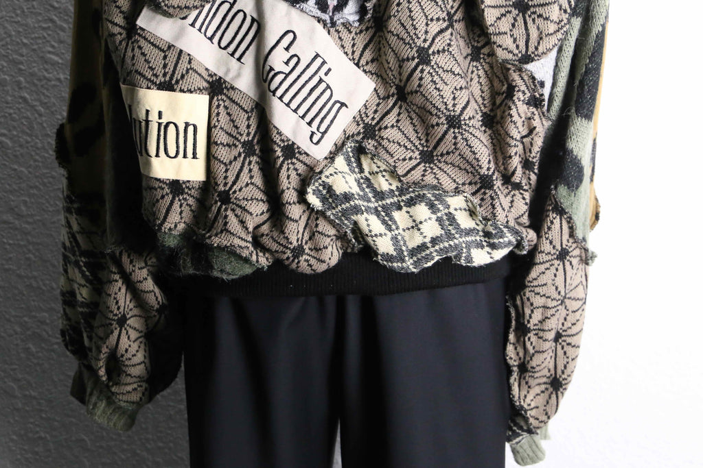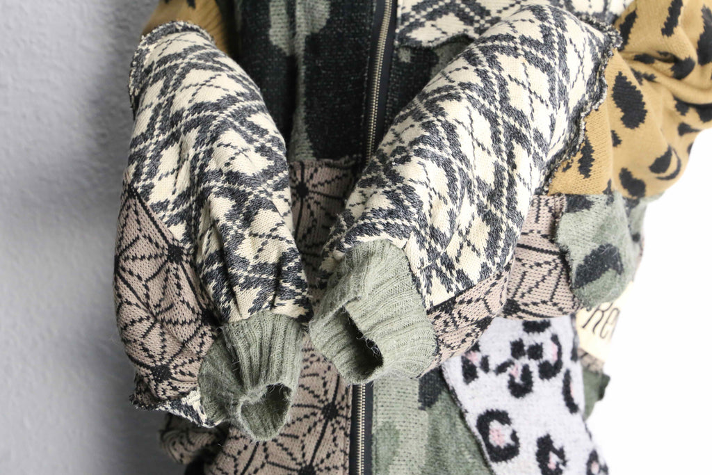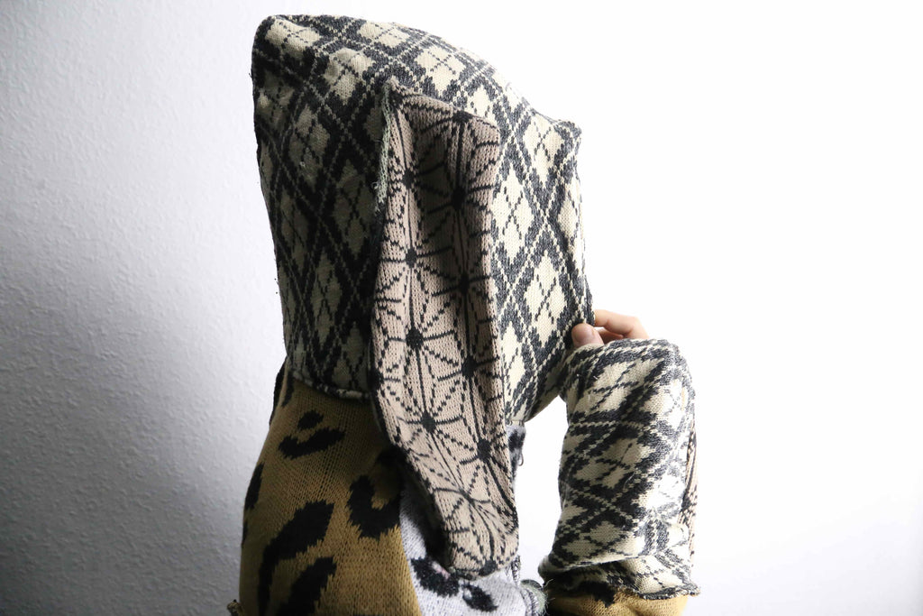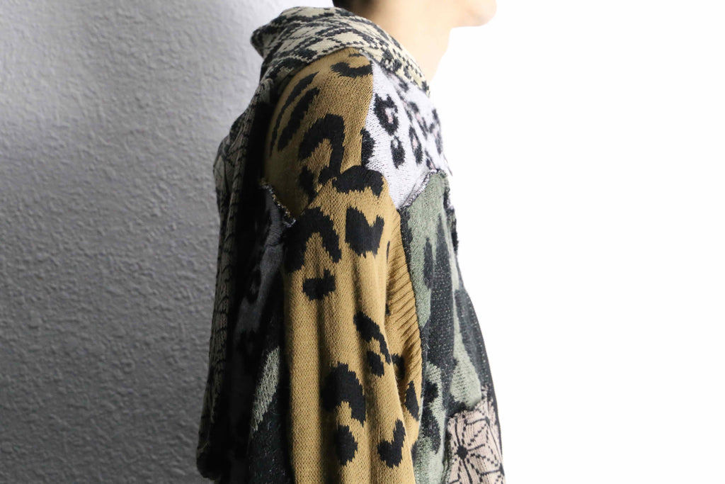 色柄をたっぷり組み合わせた、存在感のあるうさ耳リメイクニットジップフーディーが入荷。