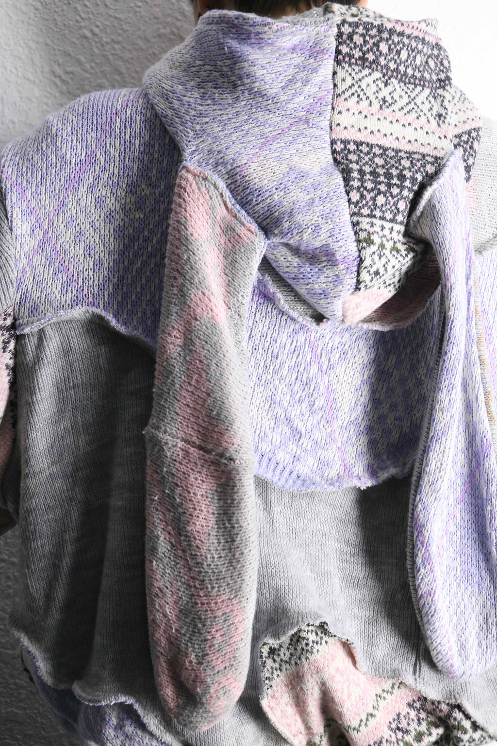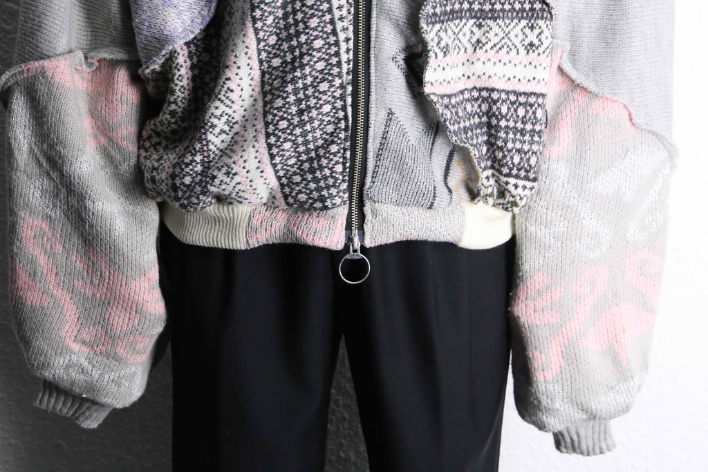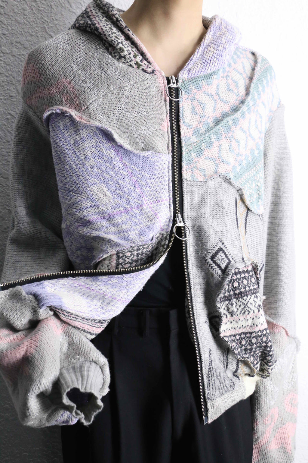 淡いパープルやブルー、グレー、ピンクを基調に、ニットを大胆にパッチワーク。あえて断ち切りのデザインにすることで、立体感と動きのある表情に仕上げました。フロントはダブルジップ仕様で、開け方次第でシルエットのアレンジも楽しめます。ゆったりとした身幅とボリュームスリーブで、ラフに羽織るだけでコーデの主役に。後ろ姿まで抜かりないデザインなので、どの角度から見ても存在感のある一着です。