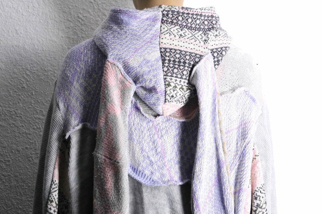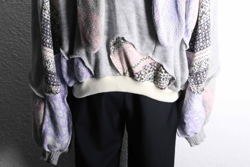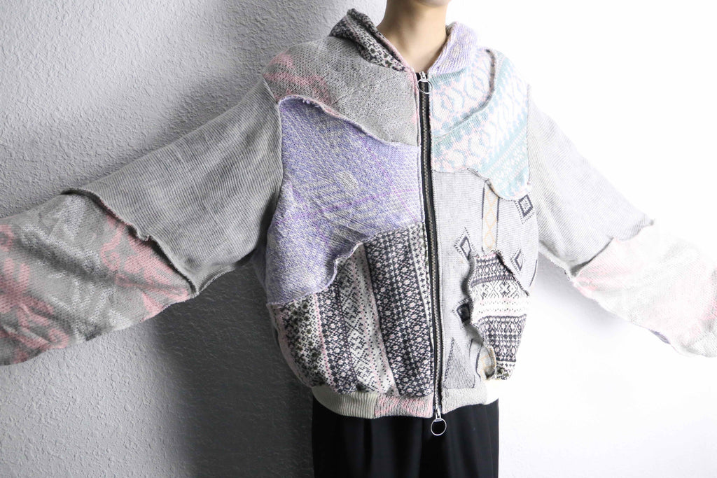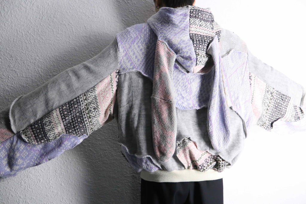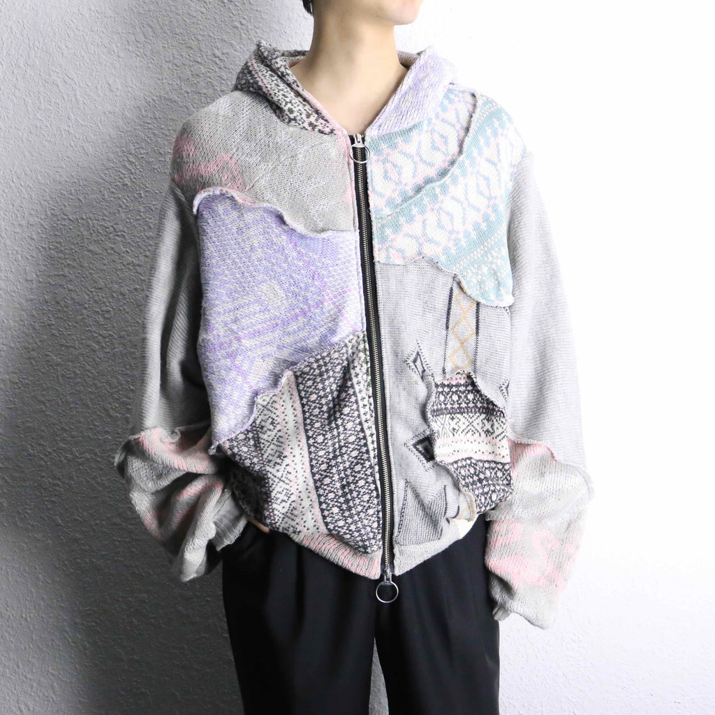 淡いパープルやブルー、グレー、ピンクを基調に、ニットを大胆にパッチワーク。あえて断ち切りのデザインにすることで、立体感と動きのある表情に仕上げました。フロントはダブルジップ仕様で、開け方次第でシルエットのアレンジも楽しめます。ゆったりとした身幅とボリュームスリーブで、ラフに羽織るだけでコーデの主役に。後ろ姿まで抜かりないデザインなので、どの角度から見ても存在感のある一着です。