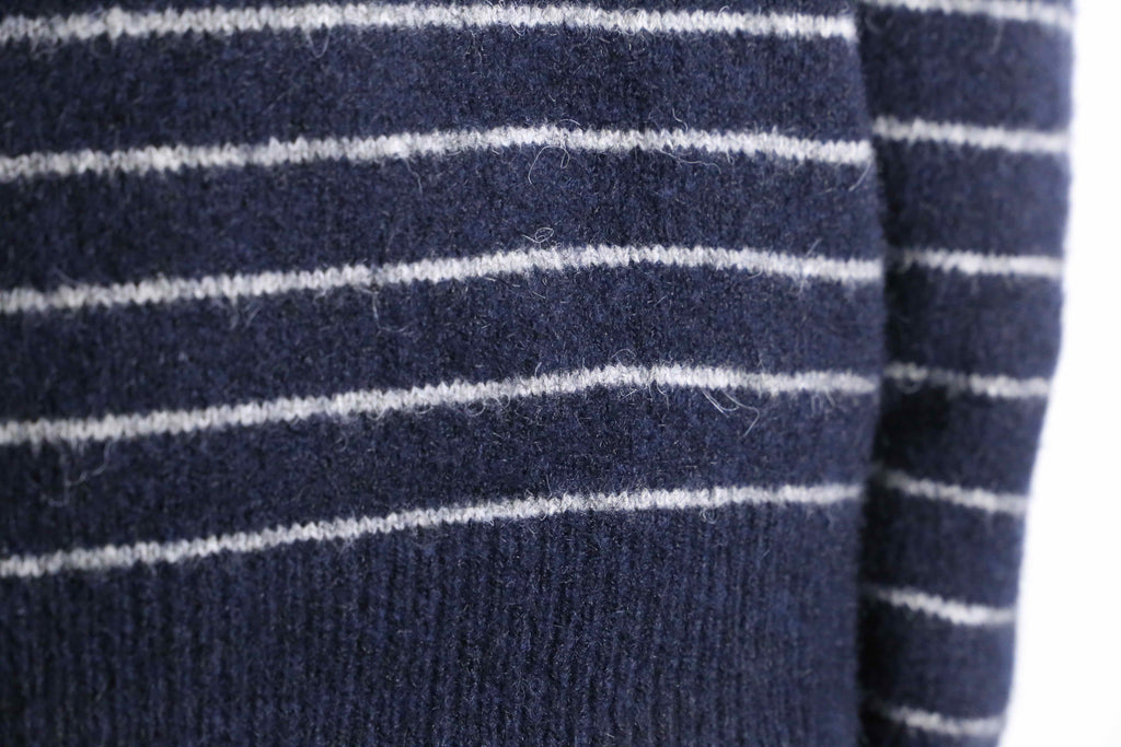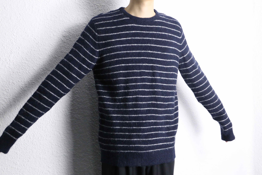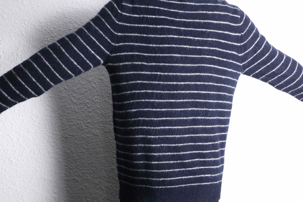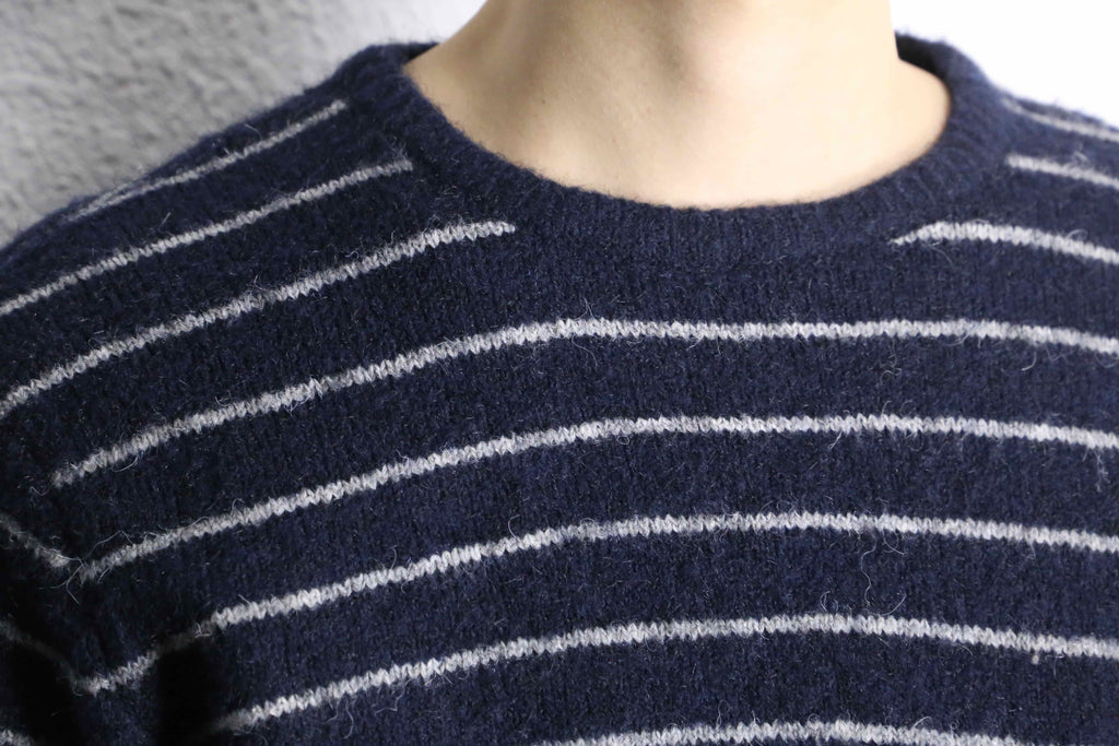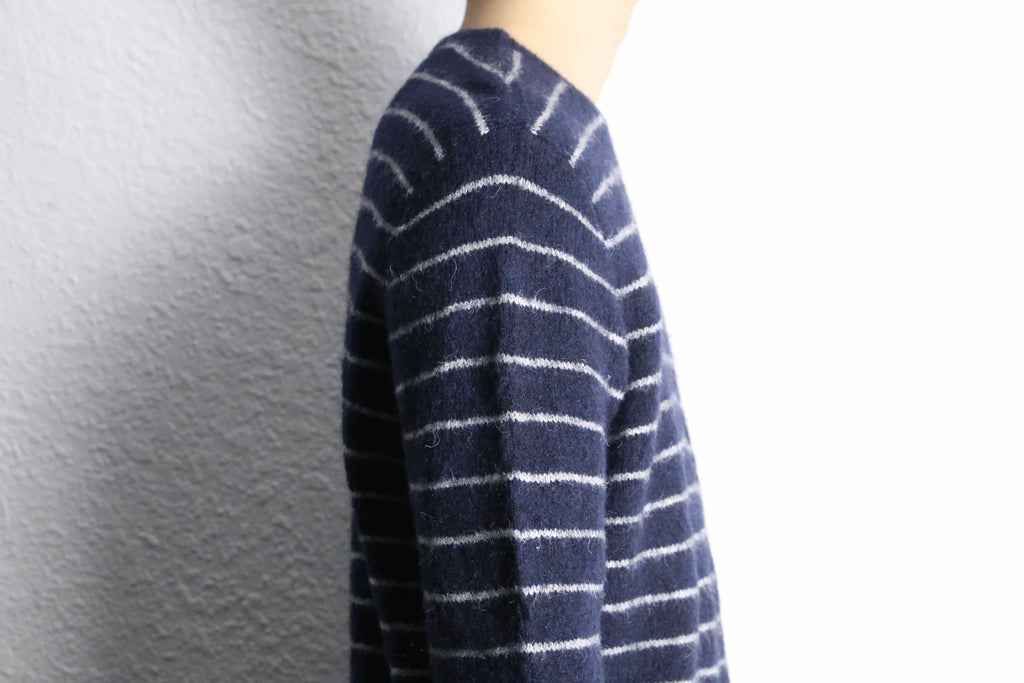落ち着いたネイビーカラーに、細めのホワイトボーダーが入ったシンプルなニットがオンラインに入荷。
