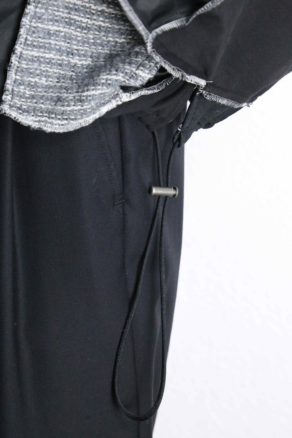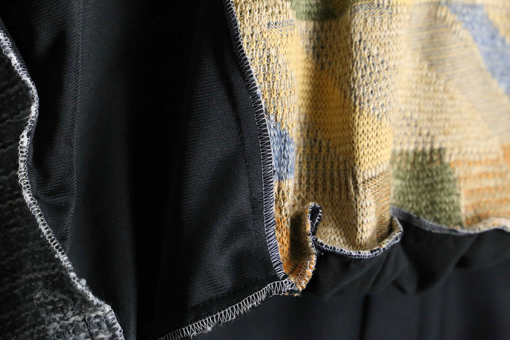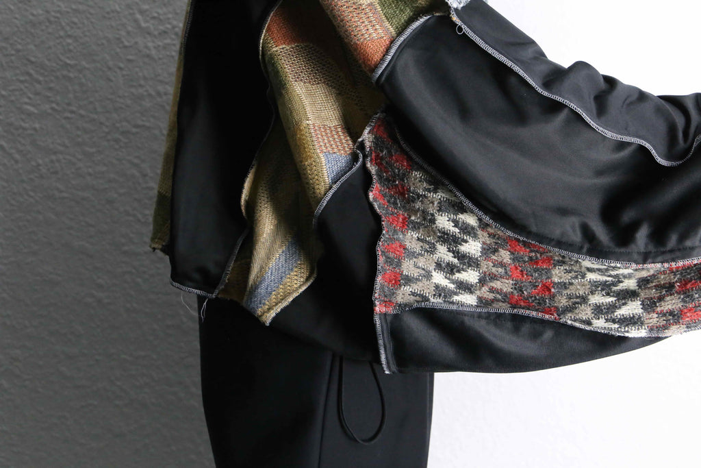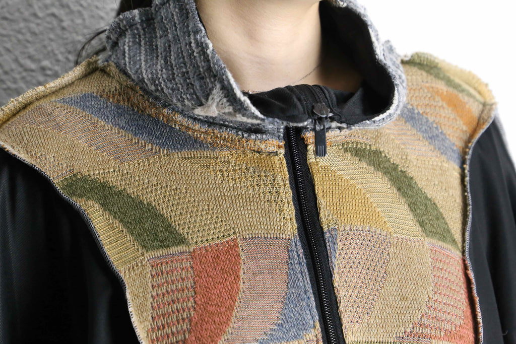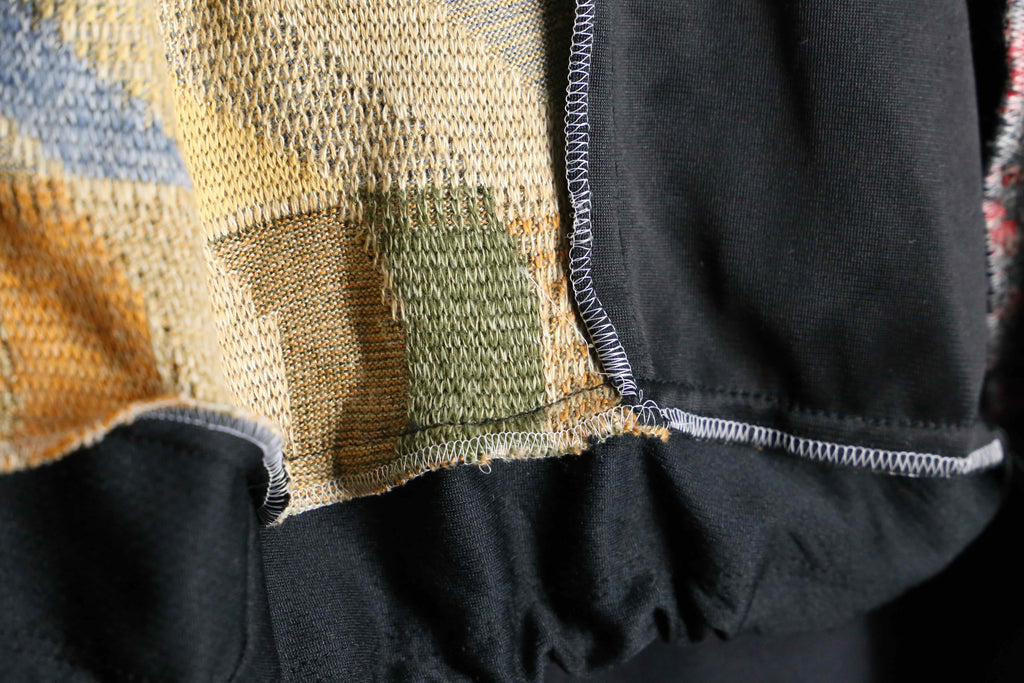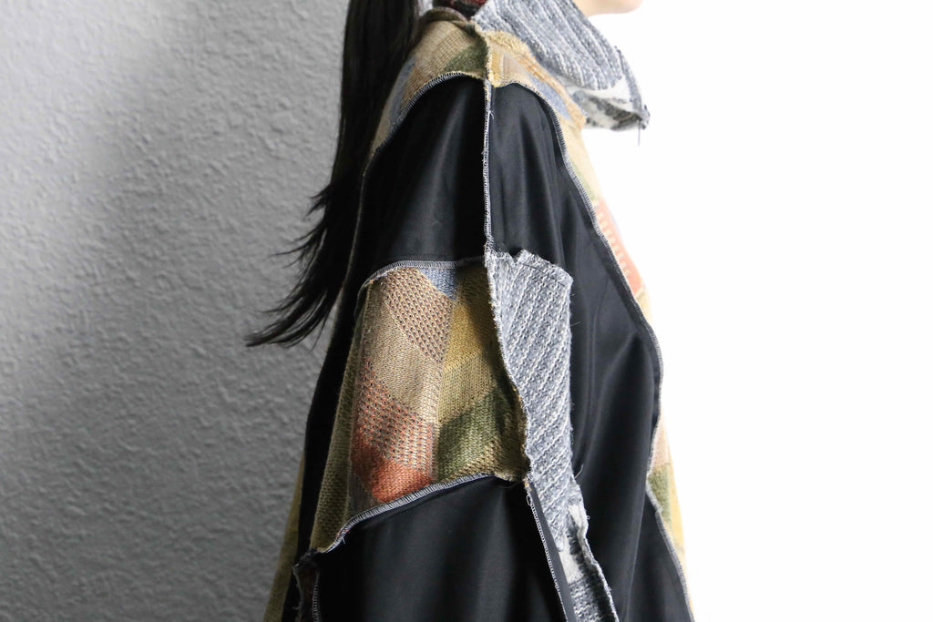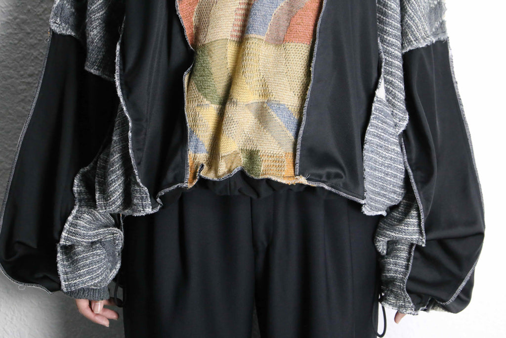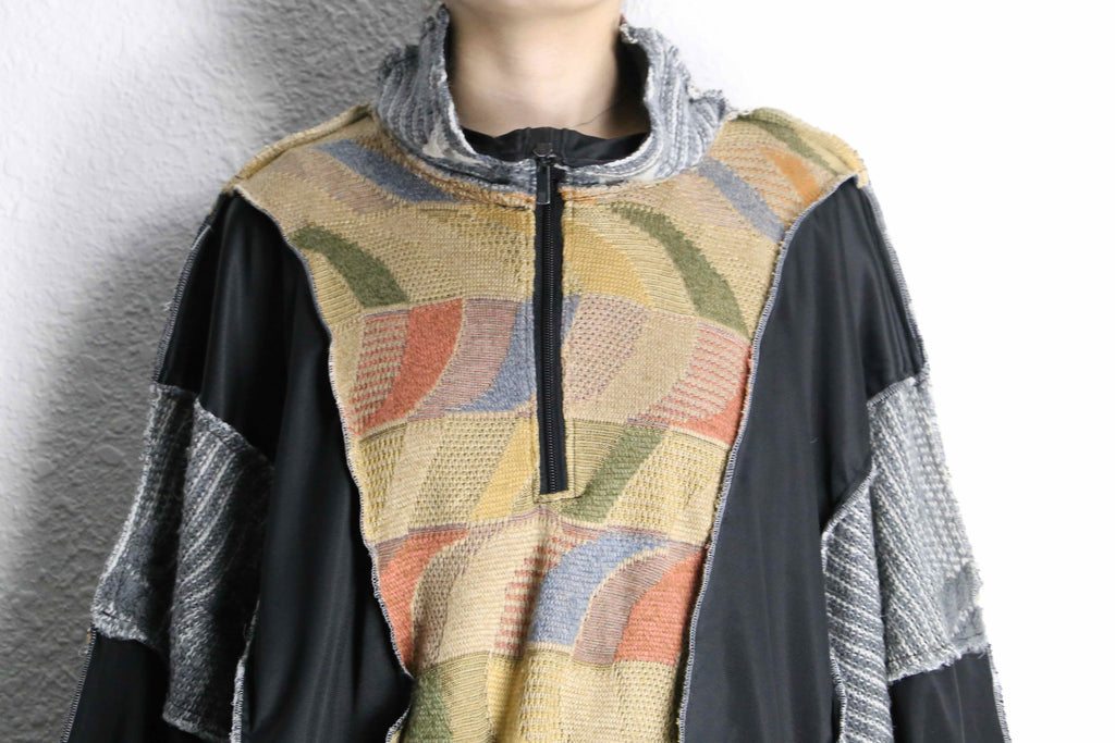 異なる素材とカラーリングの組み合わせが目を引く、存在感のある一着。フロントのニット部分は柔らかく温かみのある質感で、スポーティーなボディとの組み合わせが魅力。切りっぱなしのディテールや立体的なシルエットが、リメイクならではのラフさと個性を引き立てています。