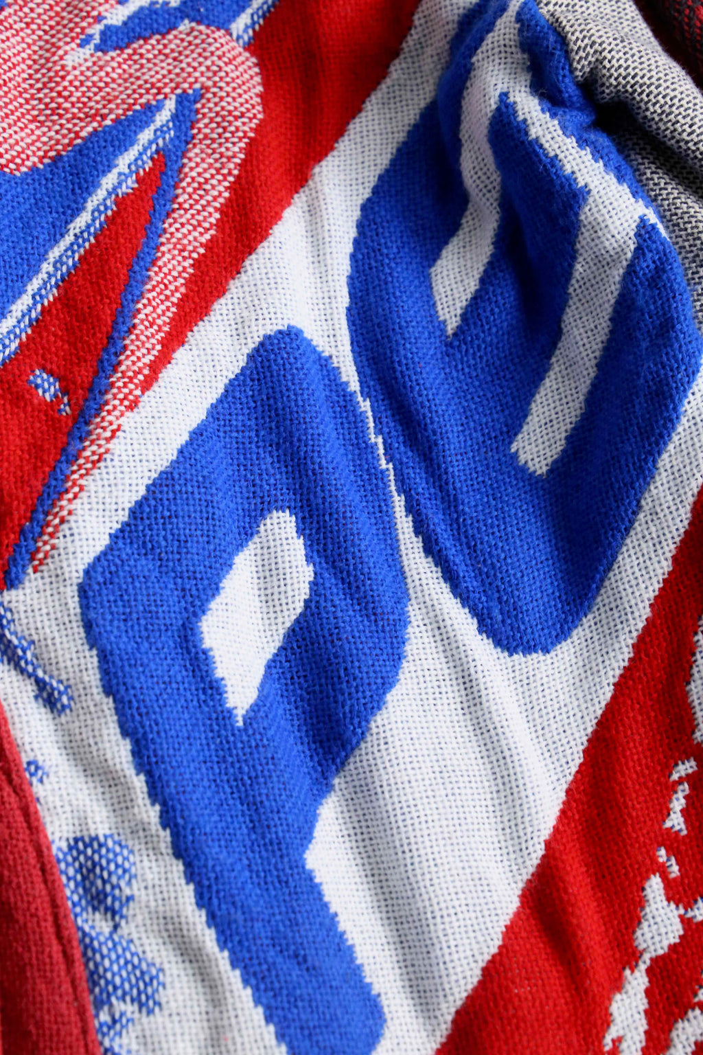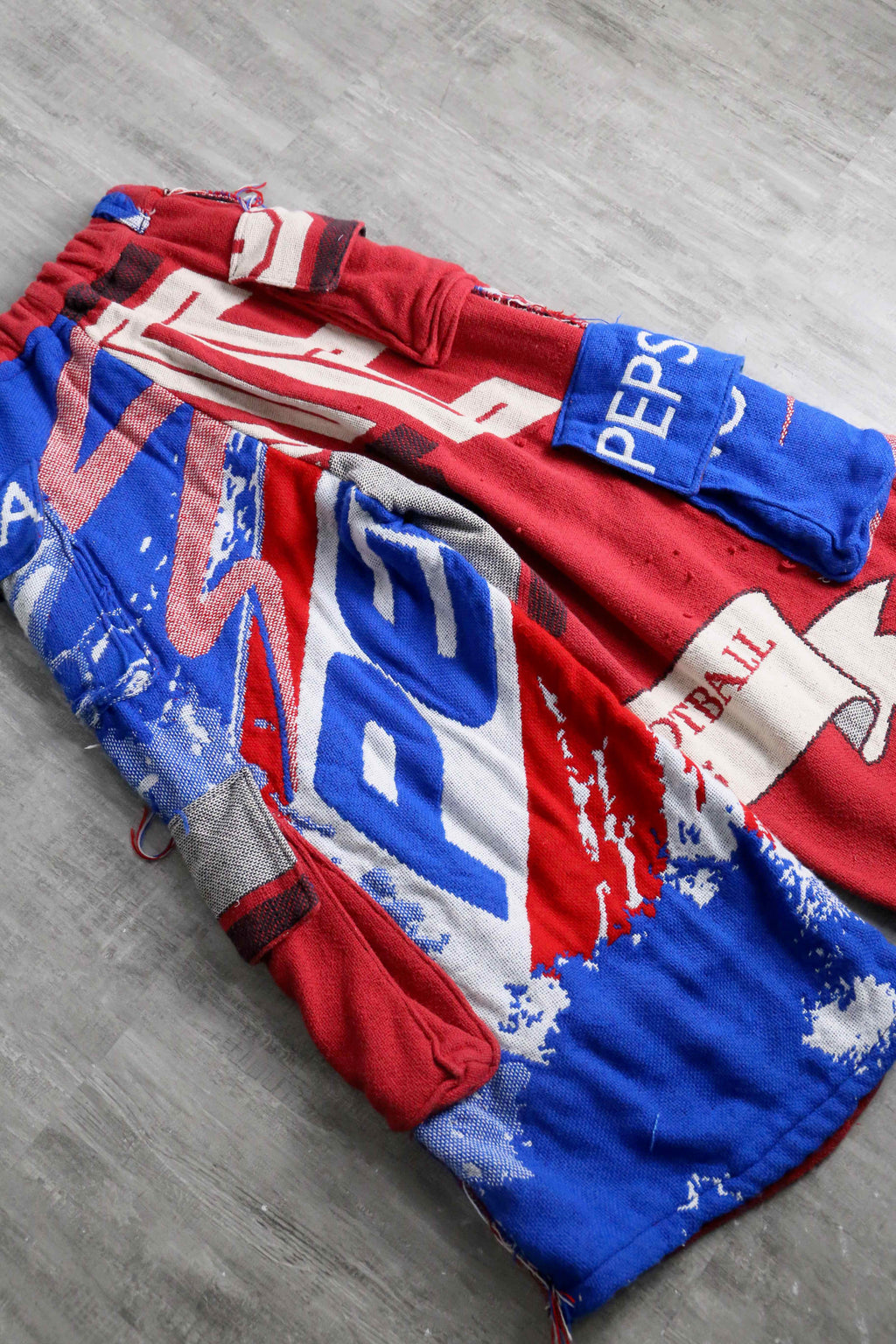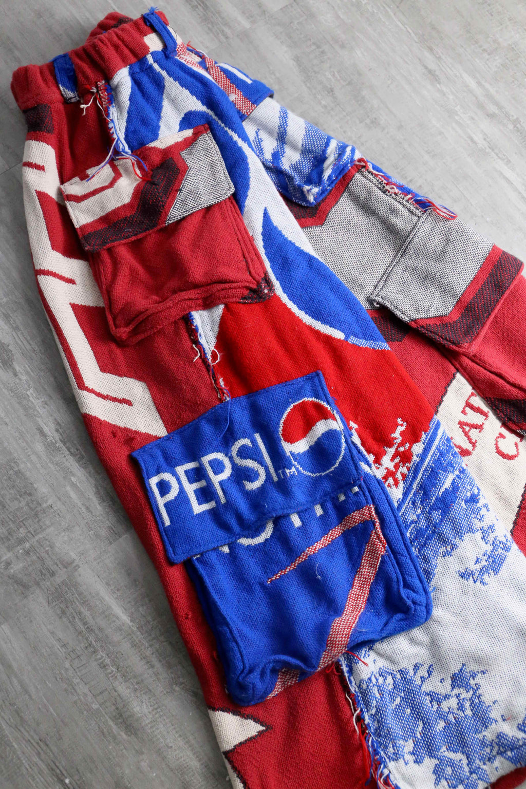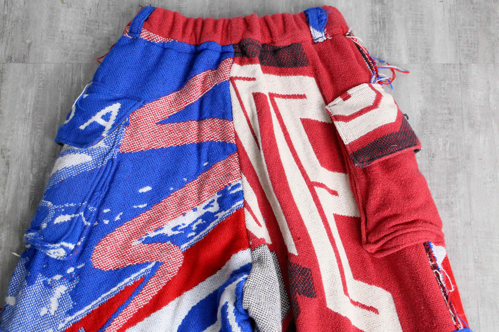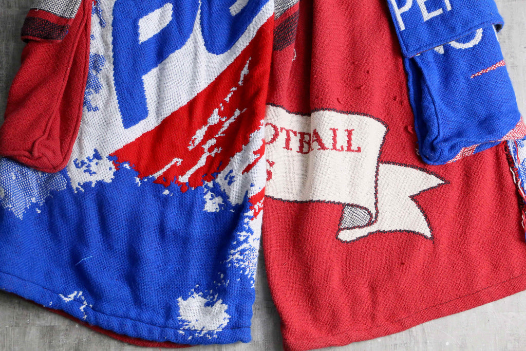 ビンテージのラグを使用し、リメイクではの風合いとしっかりとした生地感が特徴です。赤・青・ホワイトの大胆な配色に加え、パッチワークやポケットディテールを施すことで、遊び心のあるデザインに仕上げています。