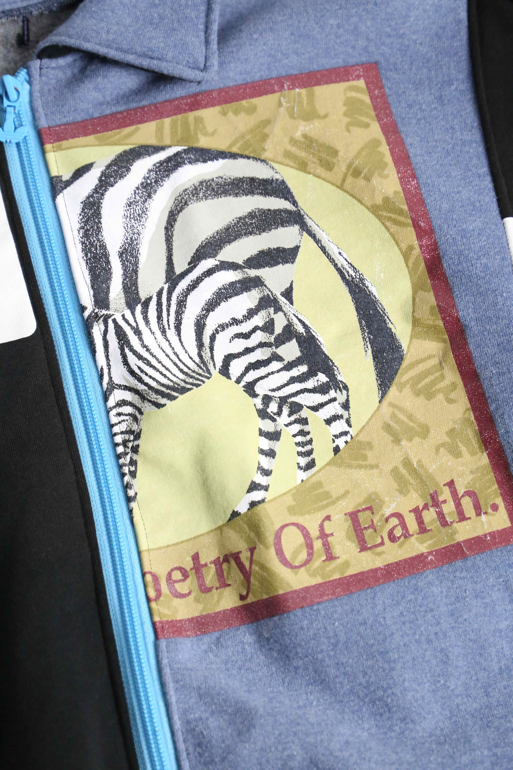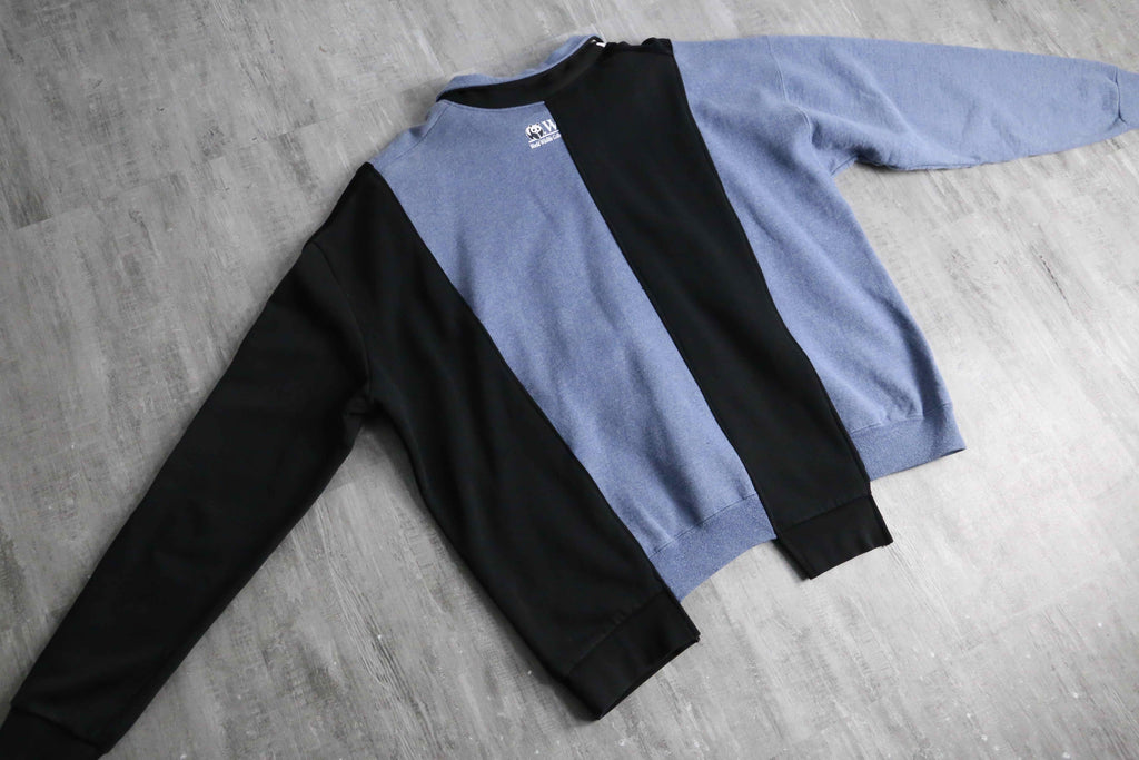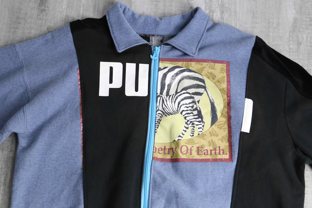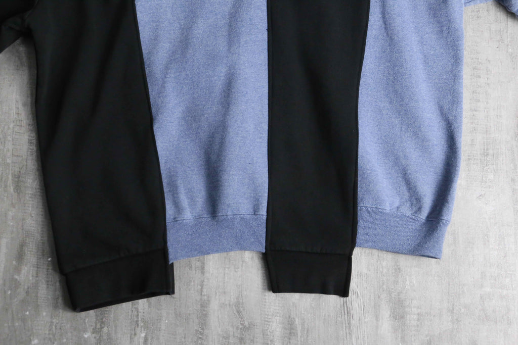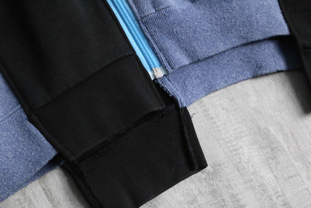 異なる2週類のグッドなノリのスウェットを1枚のジップジャケットにまとめあげたリメイクのらしさが詰まった1着。シルエットは一般的なデザインながらも、細部にはスウェットのリブをそのまま使用しているために唯一無二の着用感。
