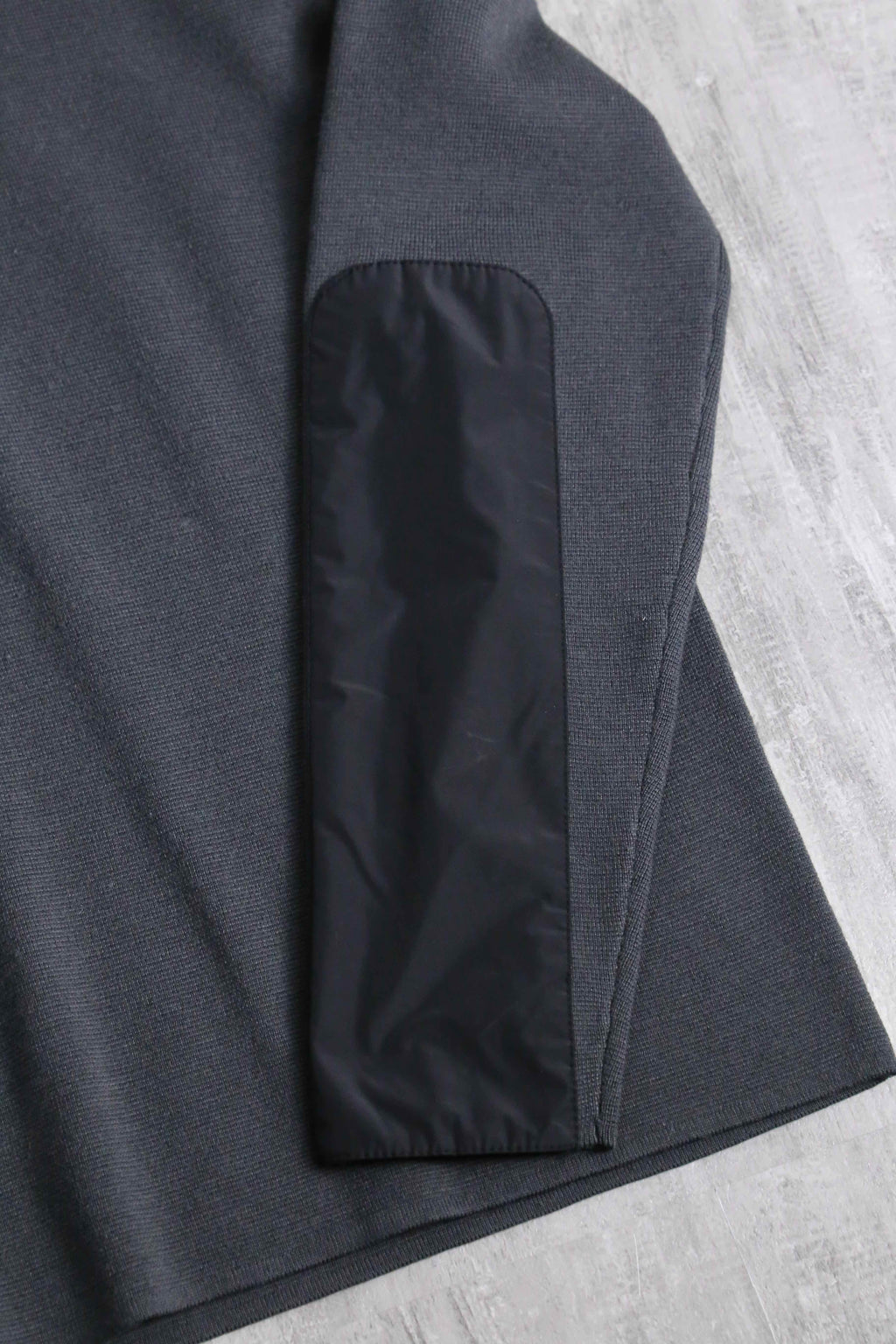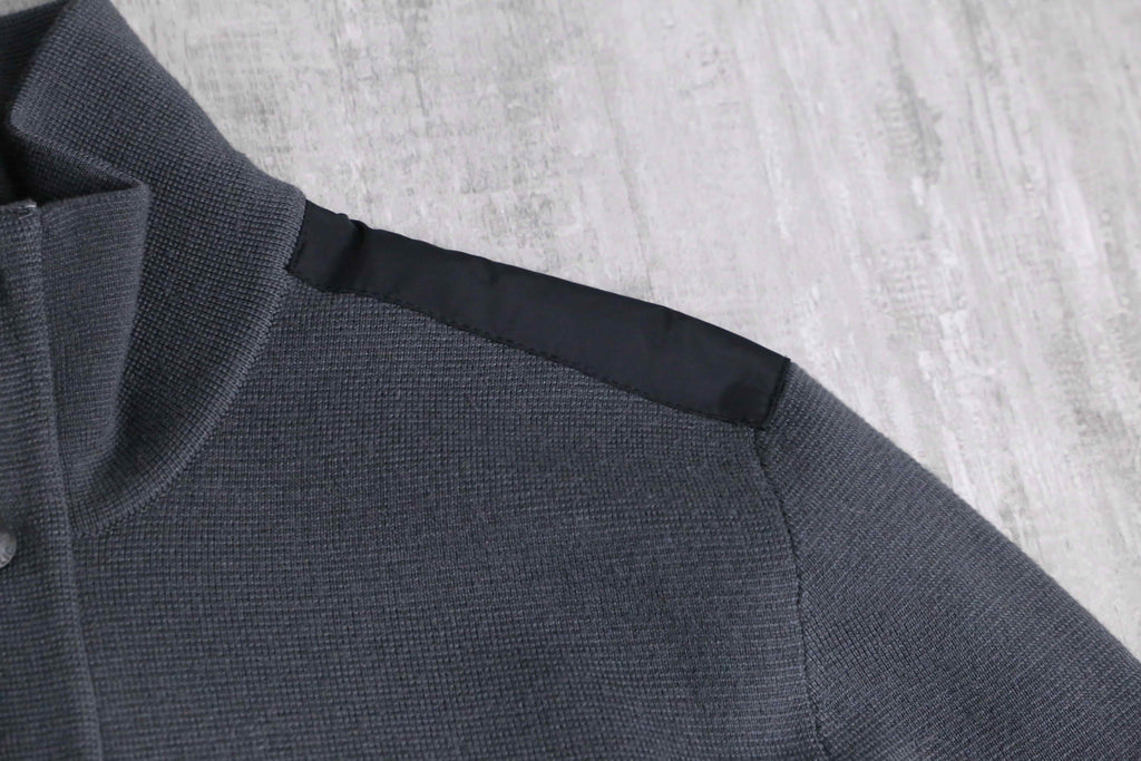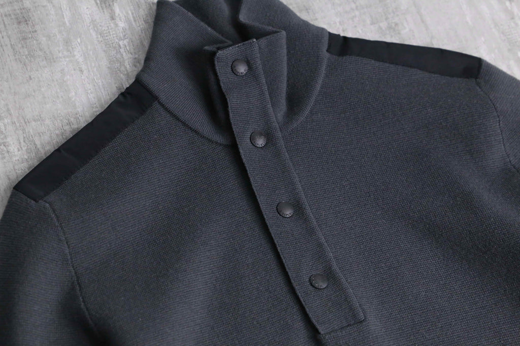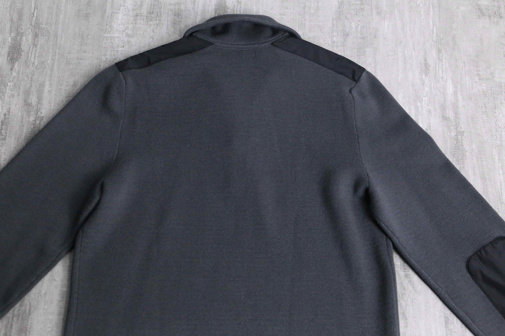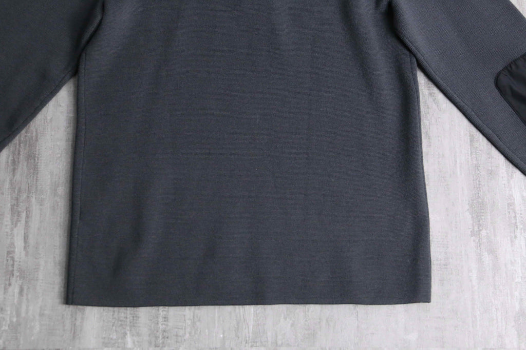 ポリエステルの含有量が多いおかげが暖かみがあるにも関わらず肌触りが良く軽やかな質感。肩と肘部分にはコマンドセーターのようなディテール。更にはスナップボタンという事もあり1枚着からインナー遣いどちらも向いてそうです。