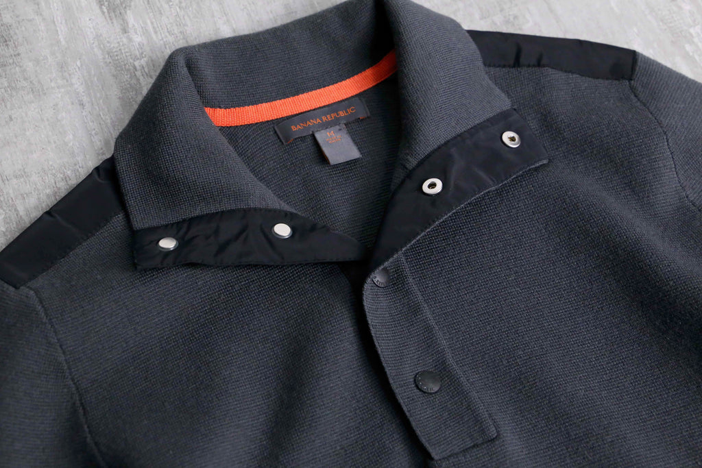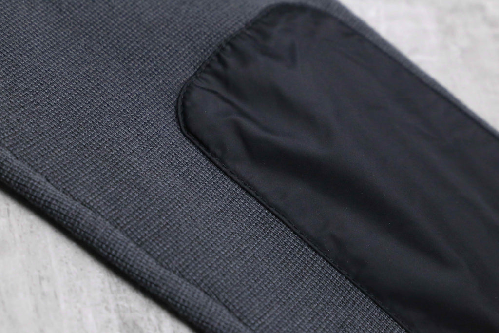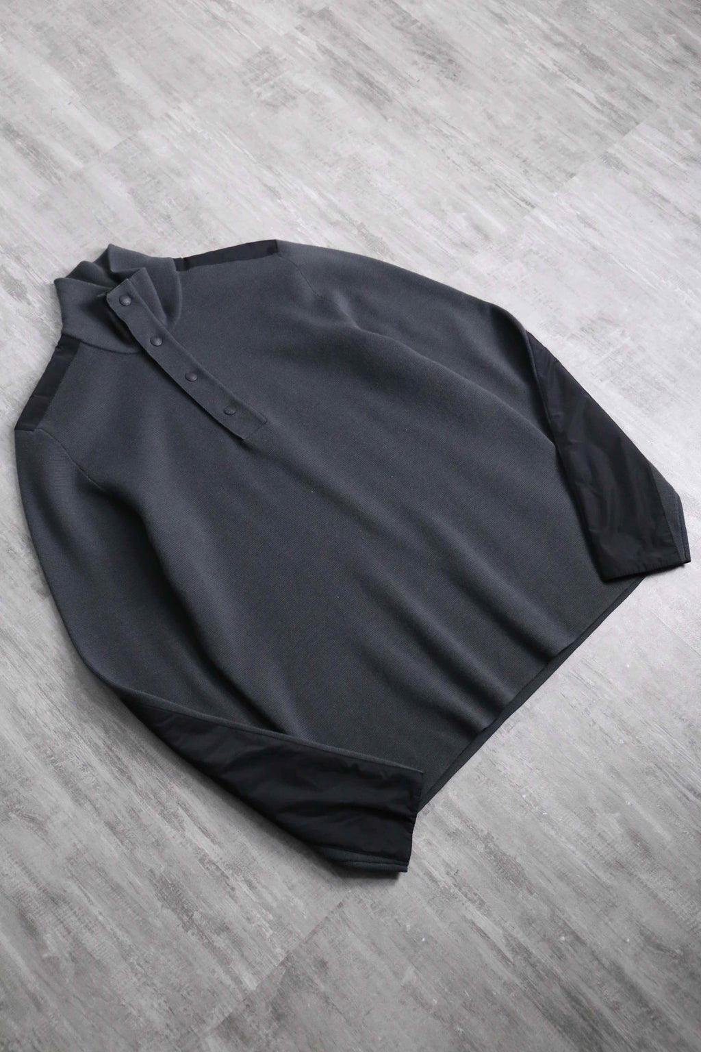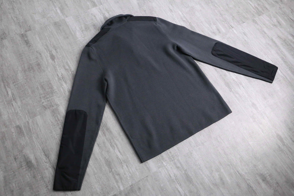 ポリエステルの含有量が多いおかげが暖かみがあるにも関わらず肌触りが良く軽やかな質感。肩と肘部分にはコマンドセーターのようなディテール。更にはスナップボタンという事もあり1枚着からインナー遣いどちらも向いてそうです。