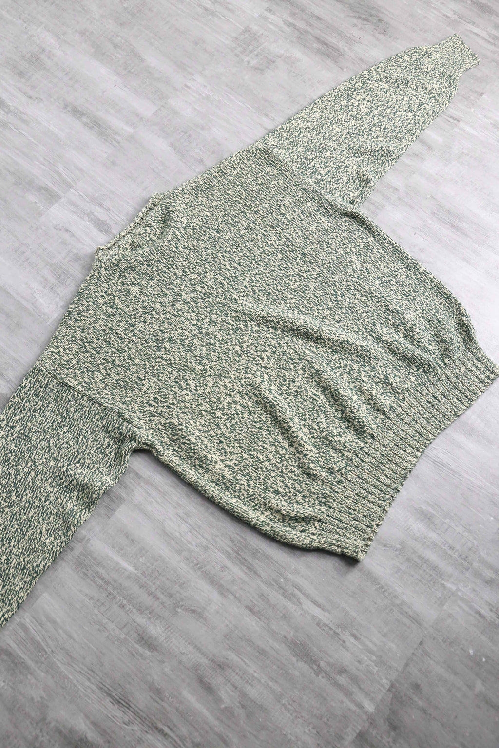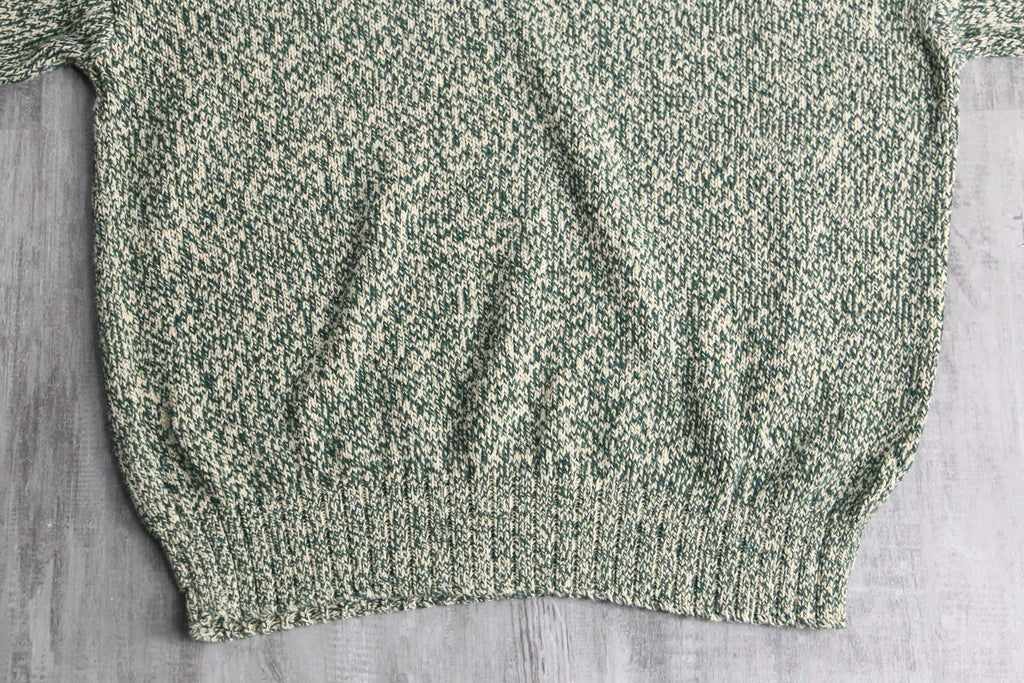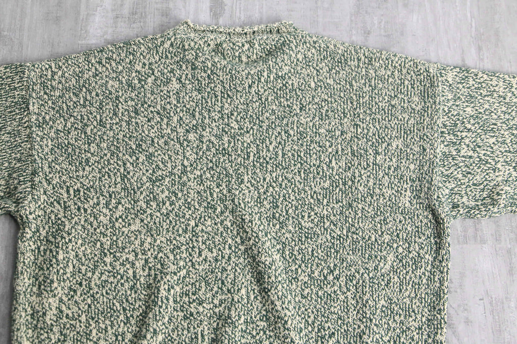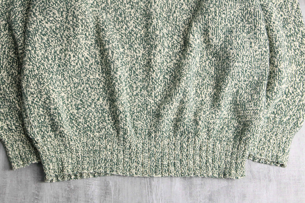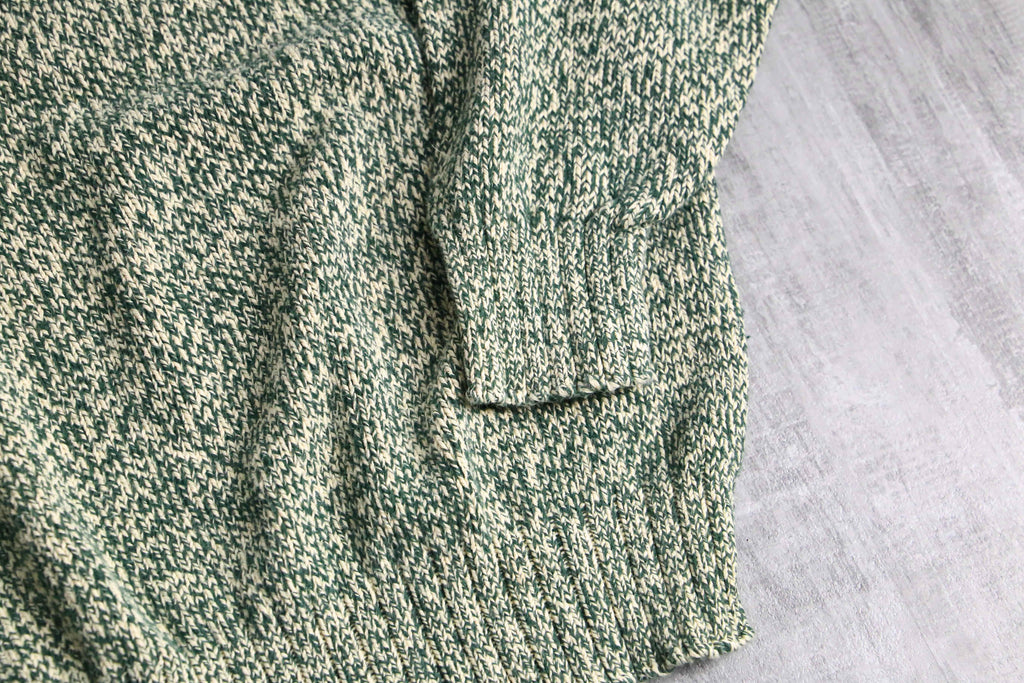 がさつかない柔らかいコットン生地で緑を基調とした混色。裾にリブ、襟元はロールネックの簡素な仕様。