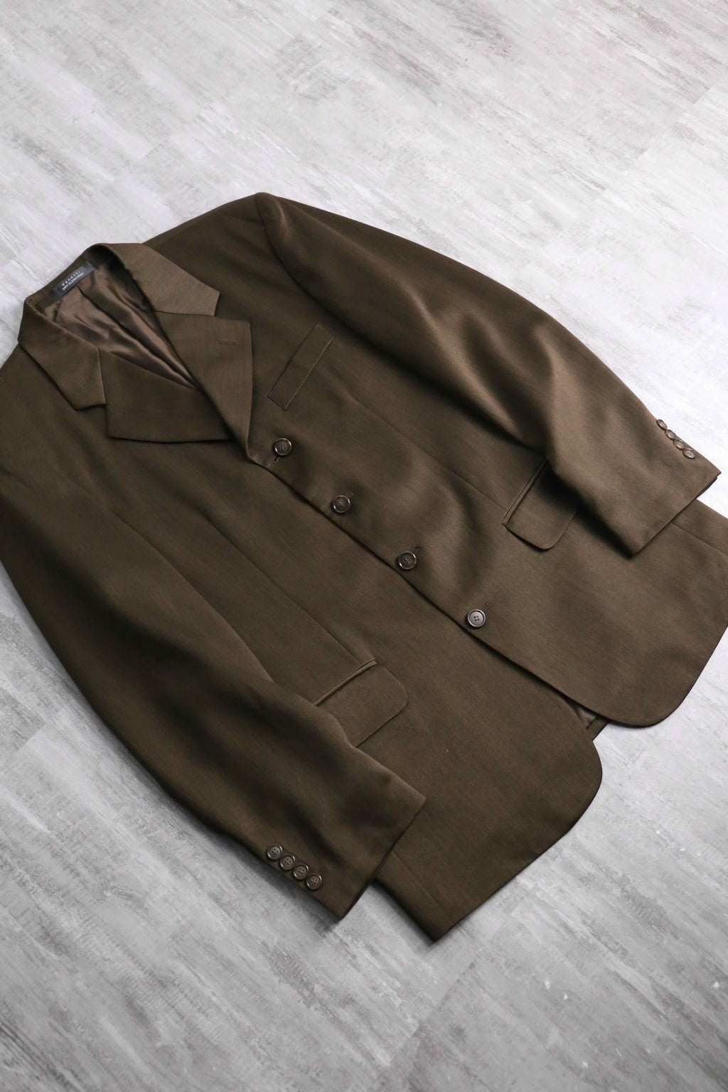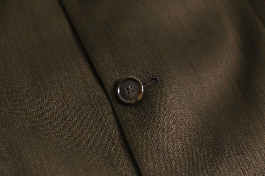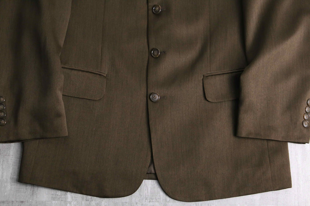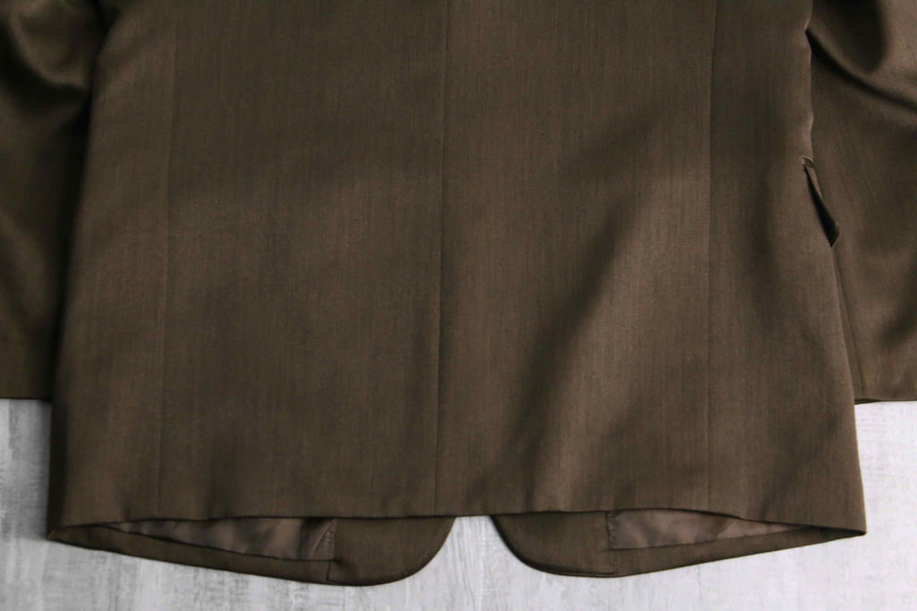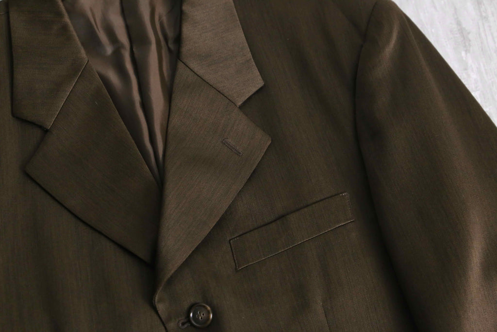 今ではあまり見かけない4つ釦仕様のテーラードジャケット。スーツシーンからはやや距離のあるディテールだからこそ、ファッションとして取り入れやすいのかと。ポリ特有の程よい光沢感もあり、スタイリングのアクセントとしてもおすすめできる1着です。ぜひ。