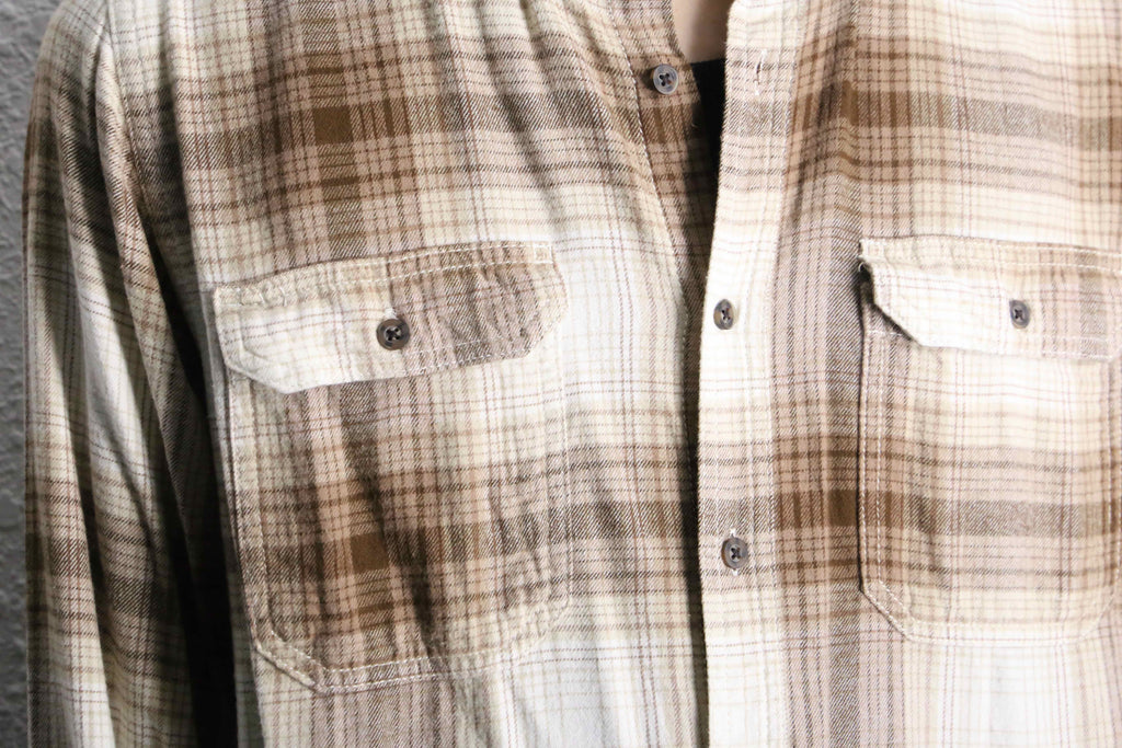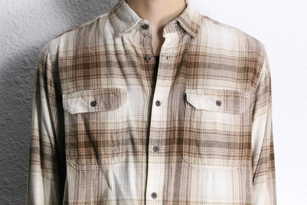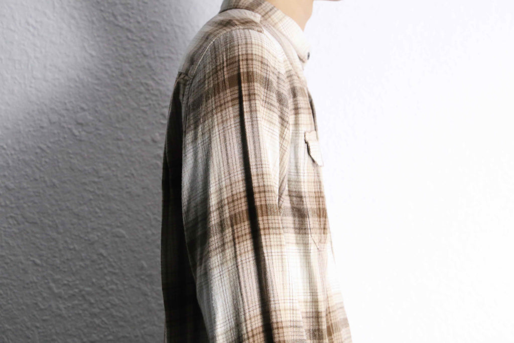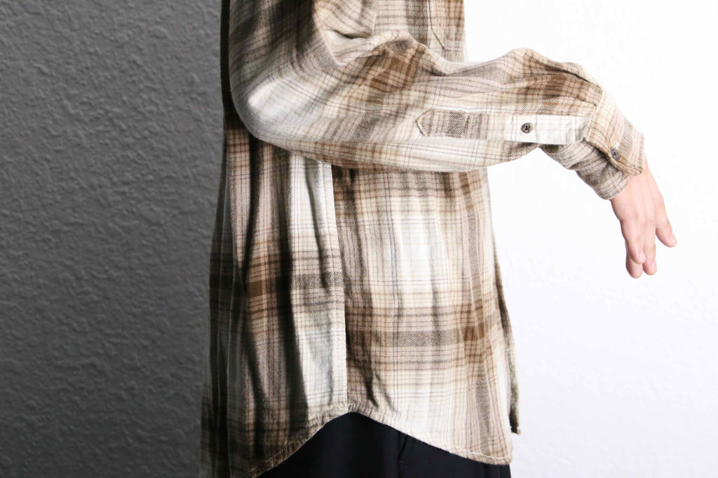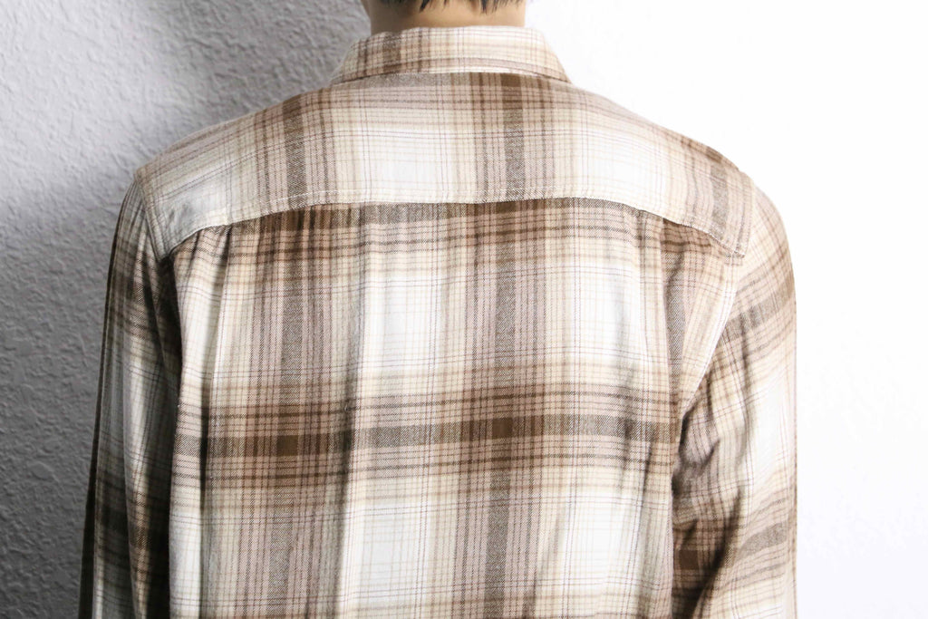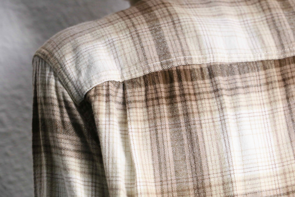 混紡の軽やかで肌触りの良い質感はもちろんのことシンプルなベースに茶系のチェックは個人的にすごく好みです。更にはフラップポケットなディテールにより内側ではなく1枚で着用する際にも使えるのは嬉しいですね。今時期から肌寒い時期に向けてぜひ。