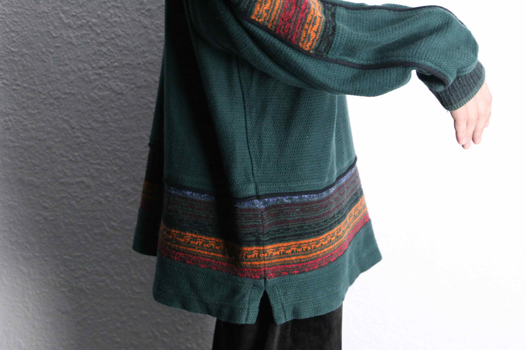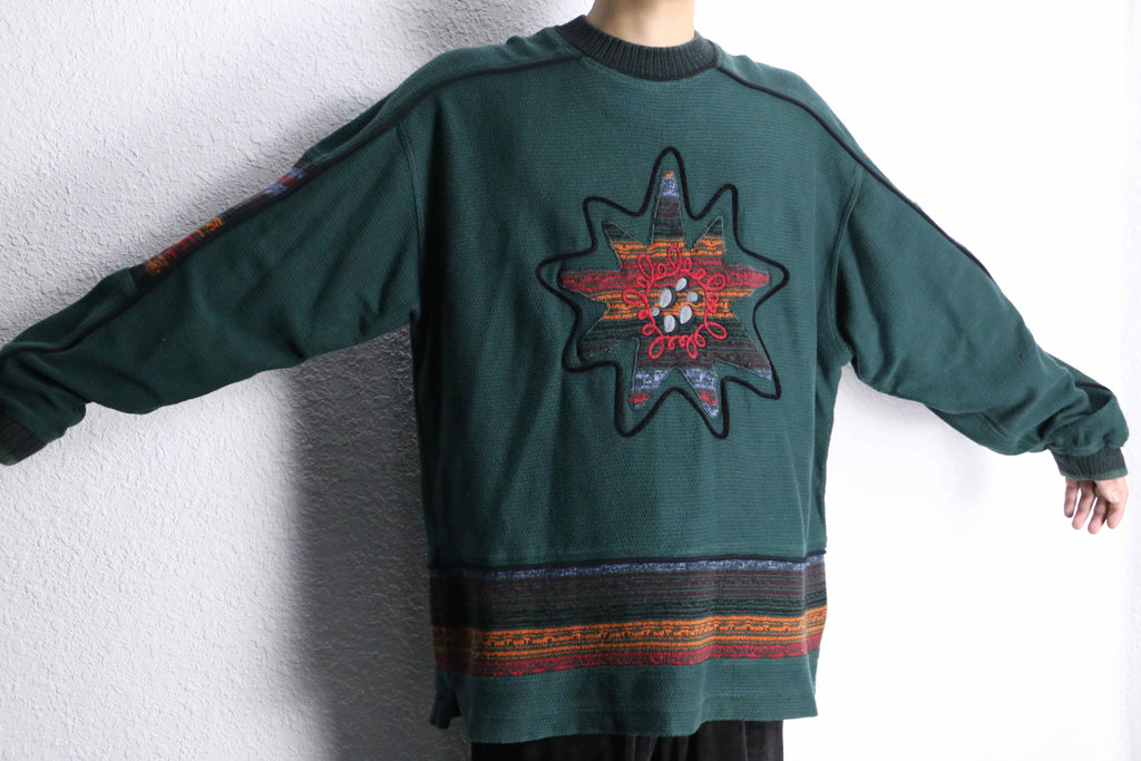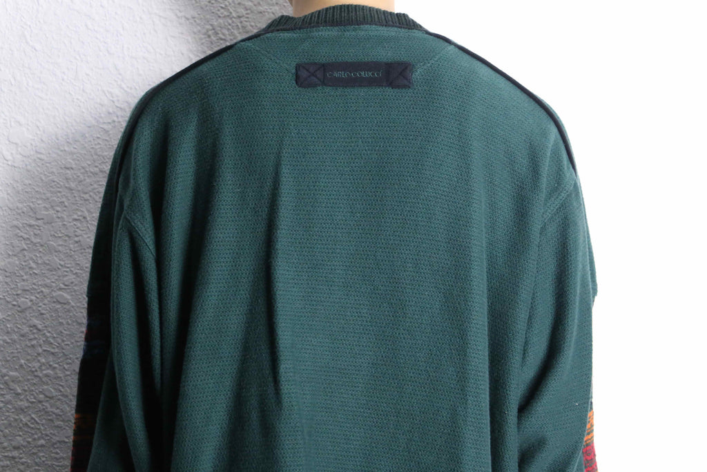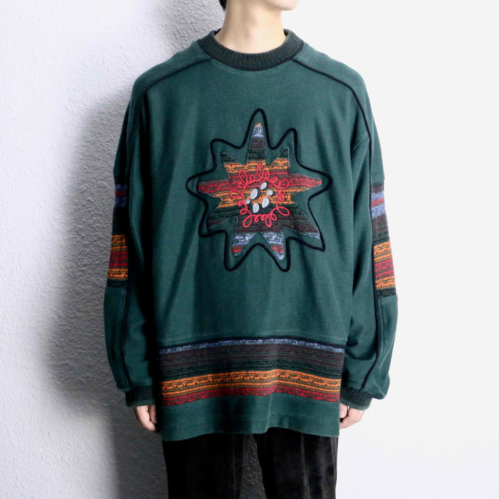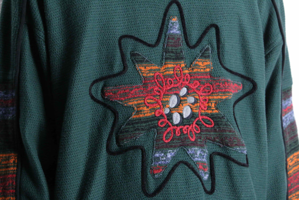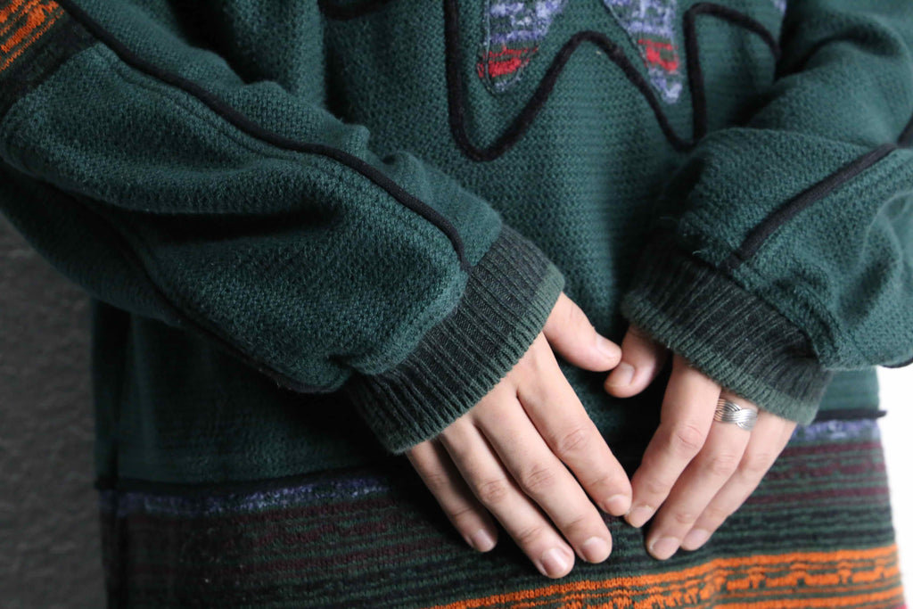 前面には花のような刺繍、下部には3Dニットでよく見られる多色ボーダー、さらにパイピングもあしらわれており、コットンニットの中でもかなりデザイン性の豊かな1着です。