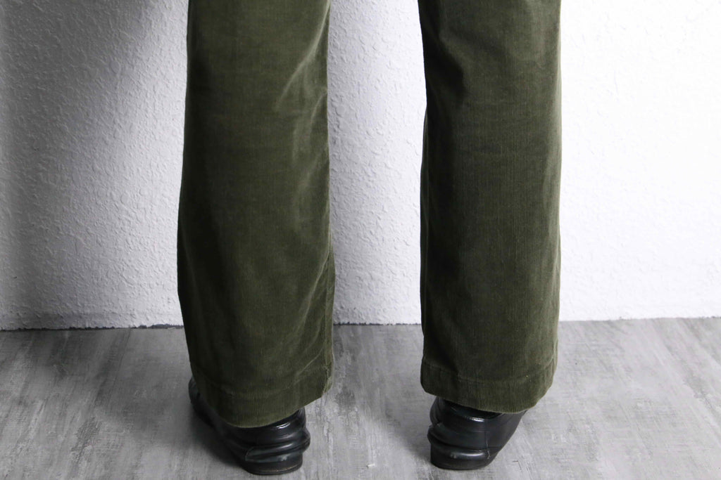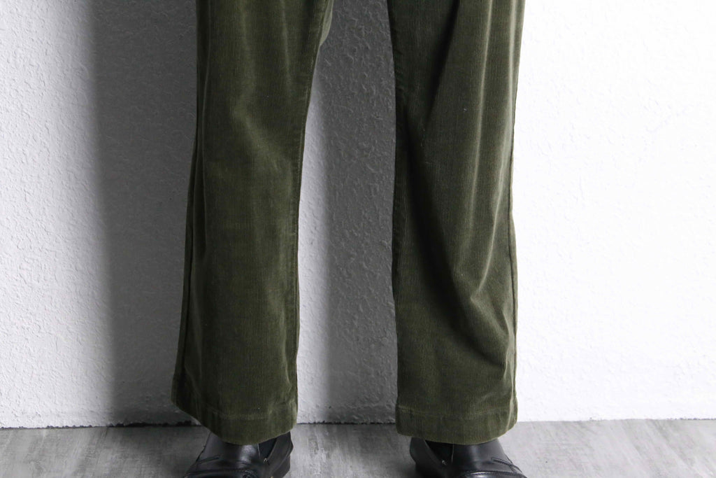 コーデュロイパンツというとかなり太めのシルエットが多い印象ですが、こちらはその中でも程よい太さの1着。細畝でいて、ほんのりと光沢を帯びた生地感はレザーシューズとも好相性です。ぜひ。