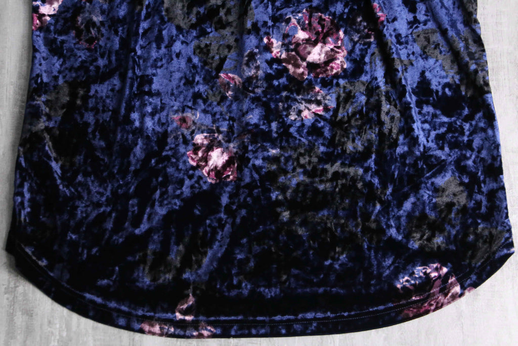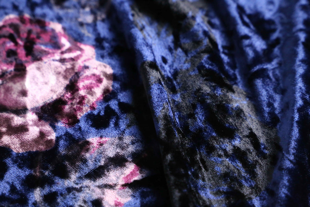 ベロアアイテムにも、ポリ系ナイロン系アセテート系等、素材によって重厚感や見え方が変わってくるのですが、此方はポリ100%による見た目の重厚感が確り伝わる造り。更には、濃青ベースに薄桃色や黒が入った大人らしさも相まっての1着。