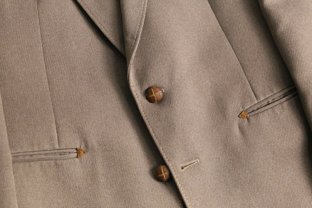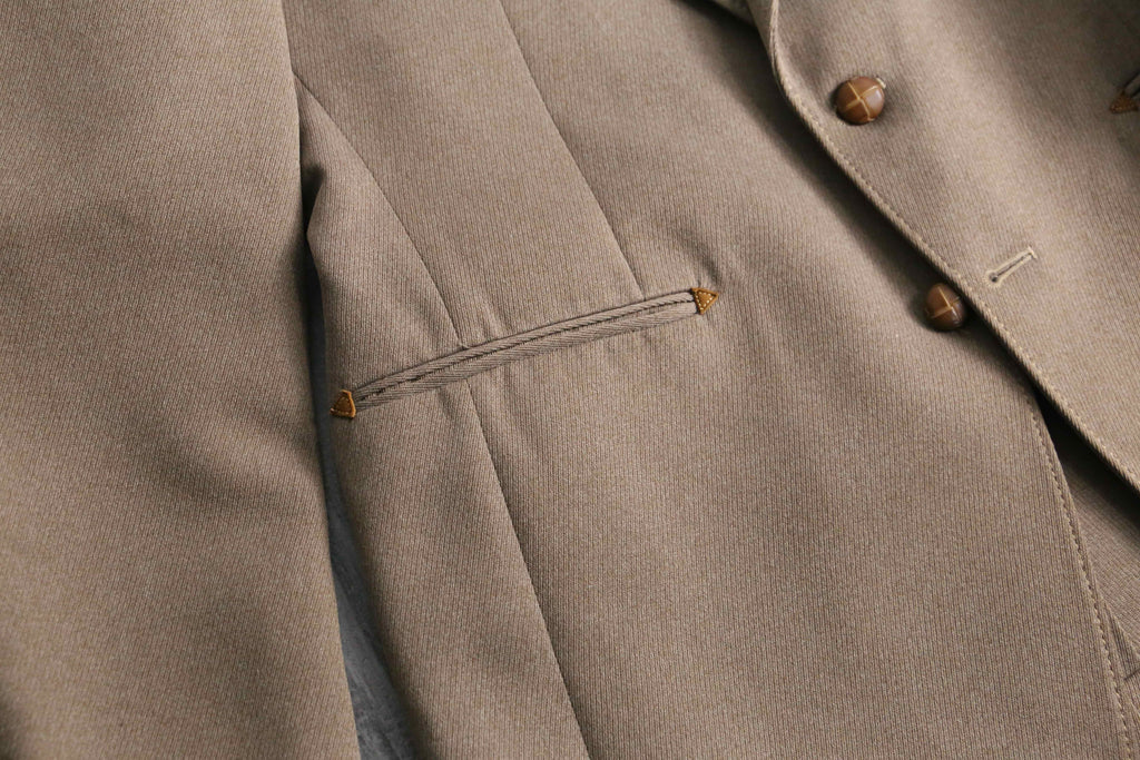 茶系に対してほぼ同一の杢っぽい、深みある配色。それでいて確りとツイルという非常に優れた1着。ポリエステルとは異なる鈍いツヤとそれなりのウェイト、そして何より肌触り。こればかりはジャケットにおいてこだわる方もいると思うのでその点こちらは魅力的に映るかもしれません。