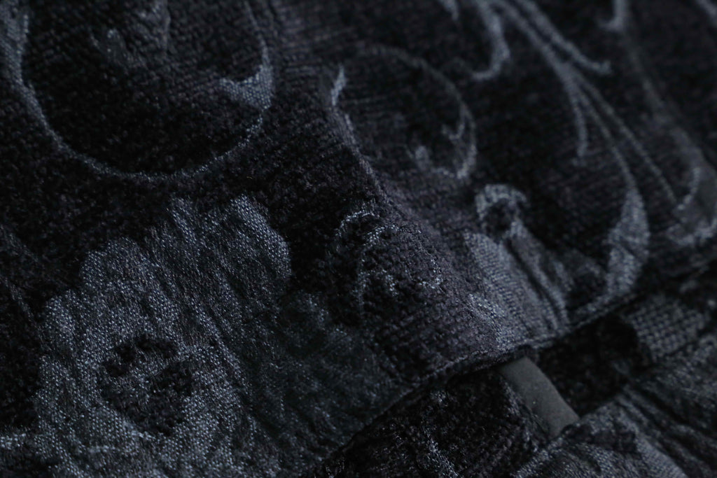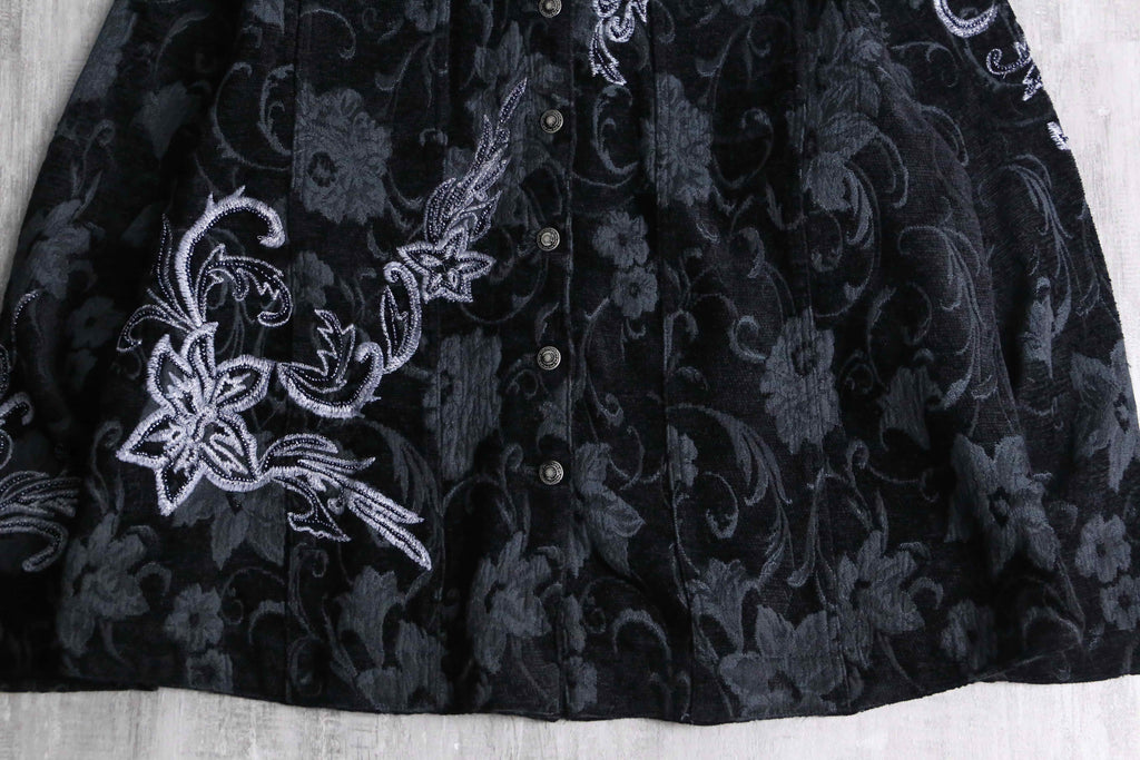 同系色の刺繍が施された生地に対し、前身頃にはワントーン明るい刺繍とビーズのような装飾が加わった、程よくインパクトのあるデザイン。